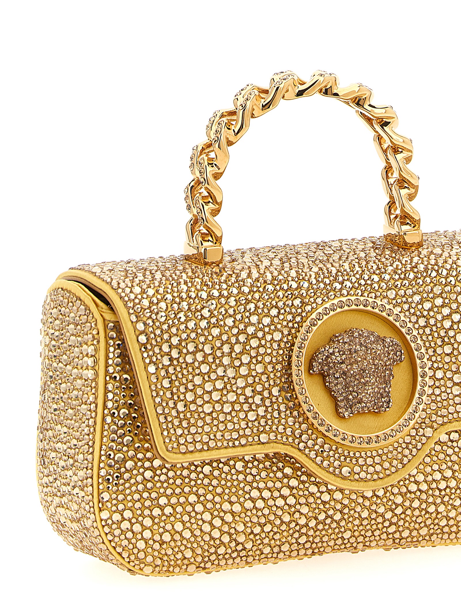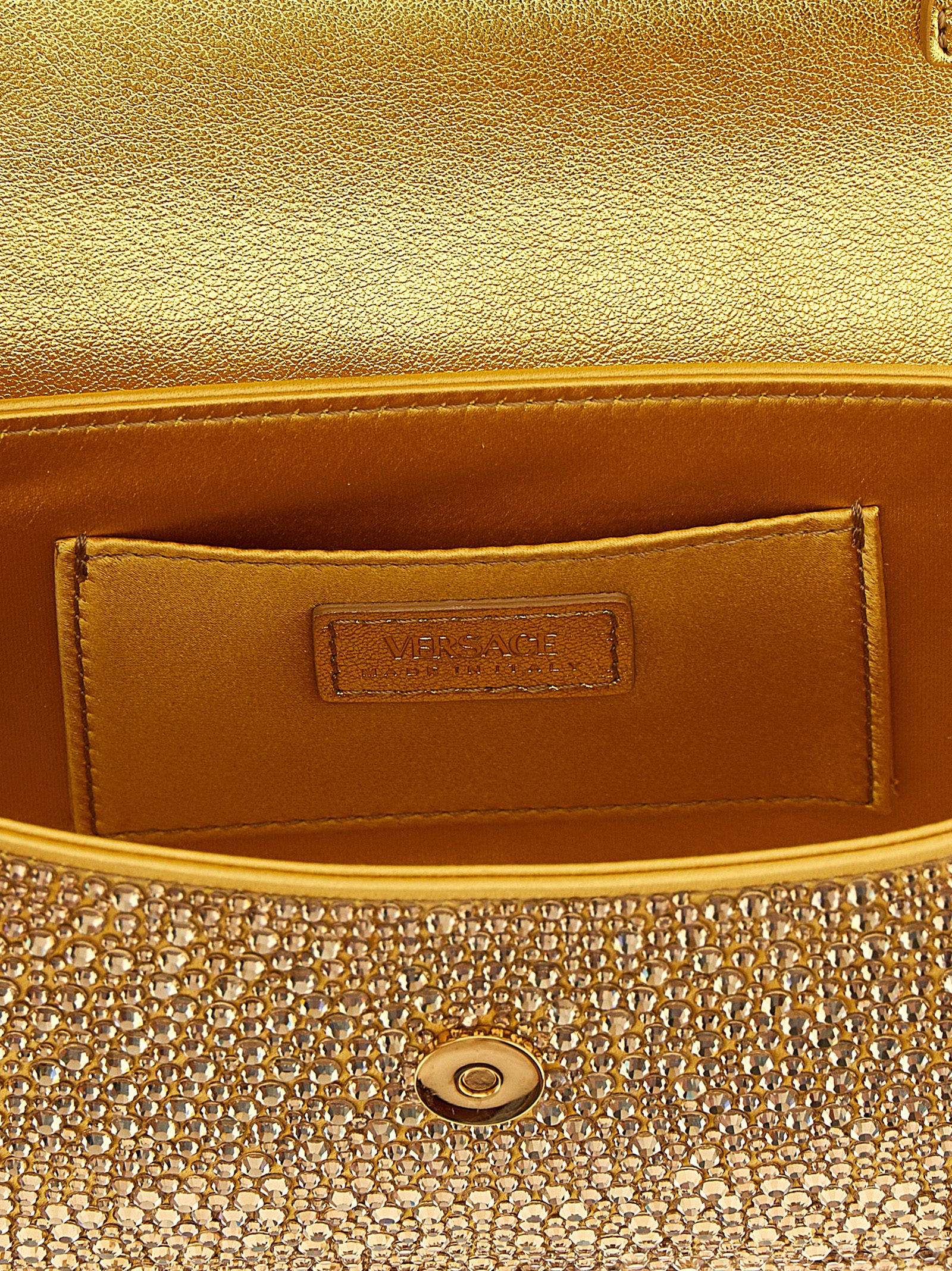 Mini satin handbag lined with nappa leather with all-over crystal appliqué, magnetic flap closure with three-dimensional ‘La Medusa’ emblem, rigid handle with chain structure, and removable chain shoulder strap.