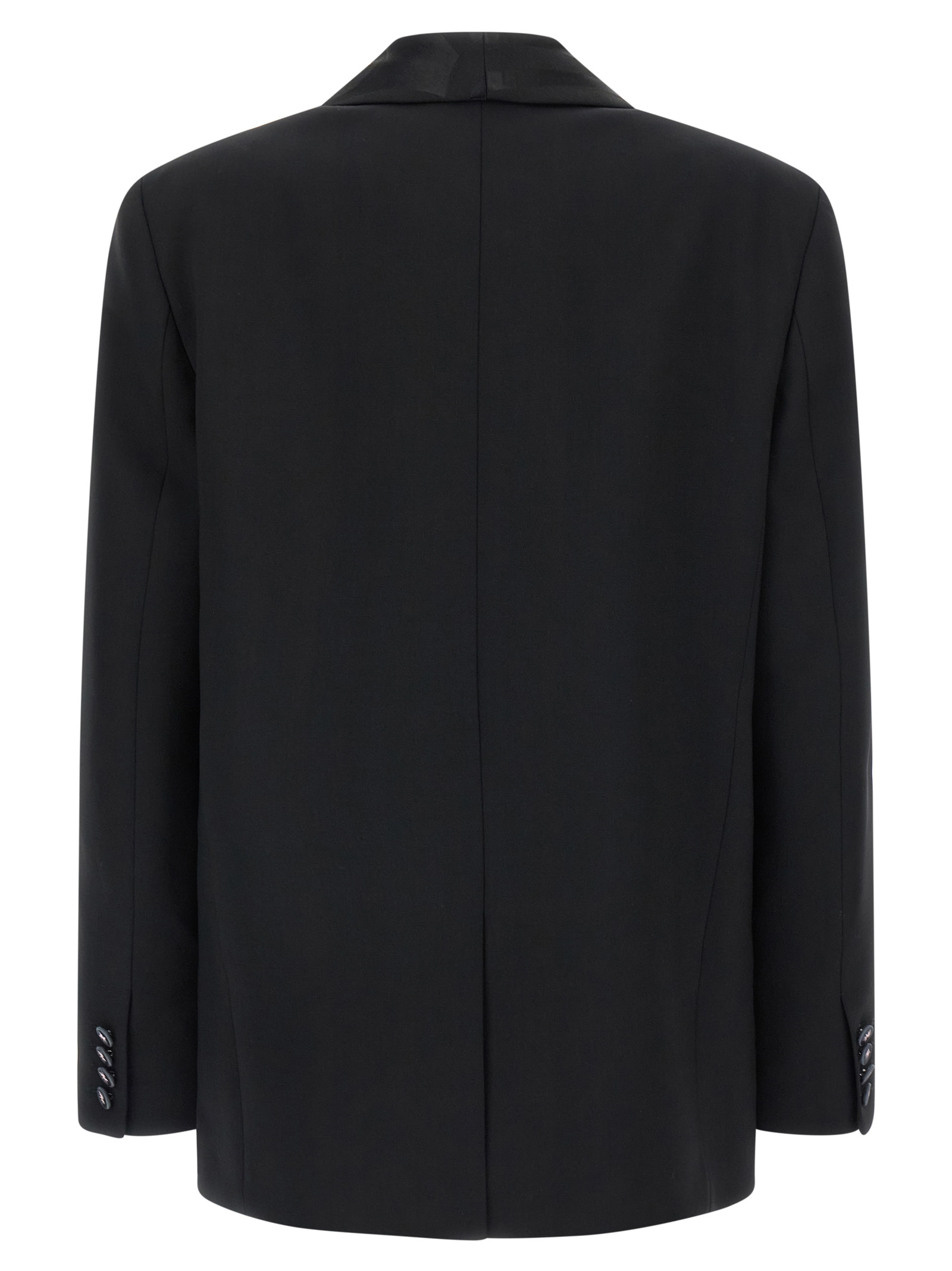 Virgin wool single-breasted blazer with front button closure, shawl collar in viscose, wool and silk with tonal ‘Labirinto’ print, breast pocket, patch pockets, padded shoulder, long sleeves, back split, ‘Labirinto print silk lining’.