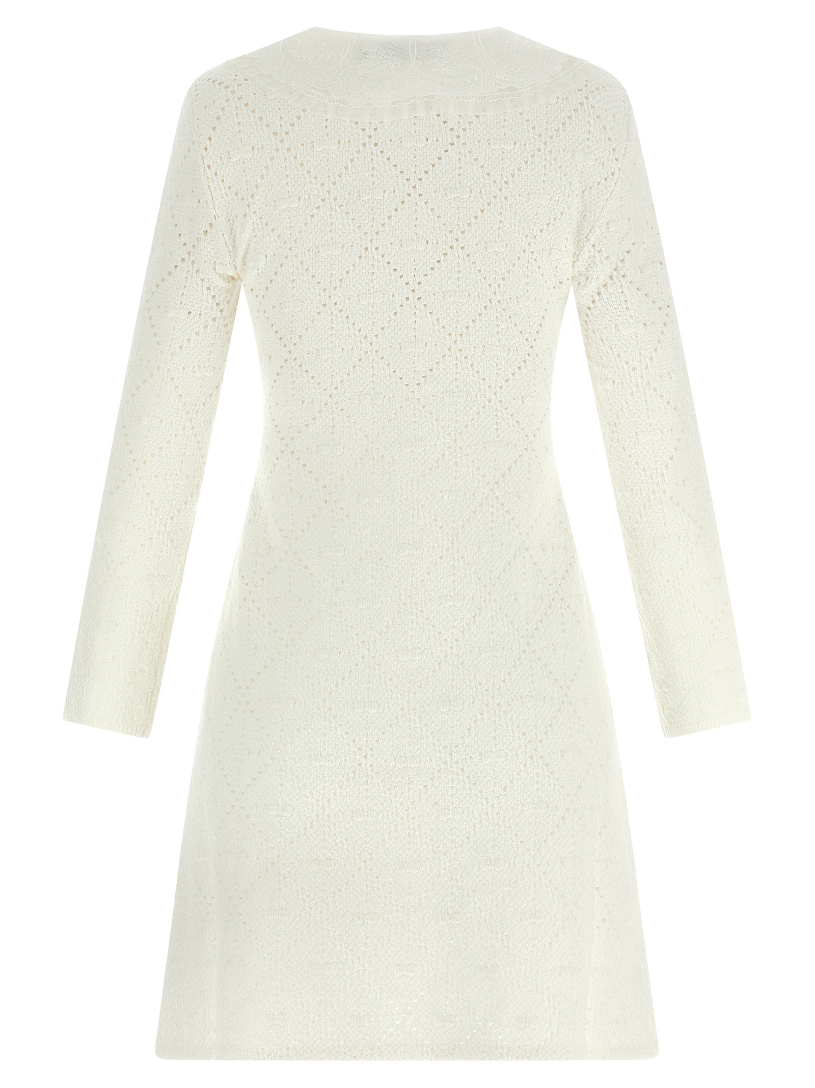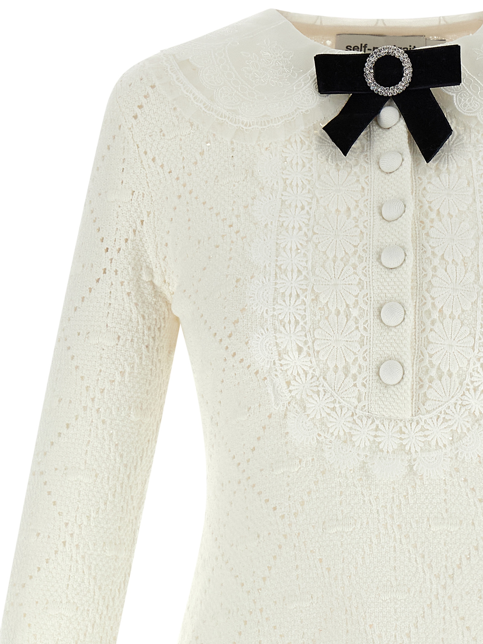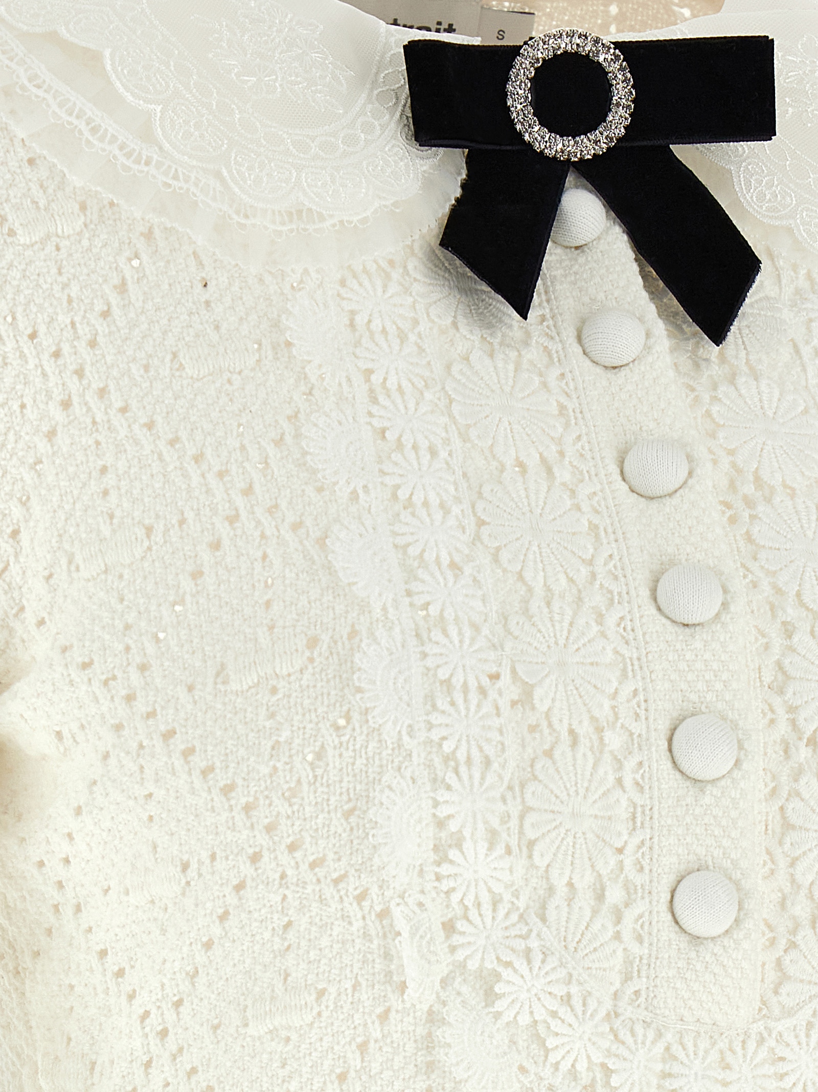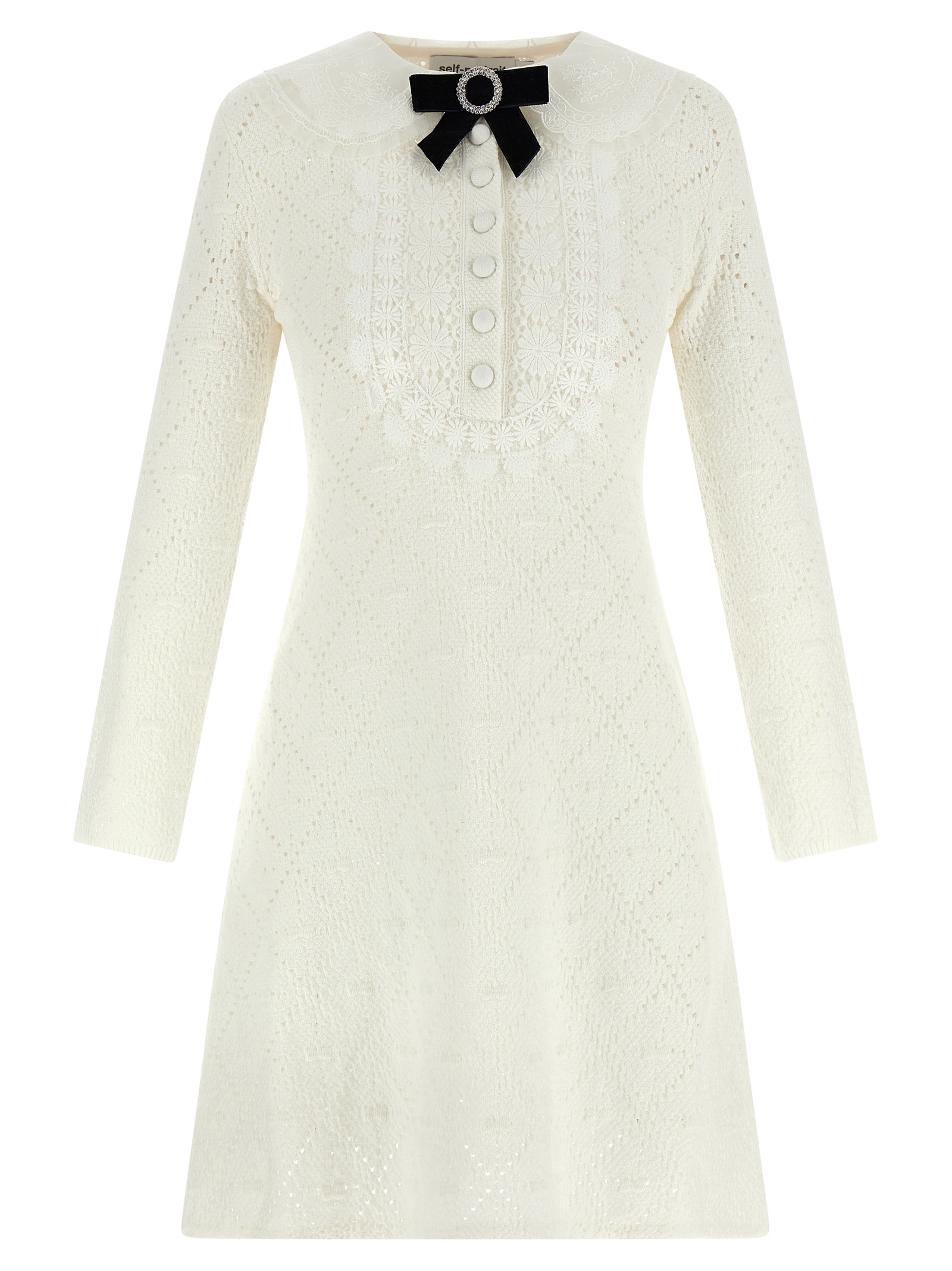 Stretch fabric mini dress with openwork pattern, embroidered lace plywood collar, front buttons and removable bow brooch, and 3/4 sleeves.