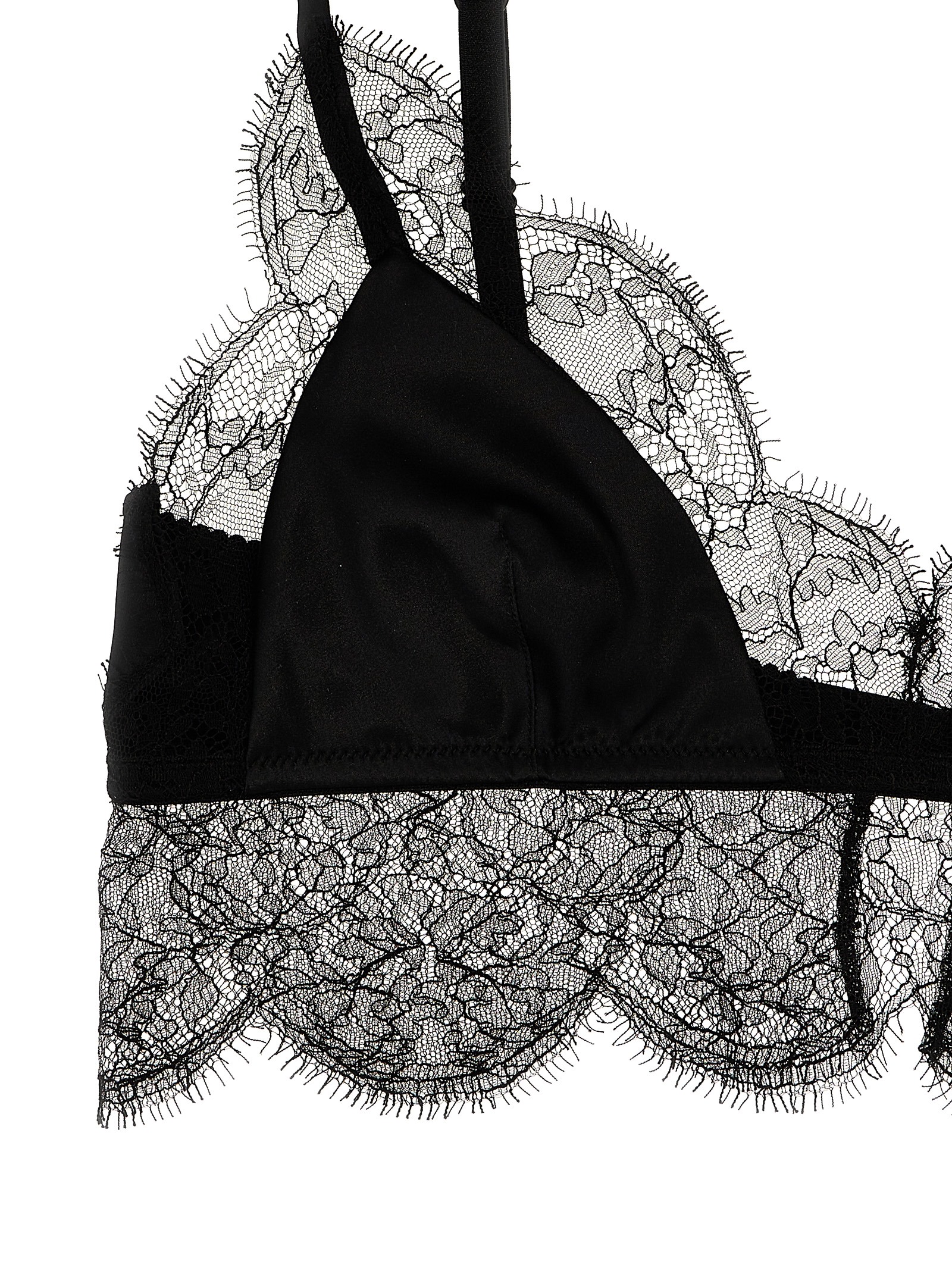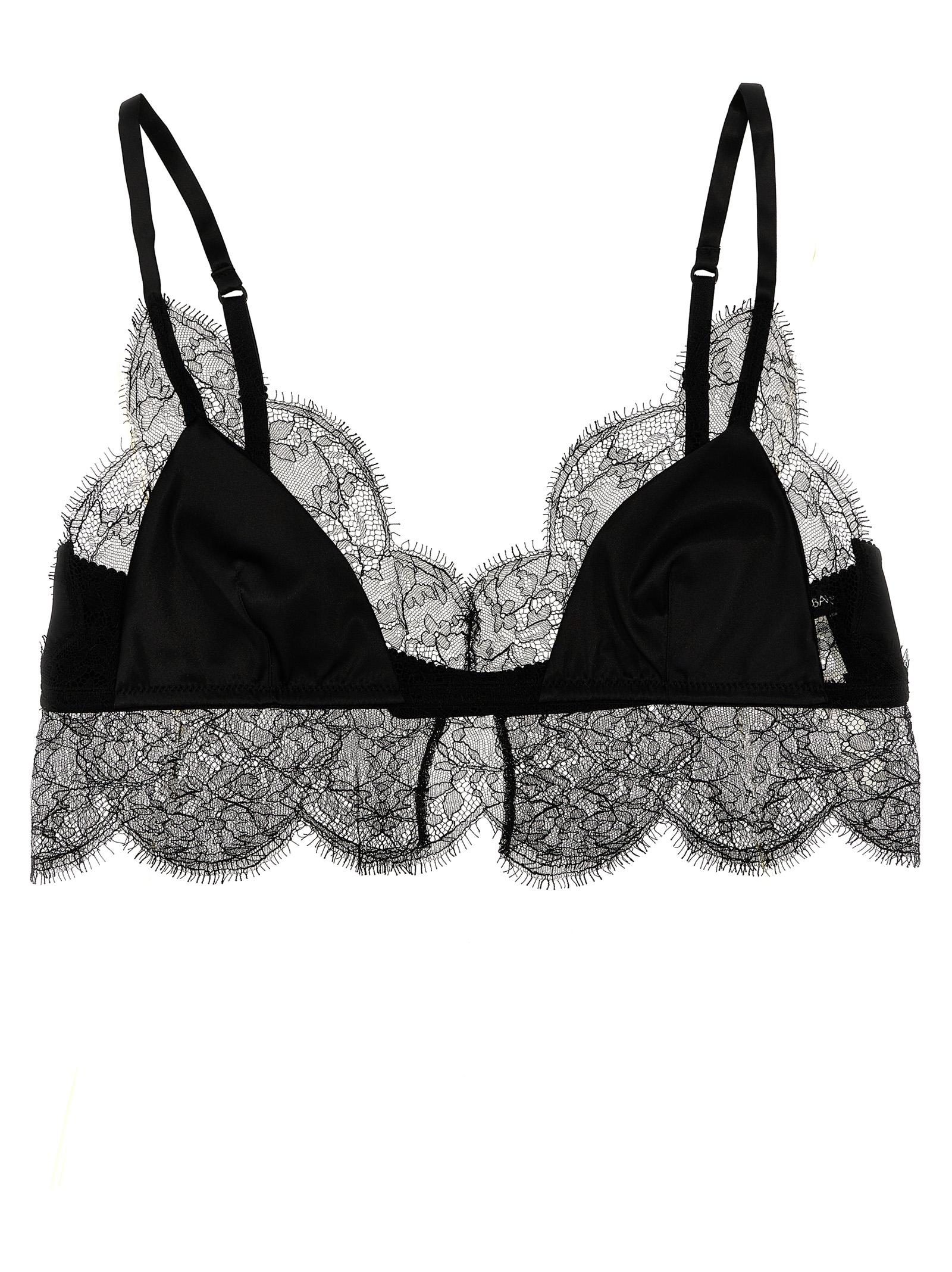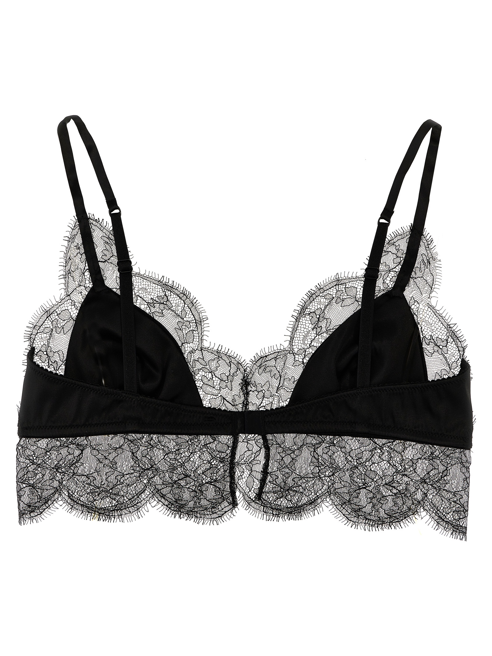 Satin and lace bra, adjustable shoulder straps, and back closure with hooks.