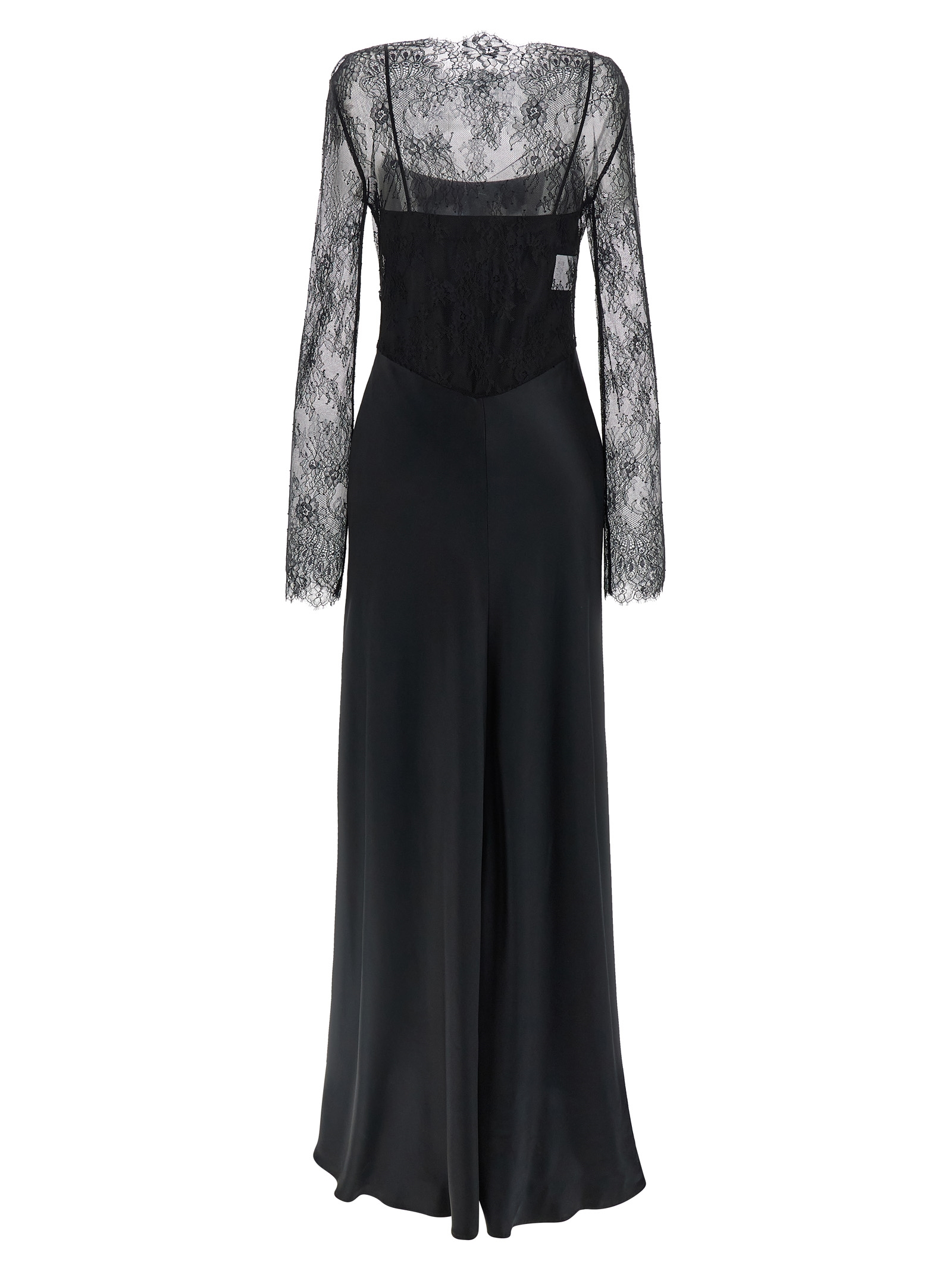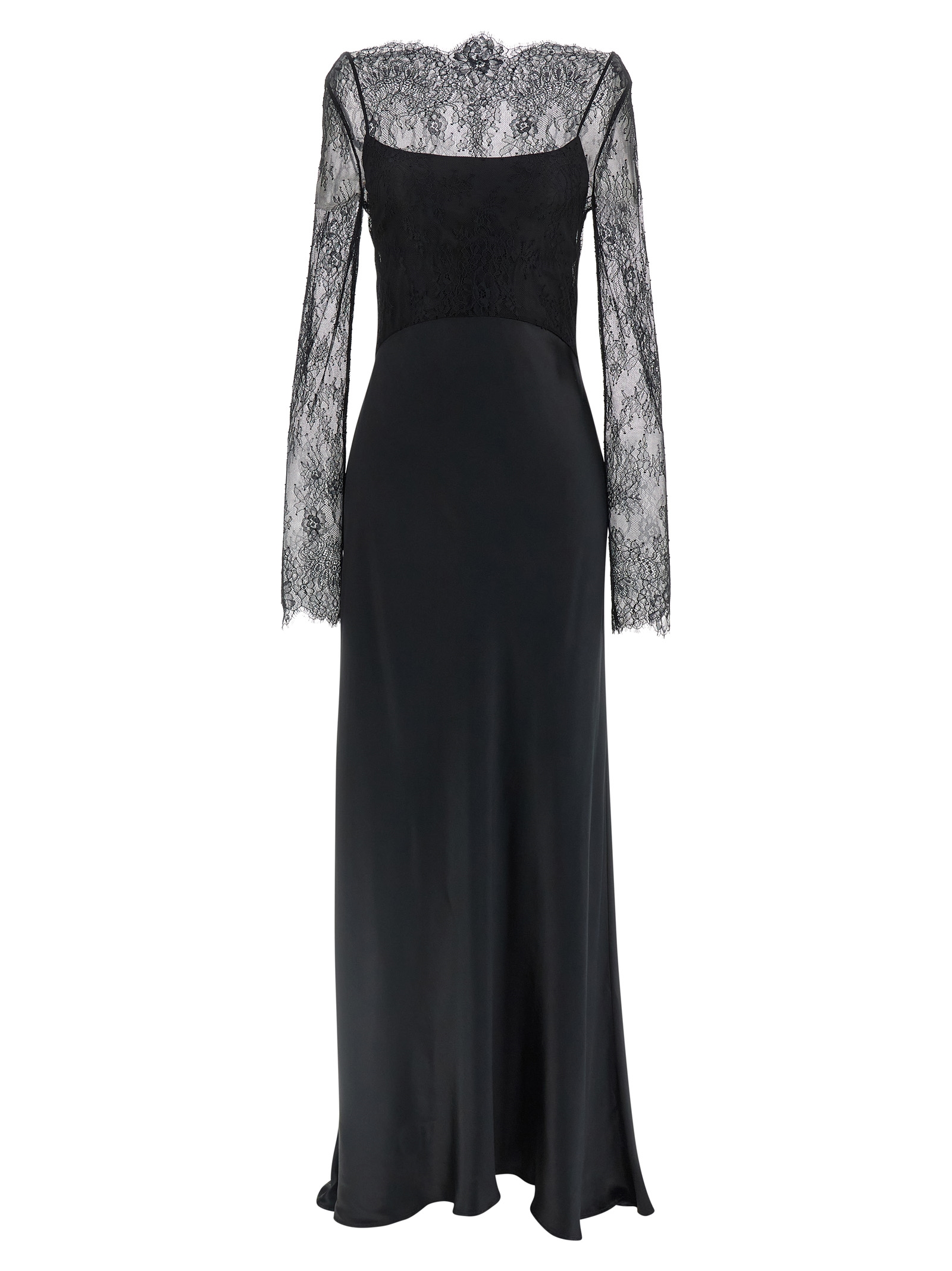 Slip shiny satin dress, semi-transparent lace top with long sleeves with boat neck, and back zip closure.