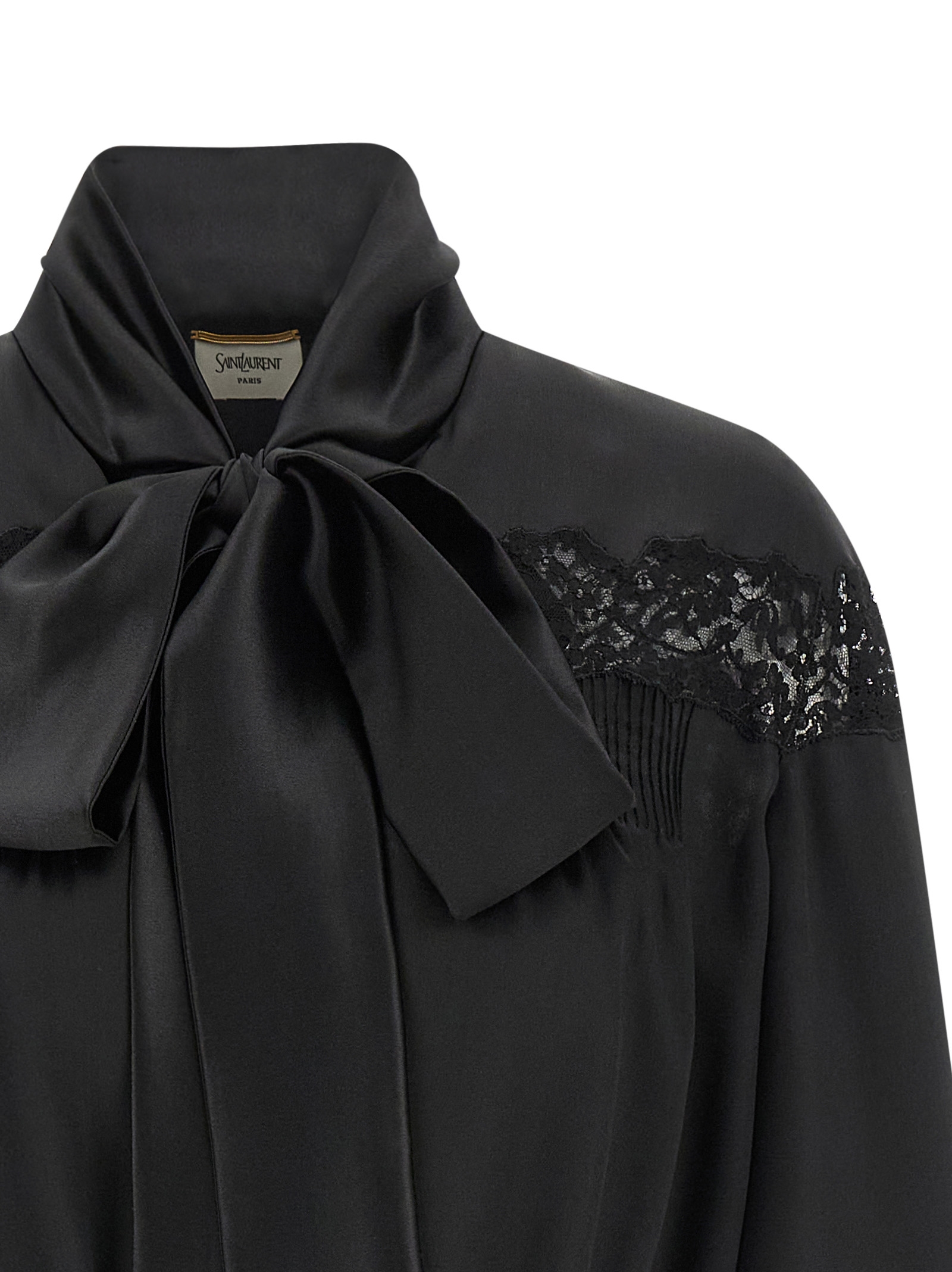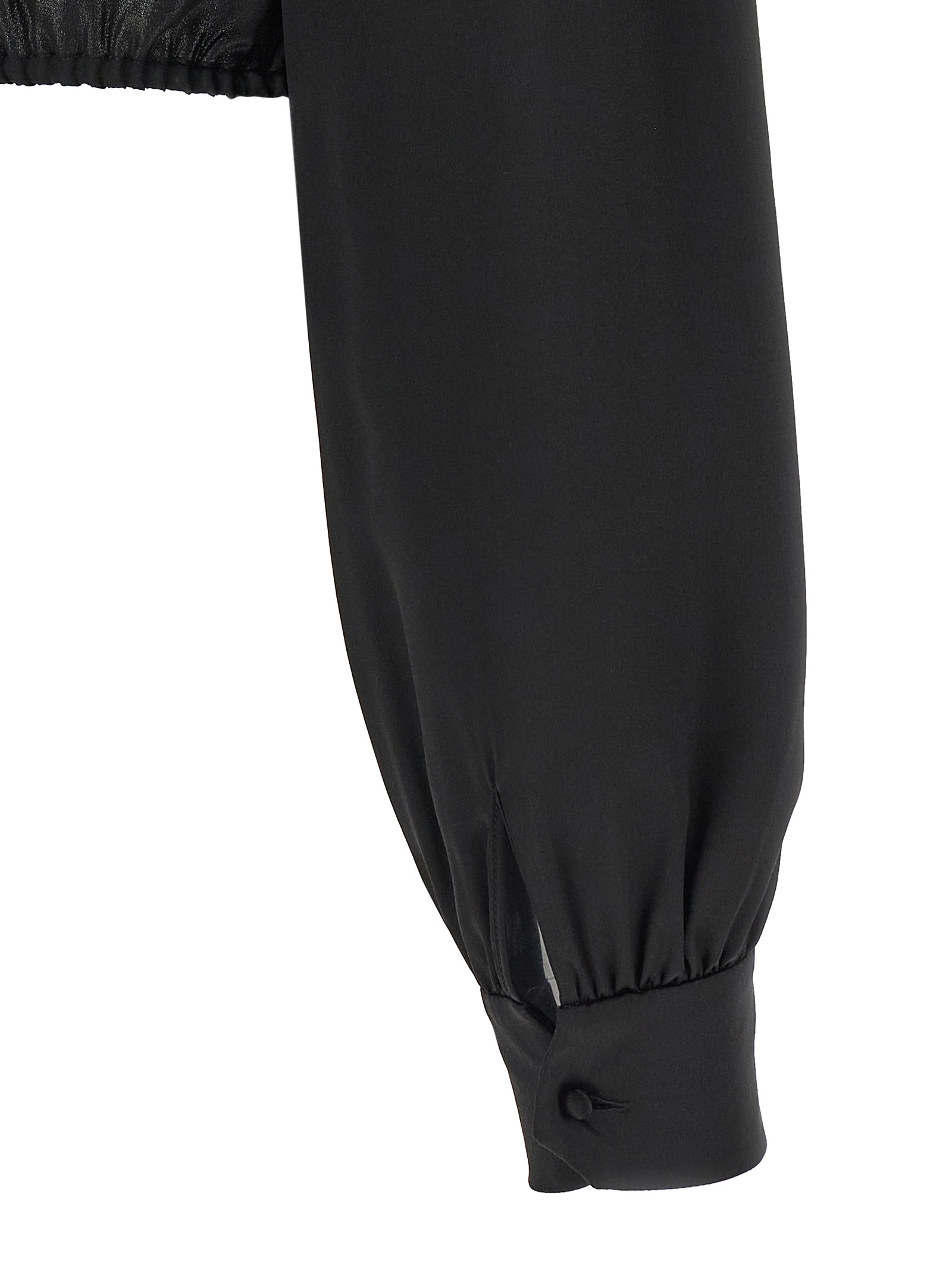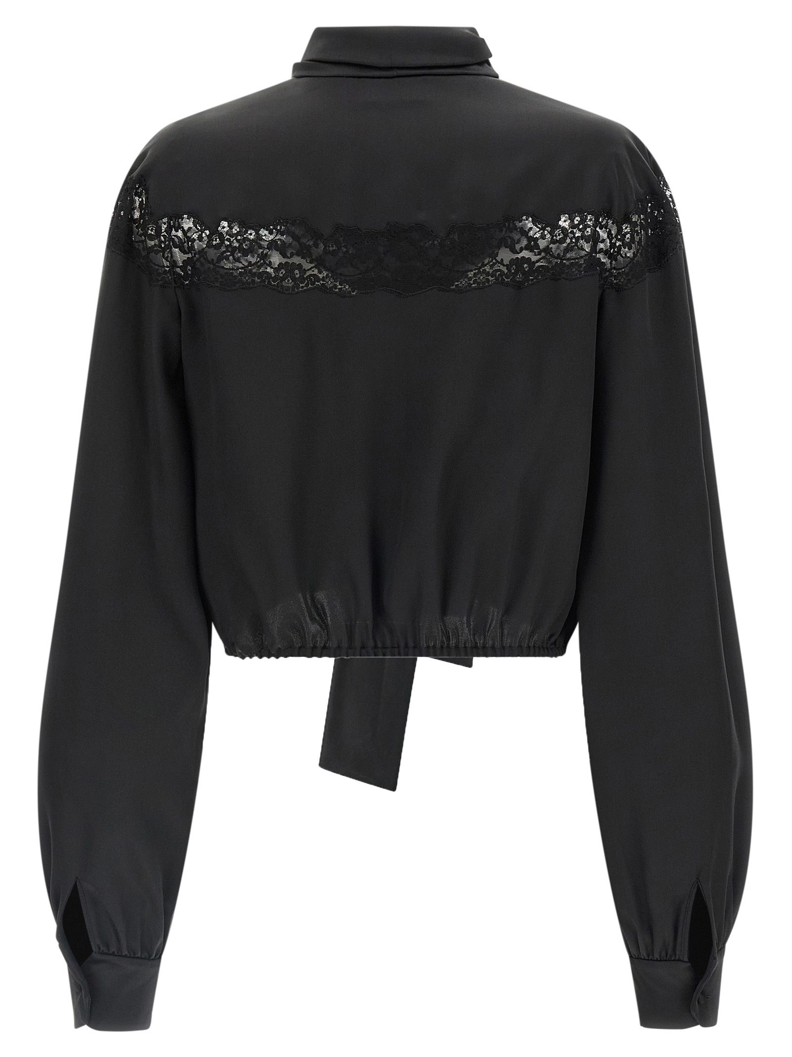 Silk shirt with tone-on-tone lace inserts, crop model, lavallière collar, button closure and clamp to create front curls, long sleeves with cuffs, elastic on the hem.