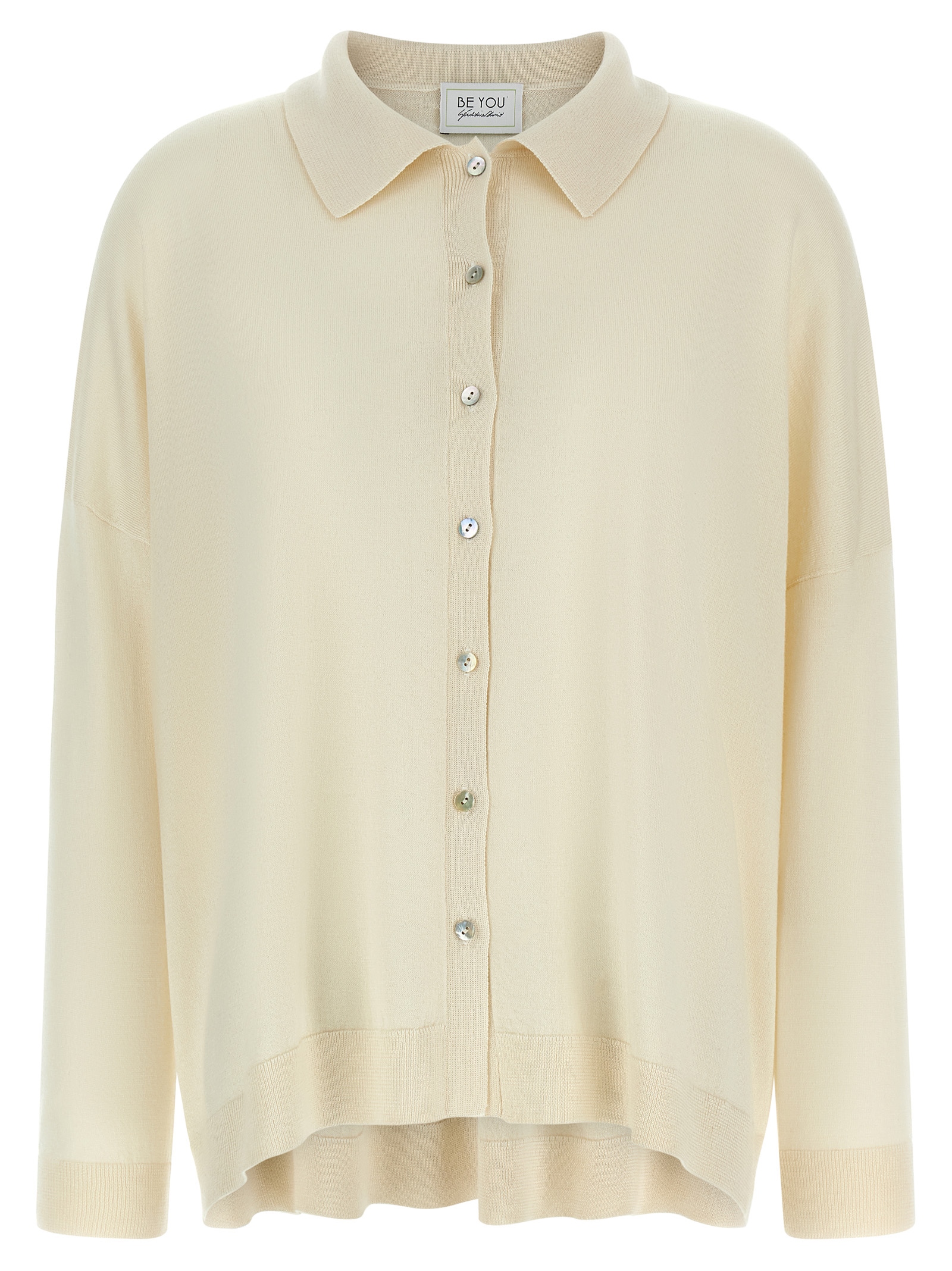 ‘Lady17’ cashmere and silk blend cardigan with shirt collar, front mother-of-pearl button closure, long cuffed sleeves, side slits.