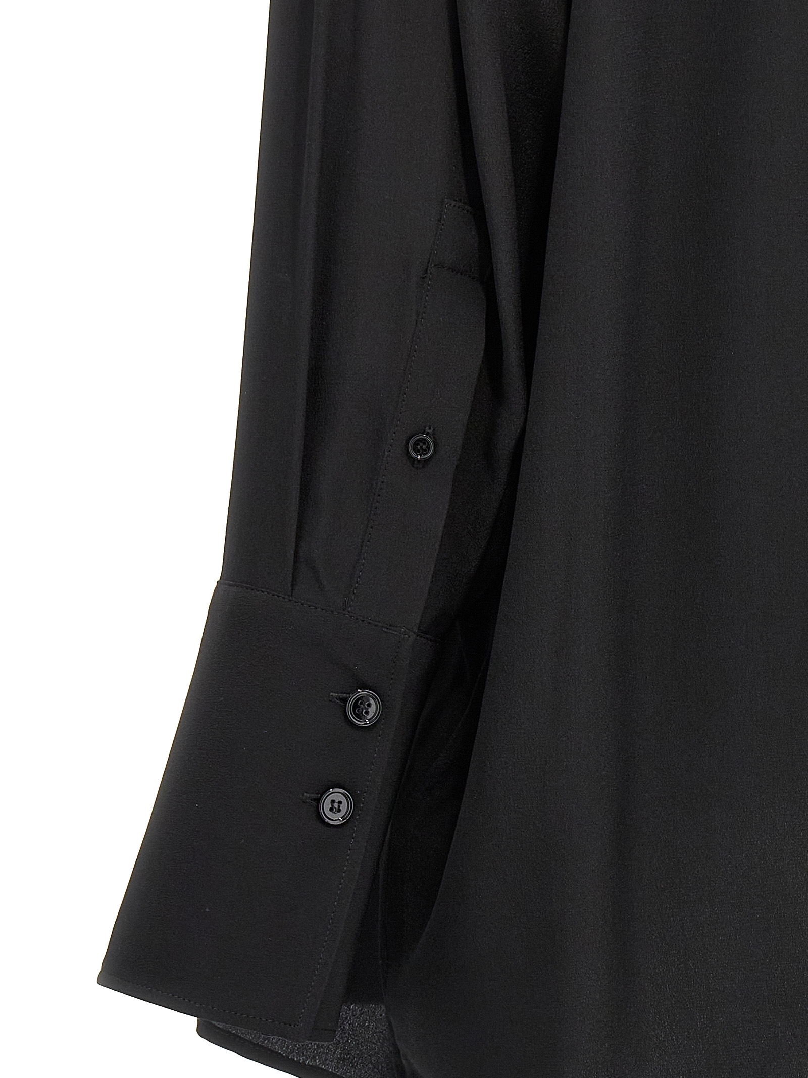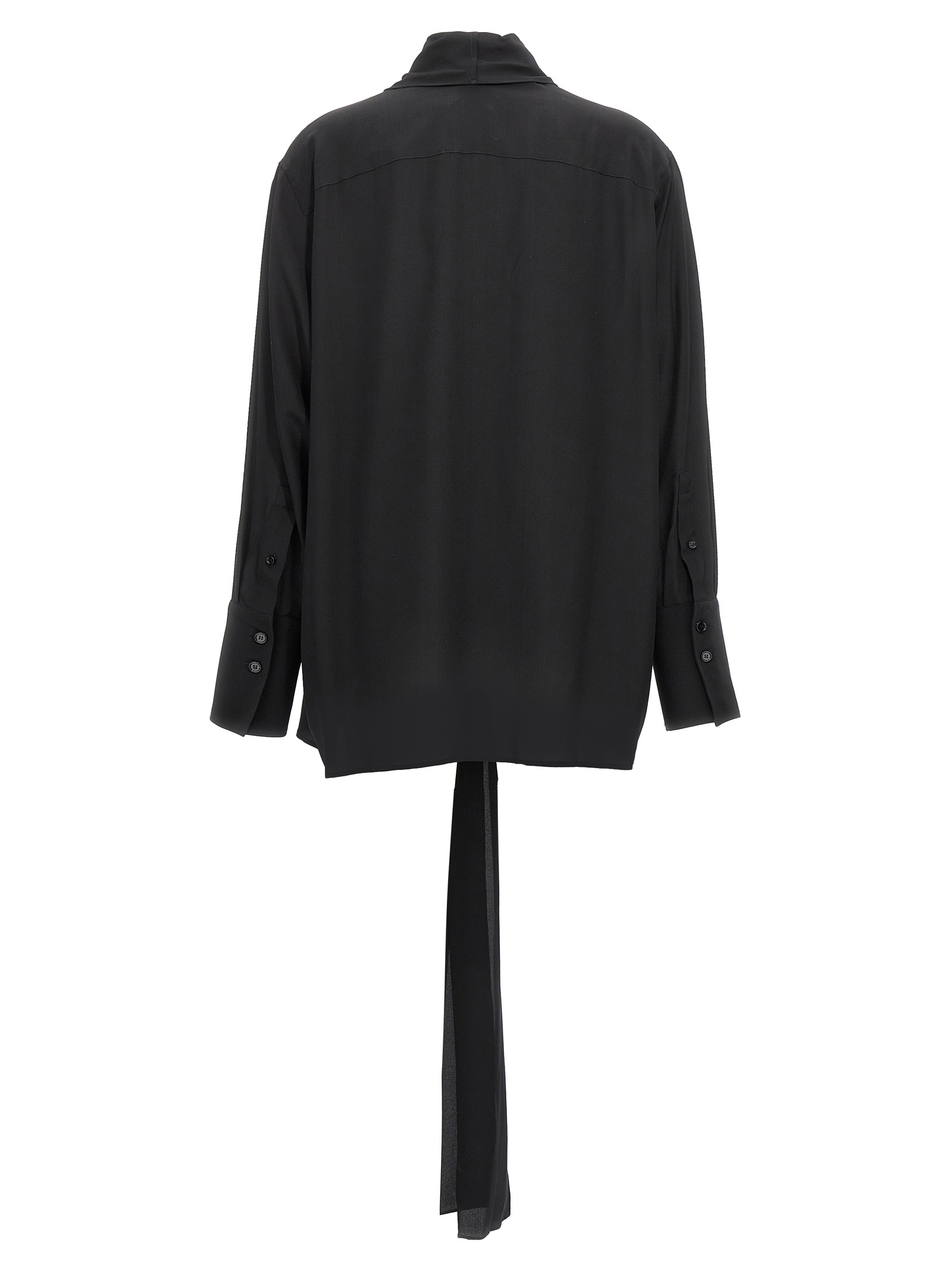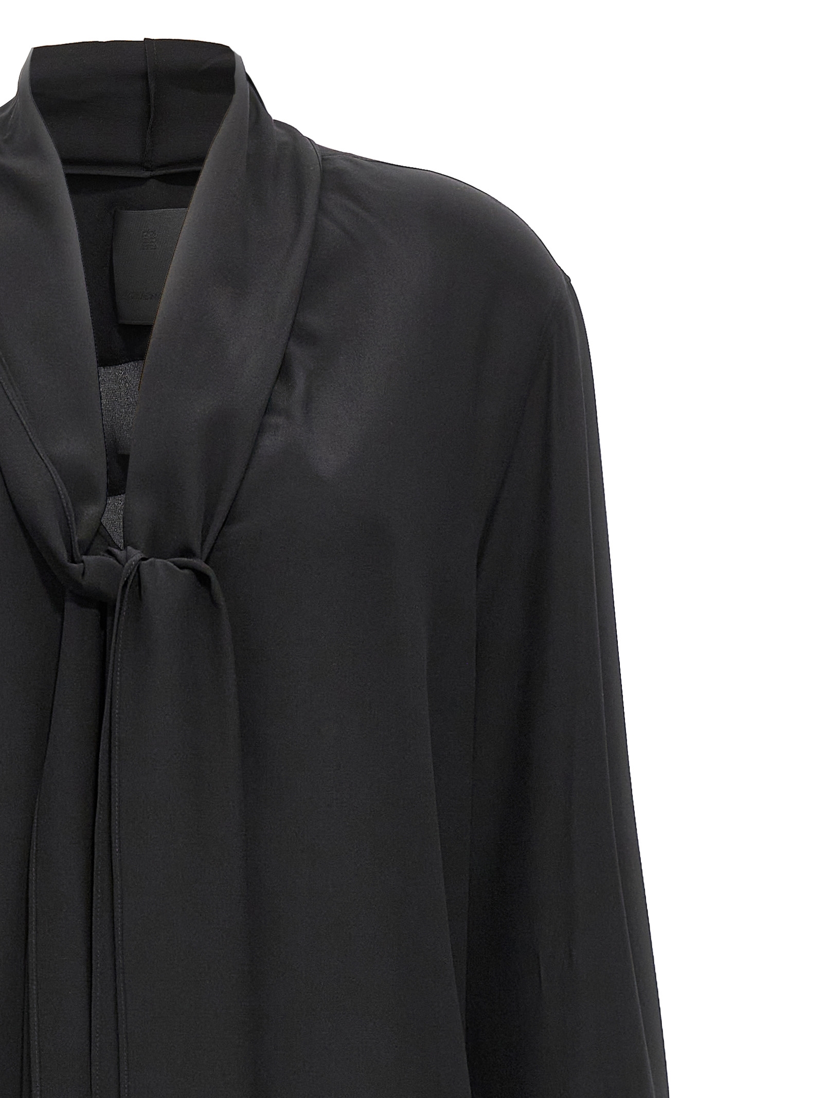 Silk crêpe de Chine shirt with lavallière collar, deep V-neck, long cuffed sleeves.