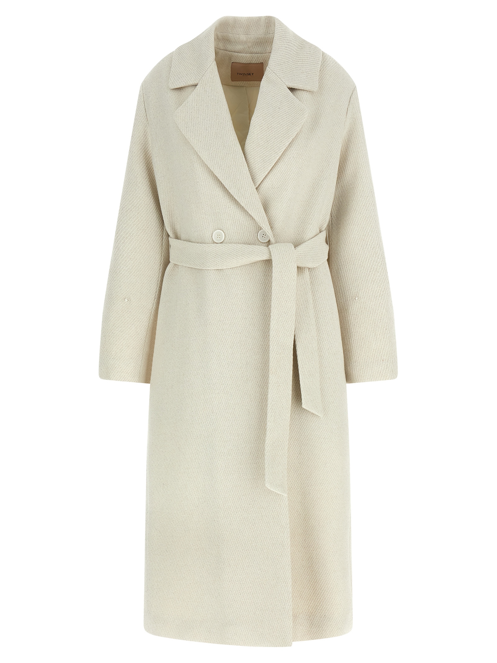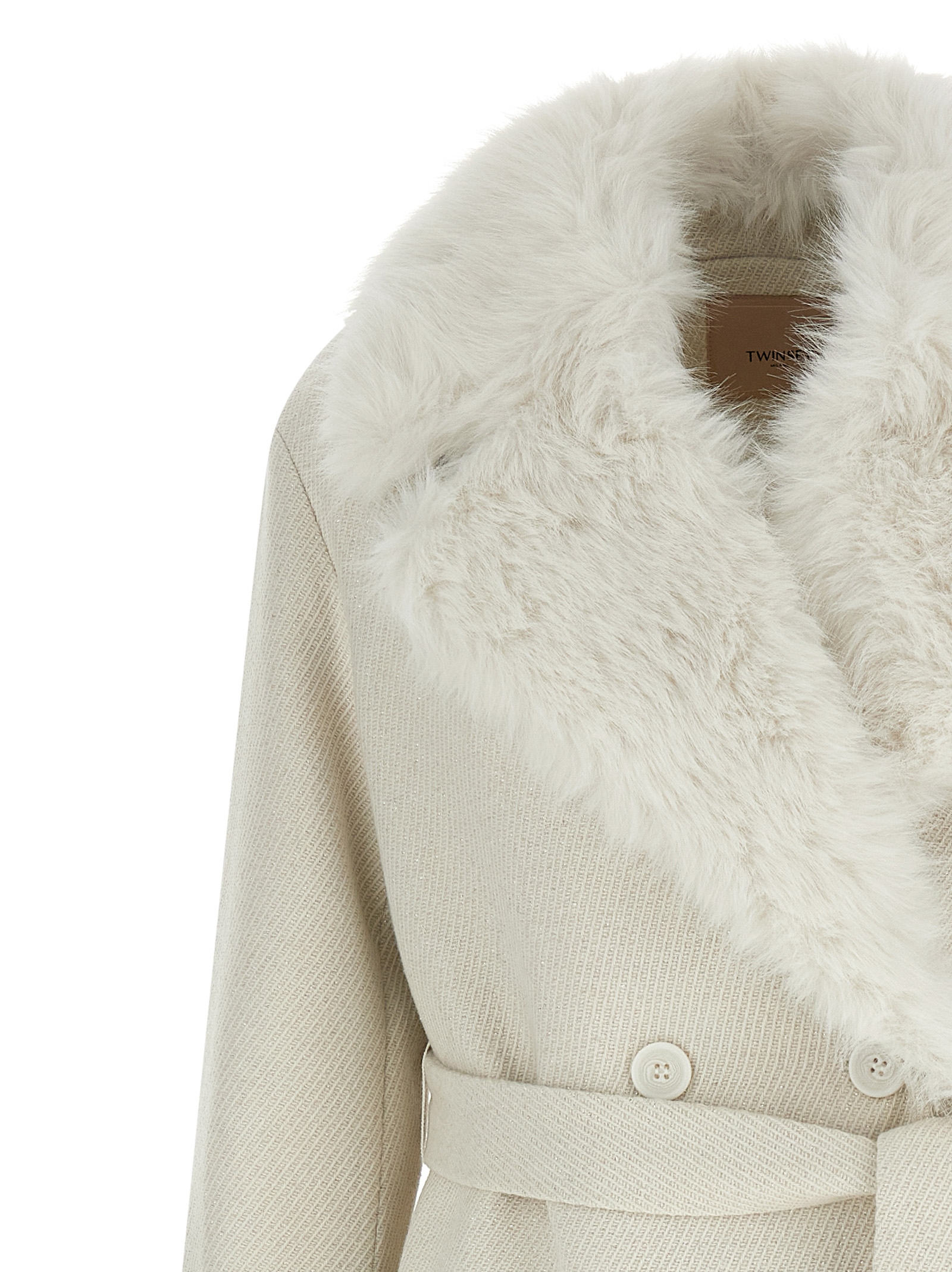 Double-breasted woven fabric coat with lamé thread with front button closure, lapel collar with removable fur-effect fabric insert, welt pockets, long sleeves with removable fur-effect fabric insert, metal logo tag and back split, quilted nylon lining, removable belt.