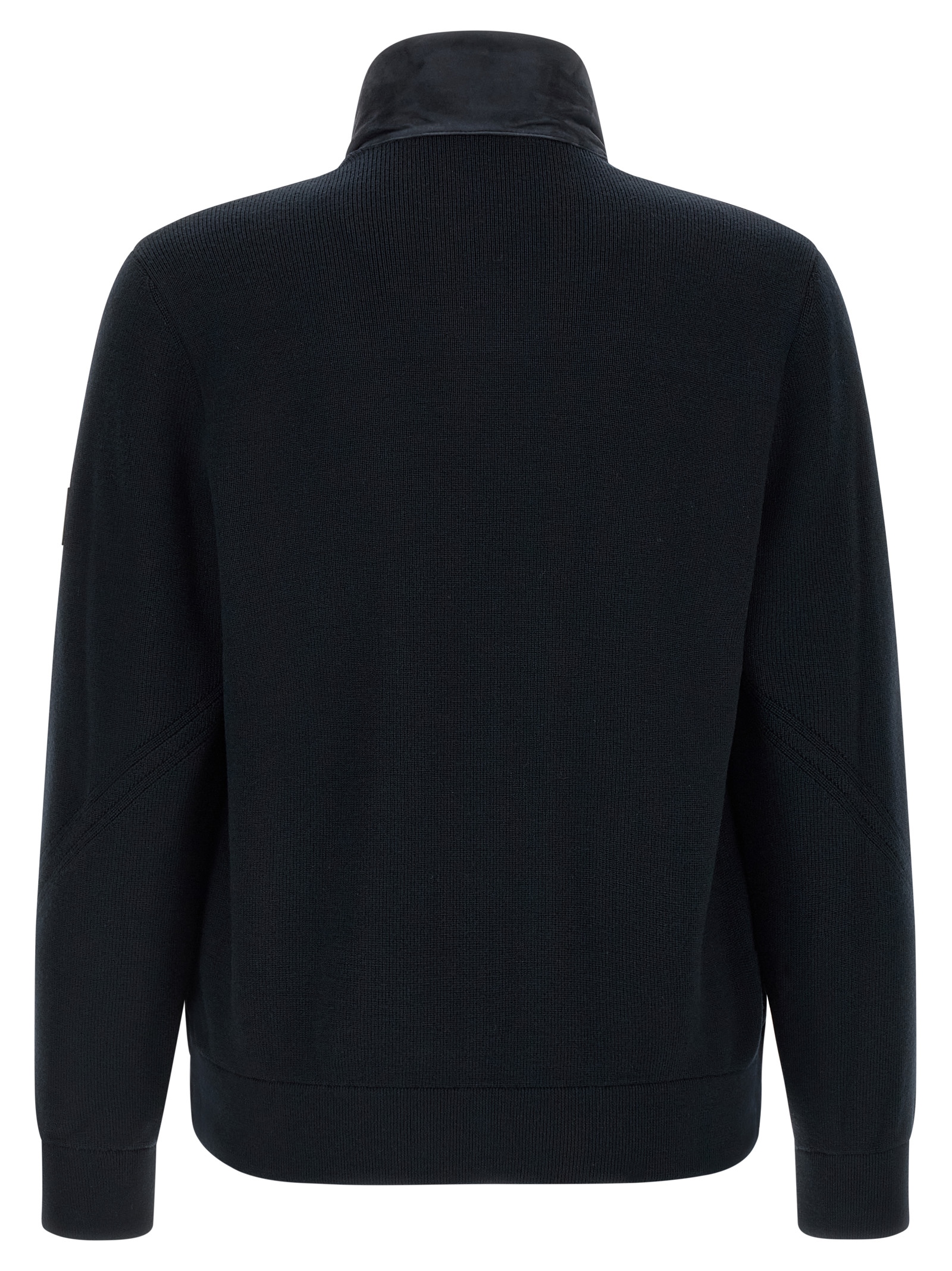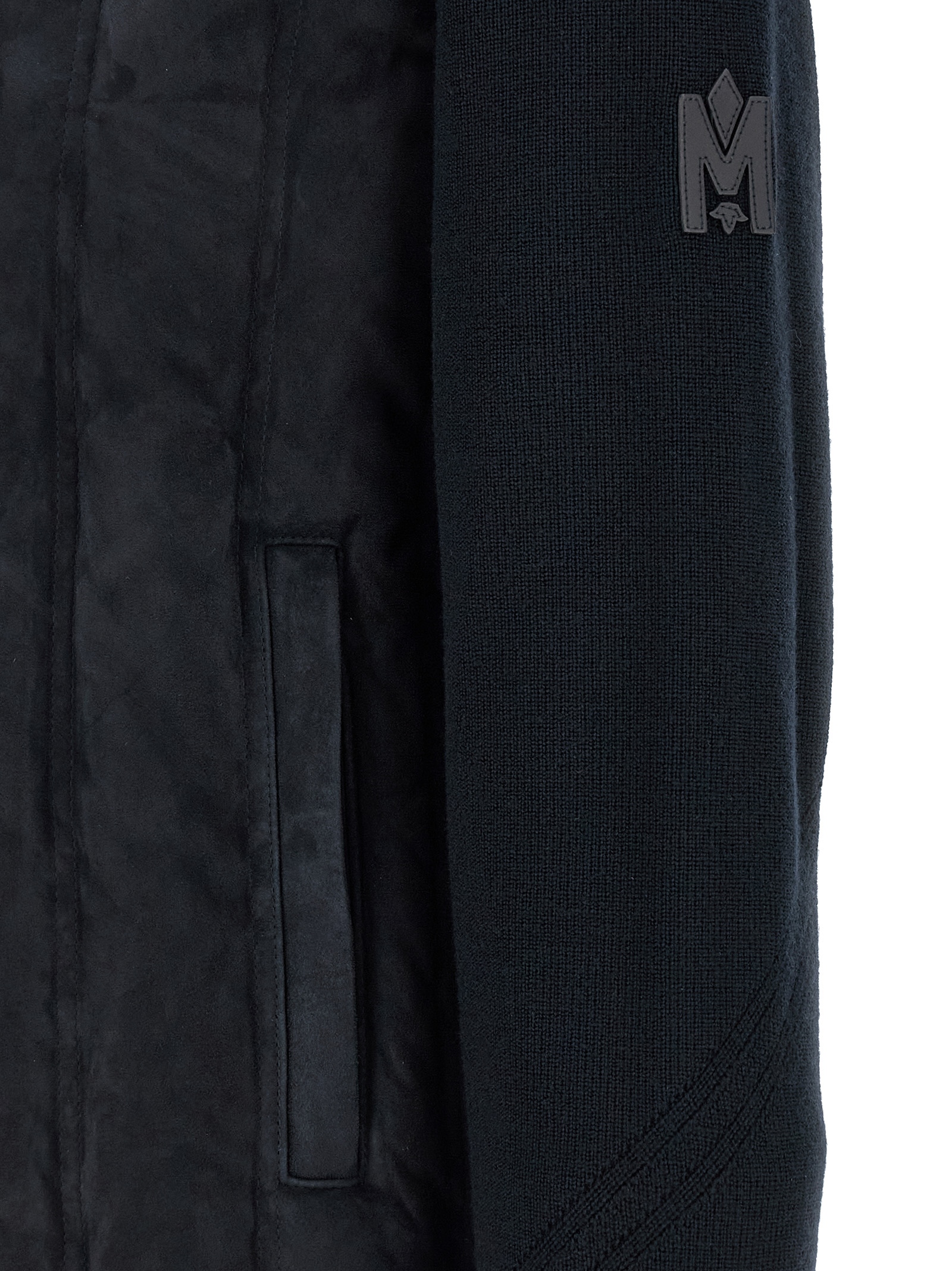 Landen’ knitted virgin wool jacket with quilted and padded suede front, standing collar, double layer wool front insert, zip closure, pockets, long cuffed sleeves and a tone-on-tone logo patch appliqué.