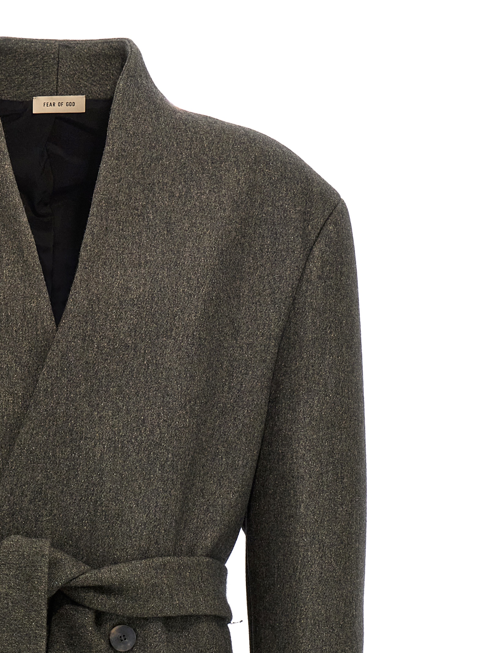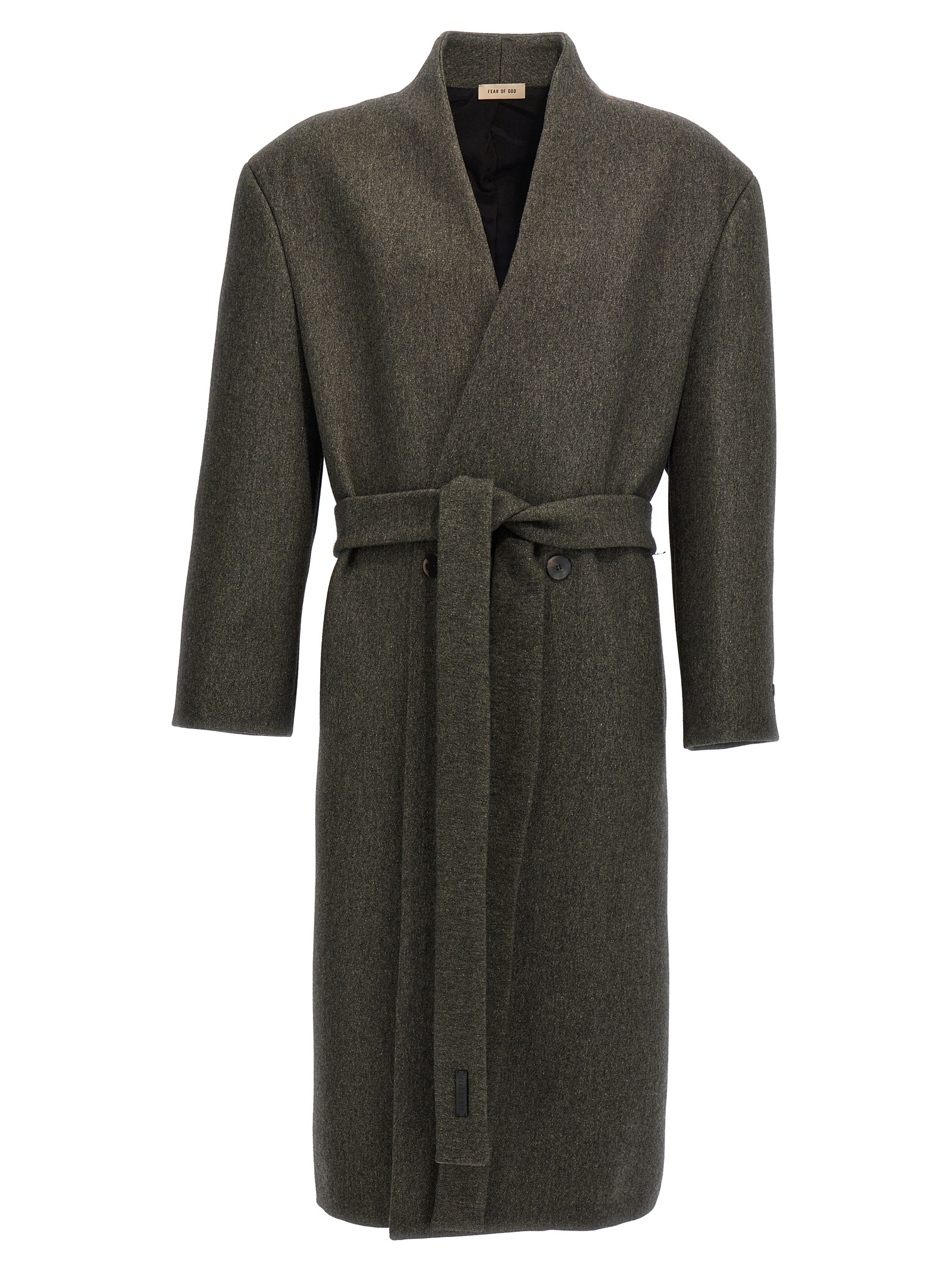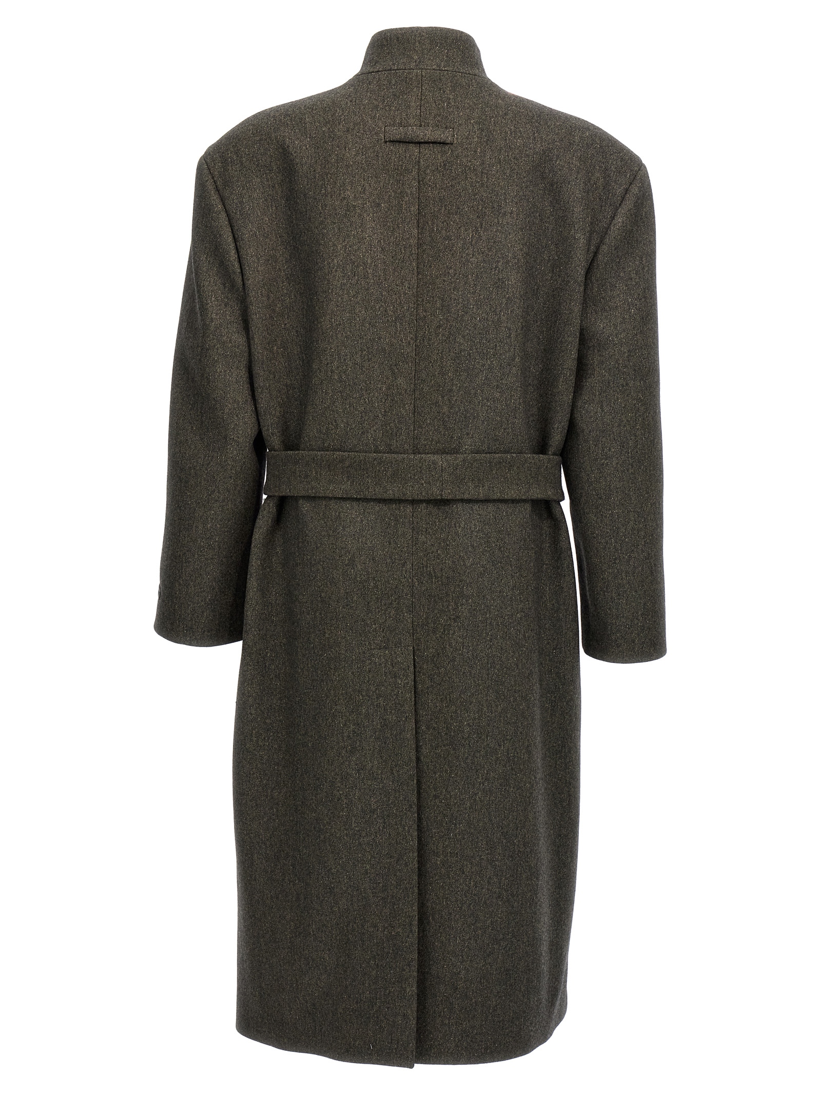 ‘Lapelless’ double-breasted wool blend coat with button closure, matching belt to tie at the waist, pockets, structured shoulder straps, long sleeves, back vent.