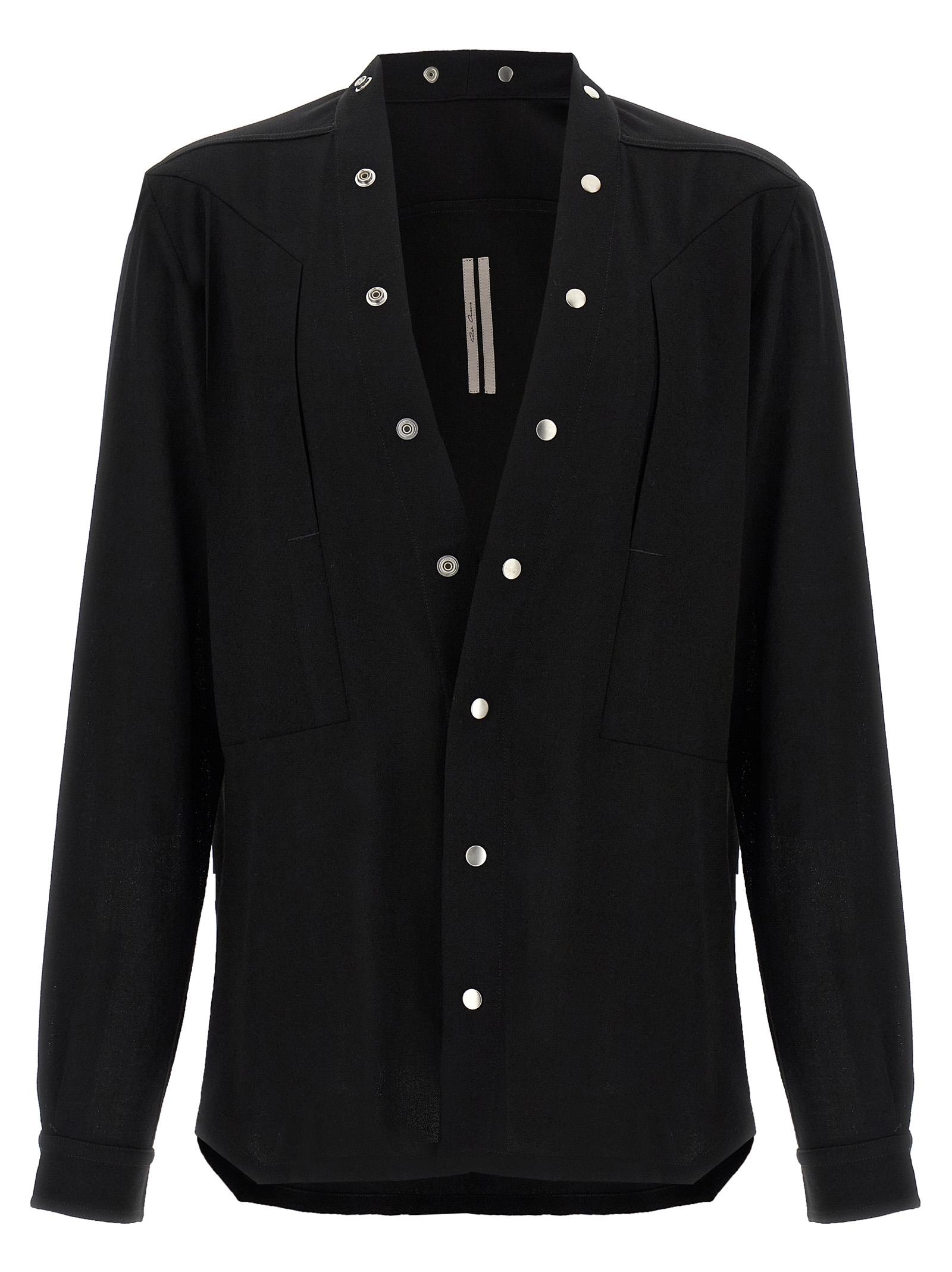 ‘Larry Fogpocket’ medium weight wool shirt woven with high twist frizzy yarns, front snap button closure, V-neck, pockets, long cuffed sleeves.