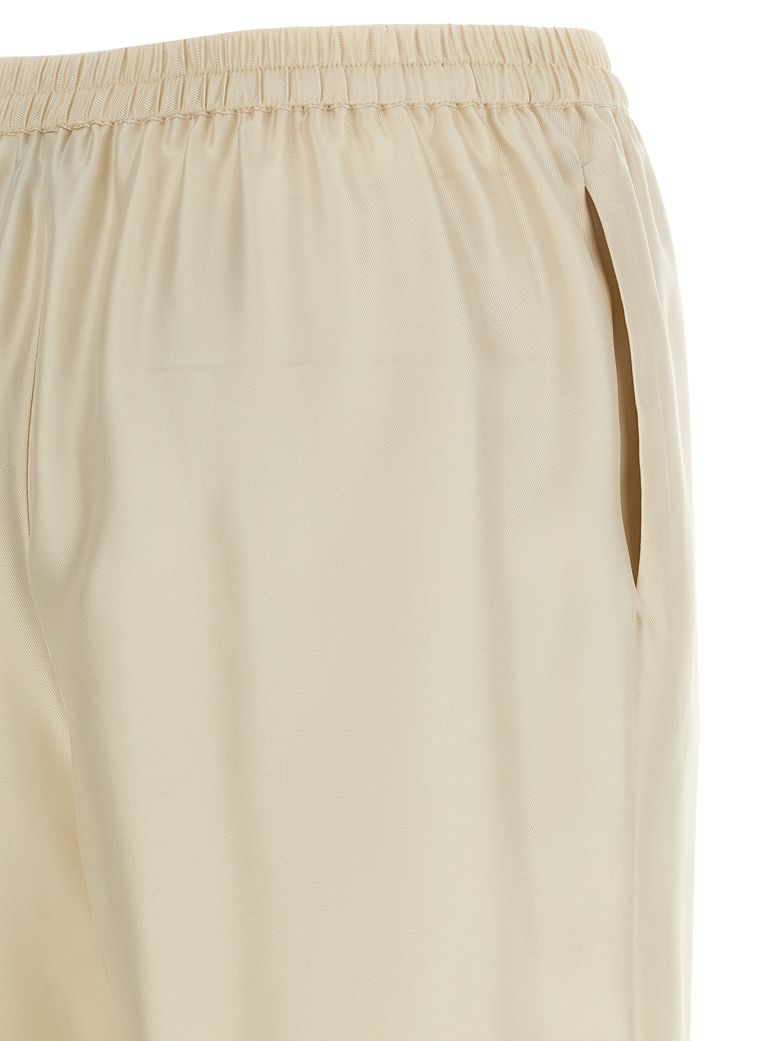 ‘Lars’ silk twill pants with lace stitch insert on the front, wide and straight leg, medium waist, elastic waistband, pockets.