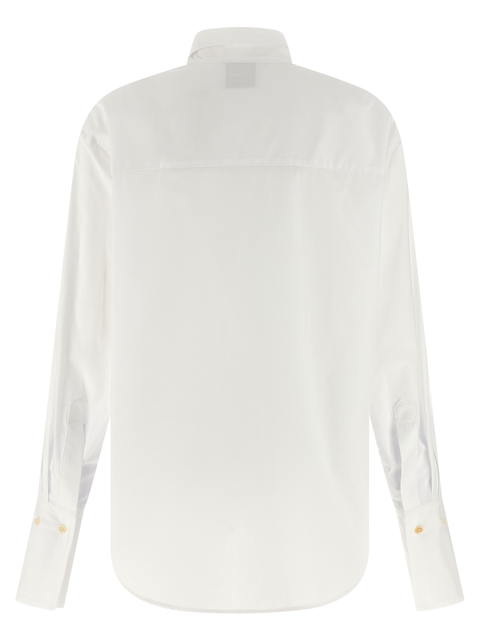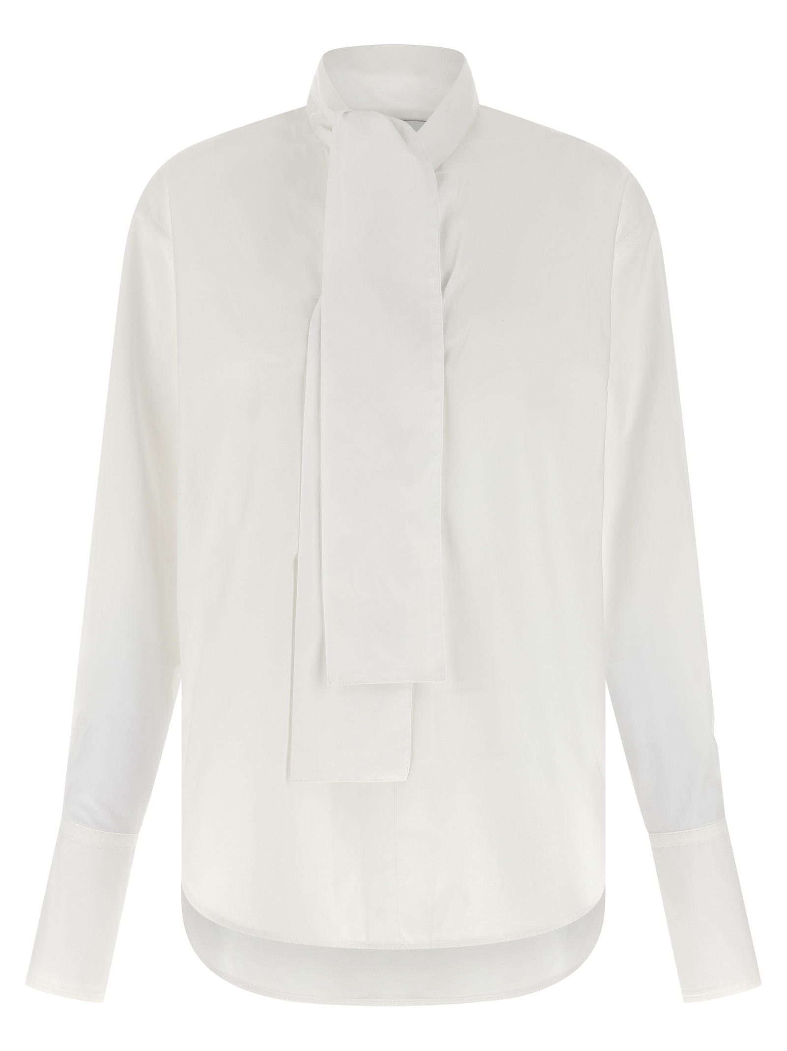 Cotton poplin shirt, lavallière collar with tie sash and V-neck, long sleeves with maxi cuffs, side slits, and asymmetrical hem.