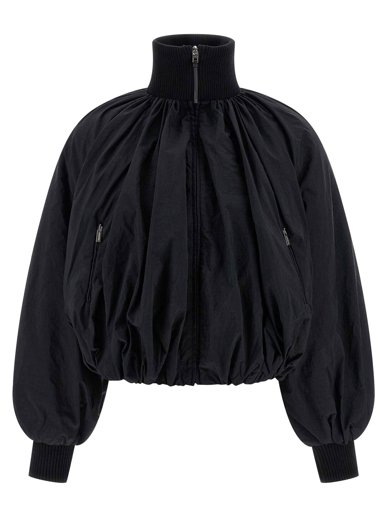 Lightweight, matte nylon ‘Le Bomber Pallone’ bomber jacket with front and back draping and stretch ribbed knit details, padded cotton blend lining, high neck, front zip closure, pockets, long wide puff sleeves with cuffs.