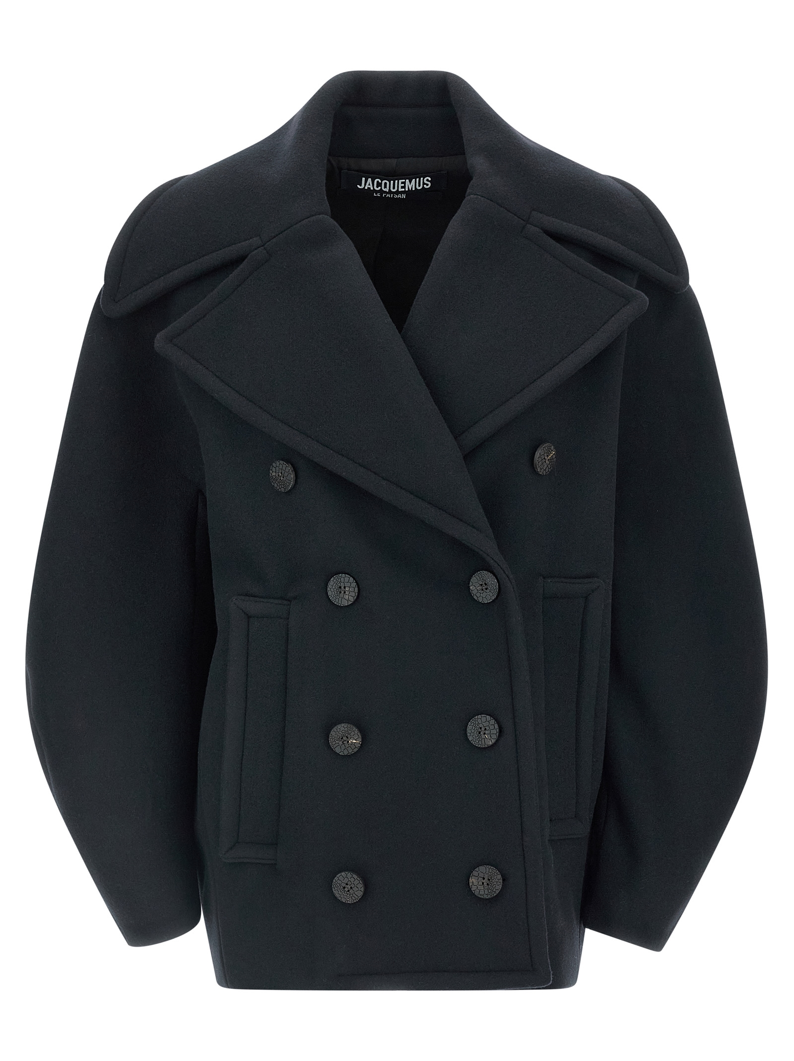 Le Caban Ovalo’ virgin wool coat with viscose and cotton blend lining, double-breasted style with front button closure, round top cut, pockets, long curved sleeves with dropped shoulders, back gussets.