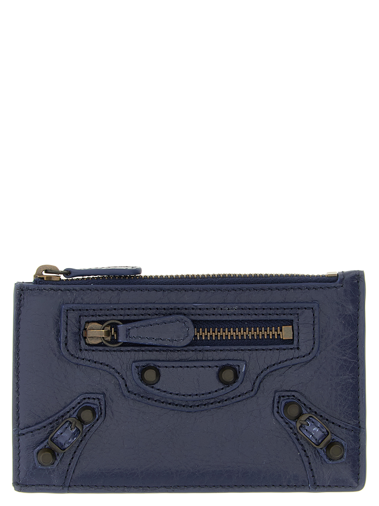 Arena ‘Le City Lungo’ lambskin card holder with brass finish metal studs, front zip pocket, top zip closure, back pockets.