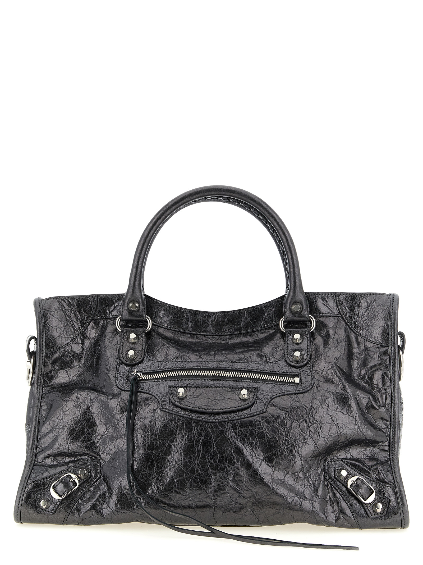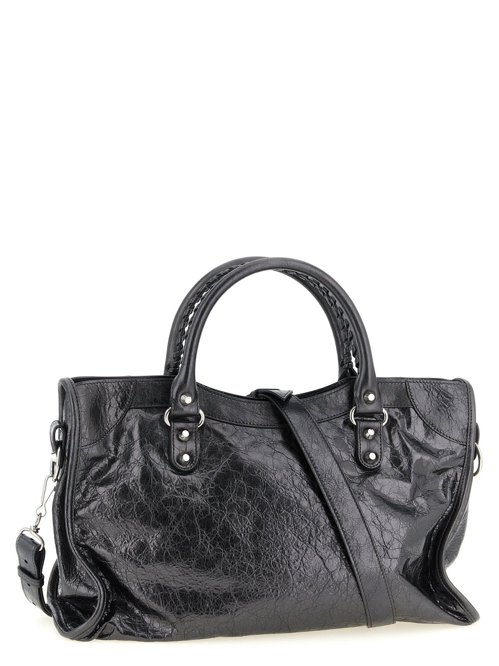 Arena metallic lambskin Le City M handbag with shiny silver studs, double fixed handle, top zip closure, front zip pocket, cotton canvas lining, adjustable and removable shoulder strap.