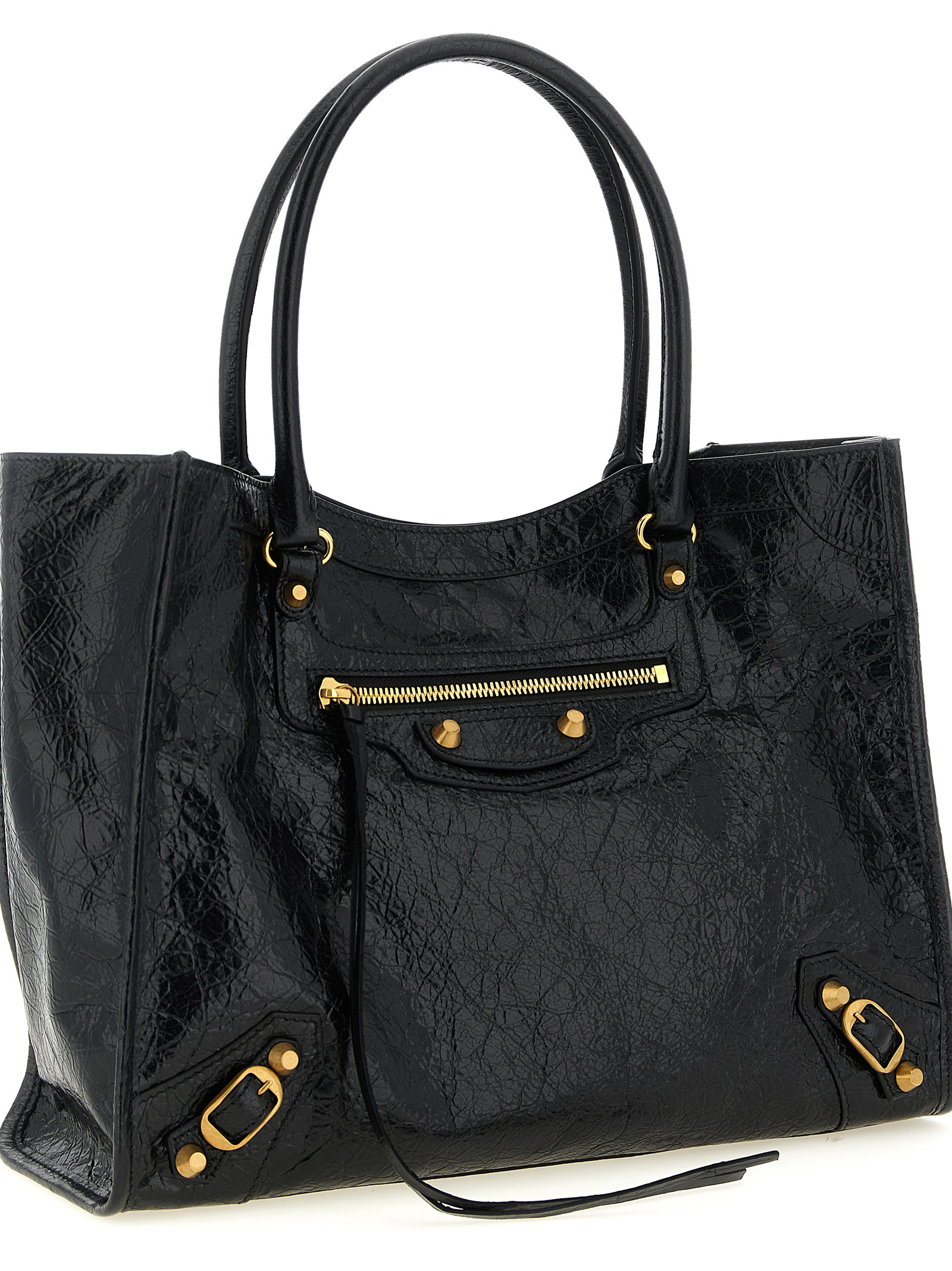 Arena Storico ‘Le City S’ lambskin shopping bag with antiqued gold studs, double fixed handle, internal magnetic closure, front zip pocket, cotton canvas lining, adjustable and removable shoulder strap.