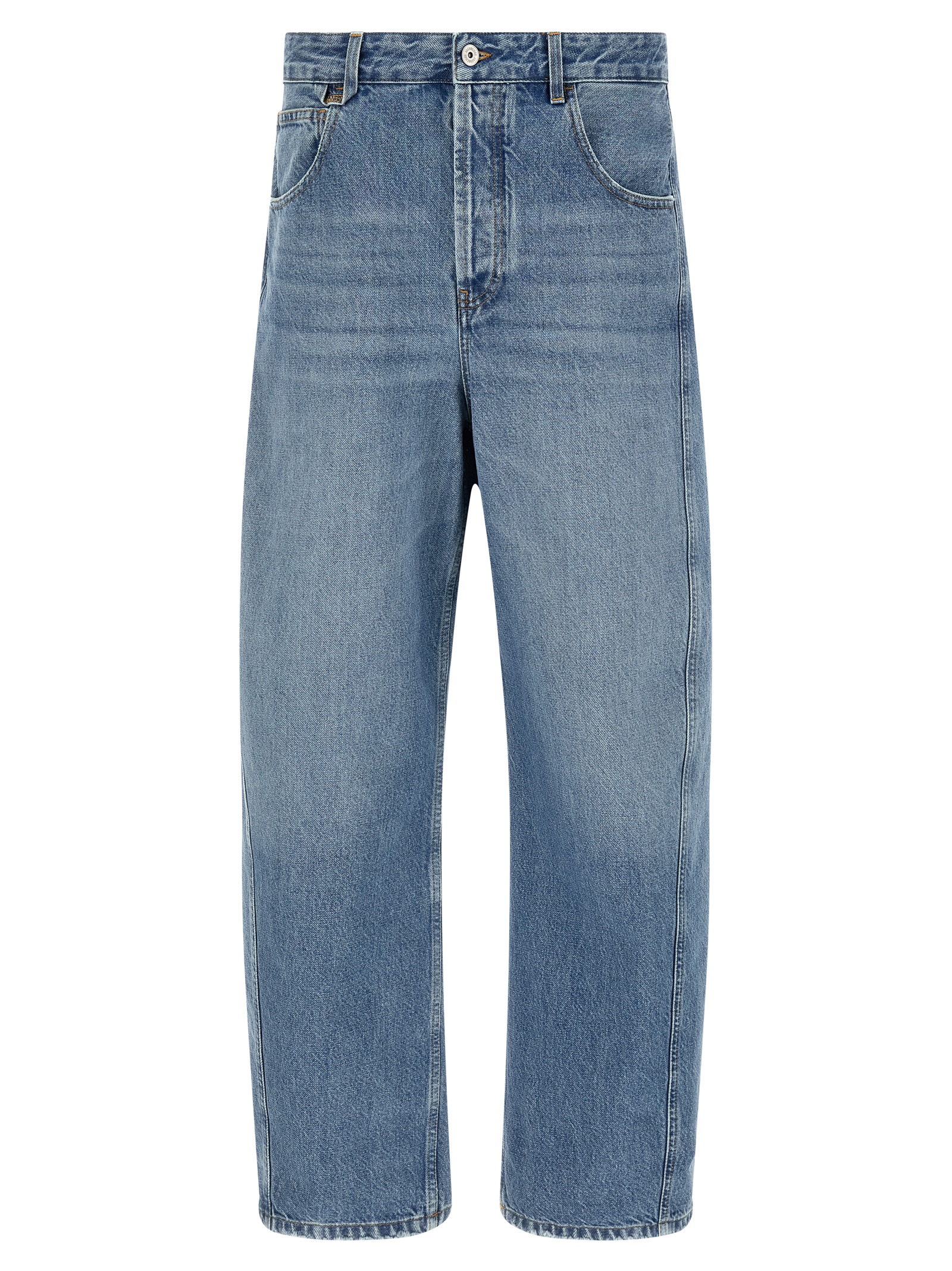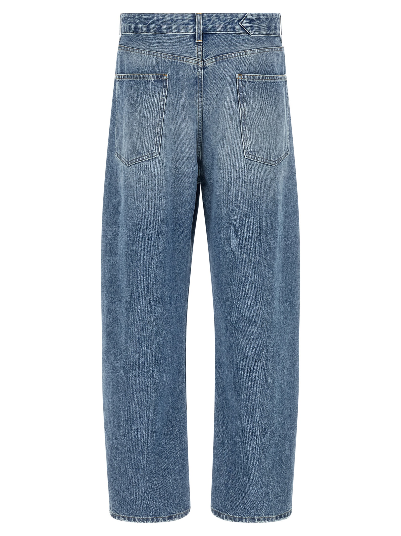 ‘Le De-Nimes Mirada’ stonewashed cotton denim jeans with contrast stitching, high waist, wide leg with a curved cut, front button closure, five pockets.