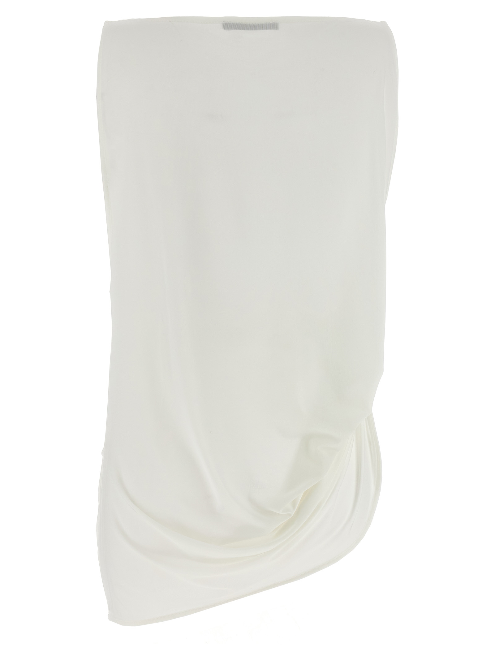 ‘Le Haut Peplo’ fluid jersey top with square neckline, asymmetrical hem with elastic waistband and woven draping, wide sleeve turn on the left and peplums on the right.