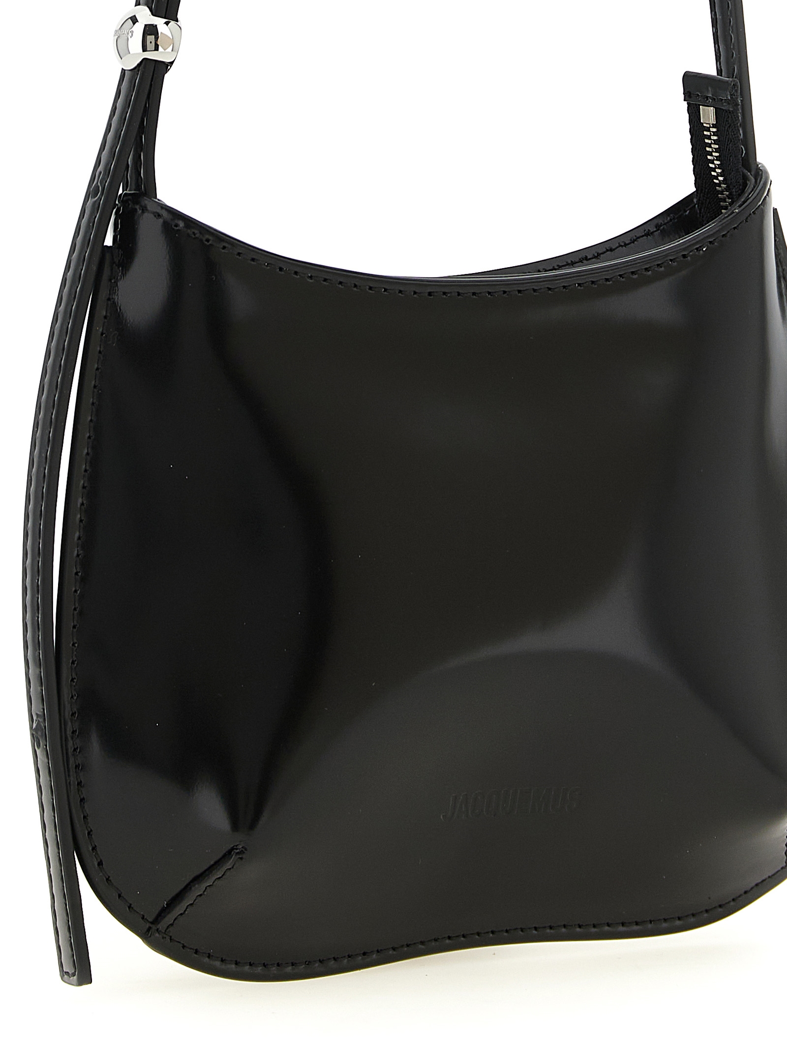 ‘Le Petit Bisou’ glossy leather shoulder bag with front embossed logo, top zip closure, adjustable handle.