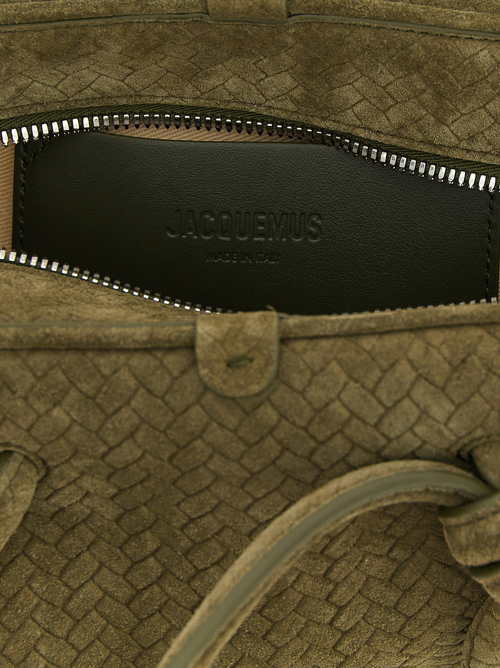 Le Petit Turismo’ bowling handbag woven suede with chevron pattern, front embossed logo, double fixed tubular handle with tone-on-tone bow detail, top zip closure, adjustable and removable shoulder strap.