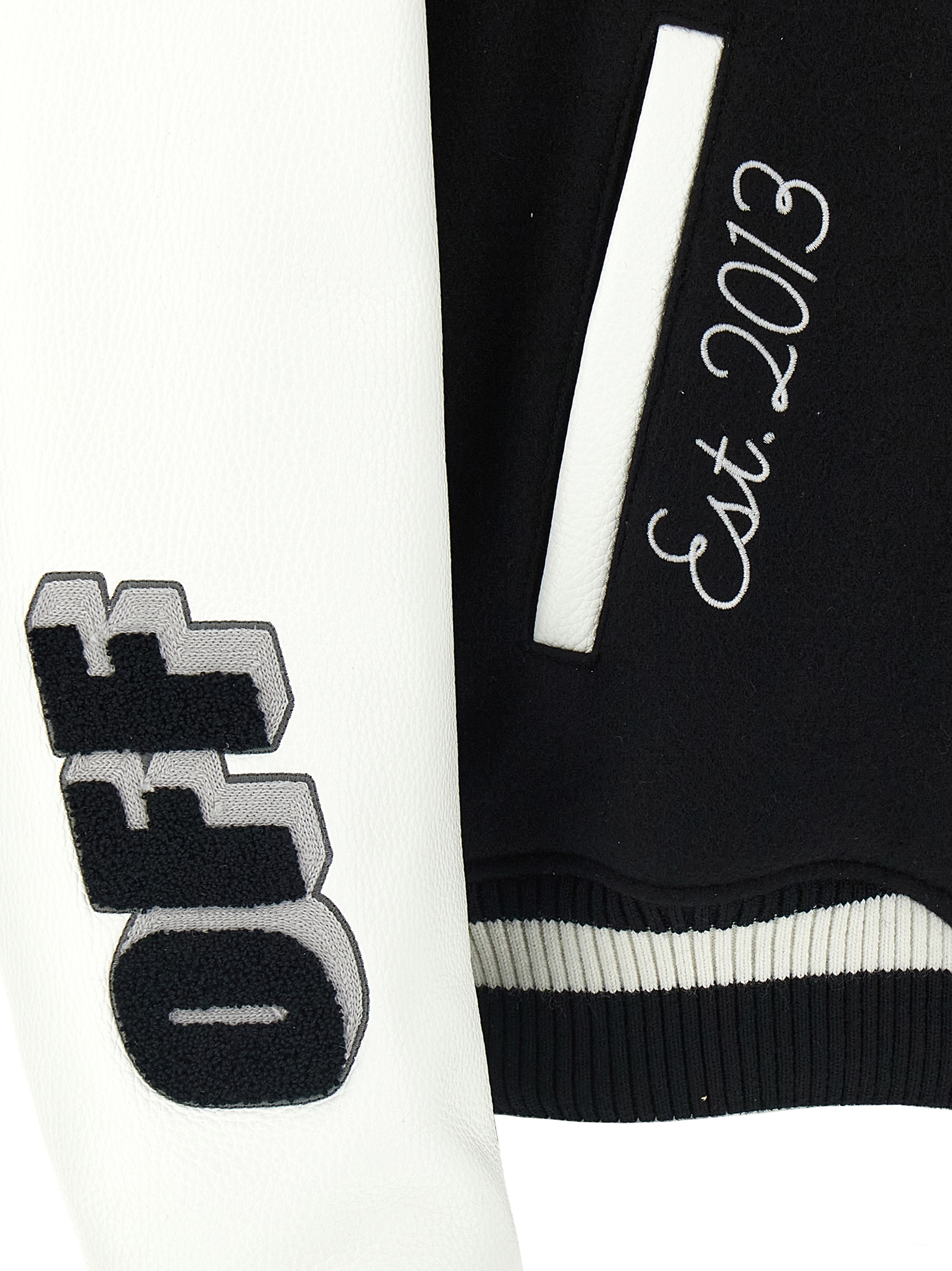 Lea’ wool blend bomber jacket with stretch ribbed knit details, all-over embroidery and patches, varsity model, front snap button closure, pockets, long sleeves in grainy leather with dropped cuffs and shoulder, and band on the bottom of the garment.