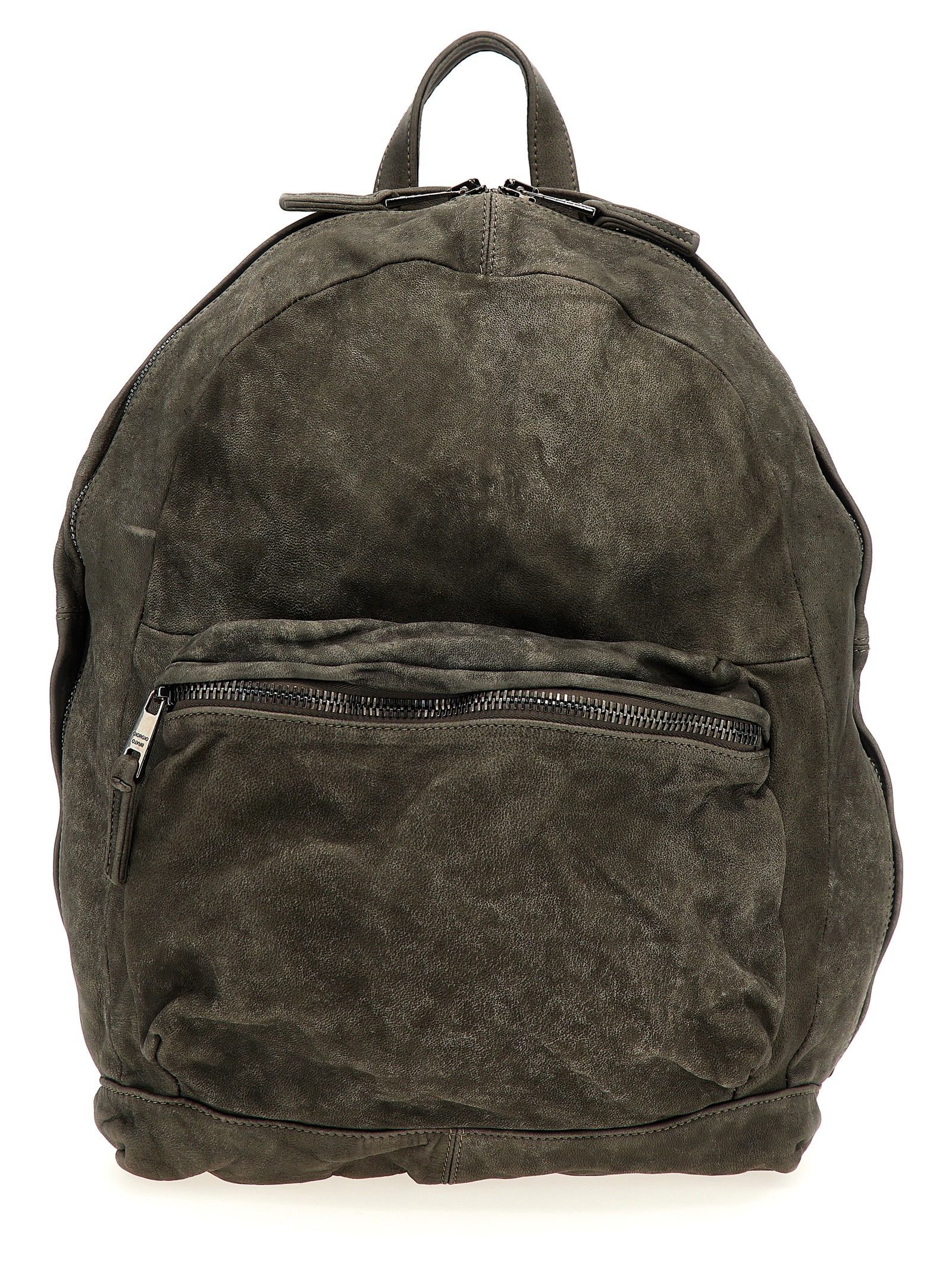 Leather backpack, square zip closure, external zip pockets, adjustable shoulder straps, fixed handle.