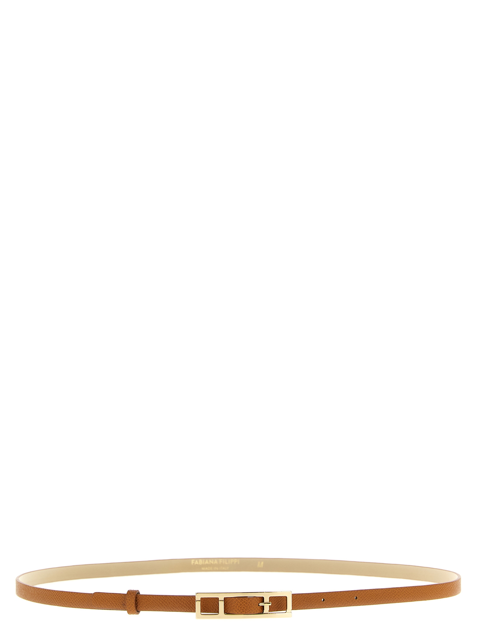 Adjustable leather belt with metal buckle.