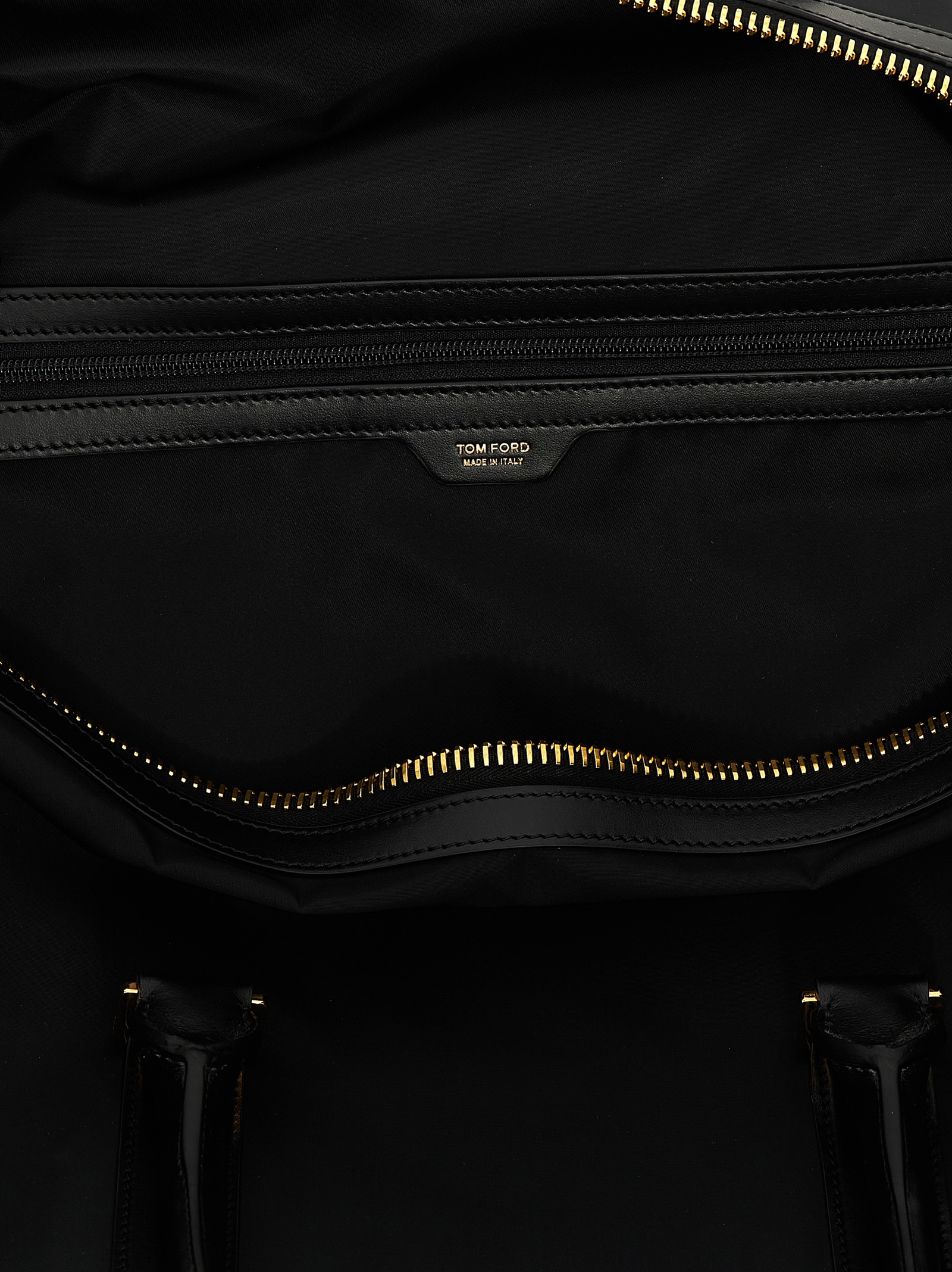 Synthetic fabric travel bag with leather details, front logo patch, top zip closure, double handle, metal details, adjustable and removable leather shoulder strap.