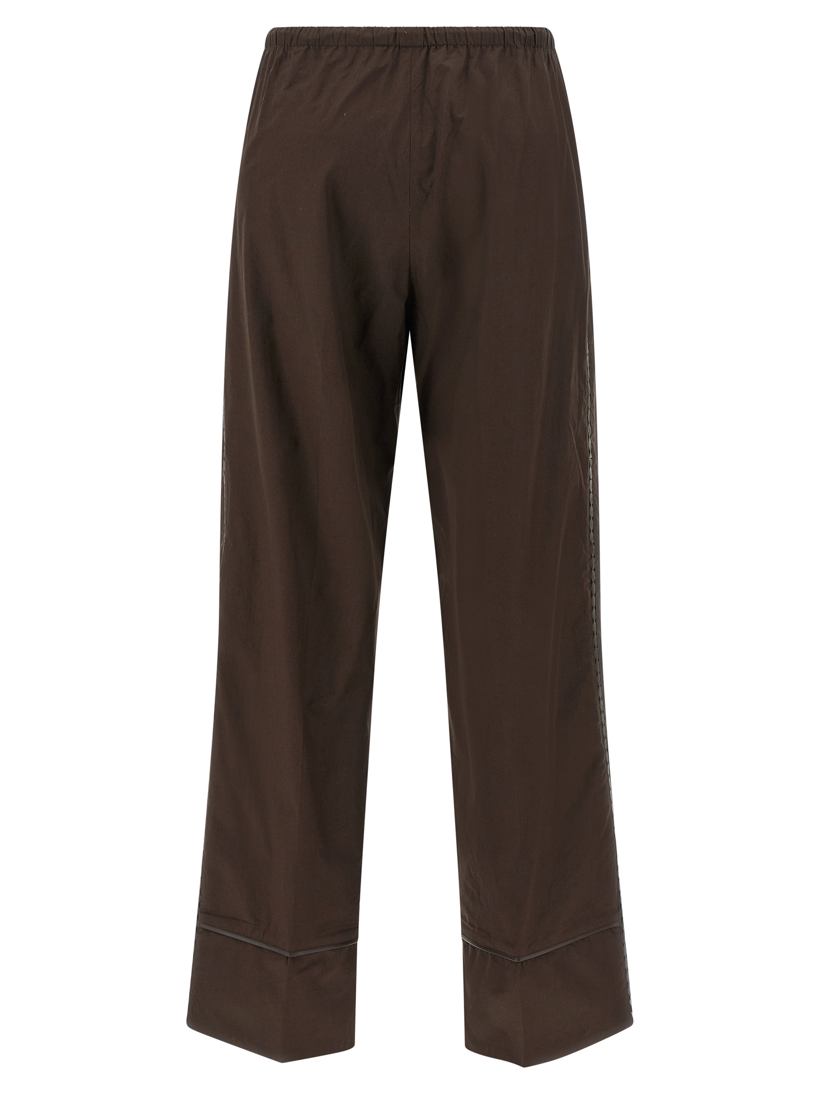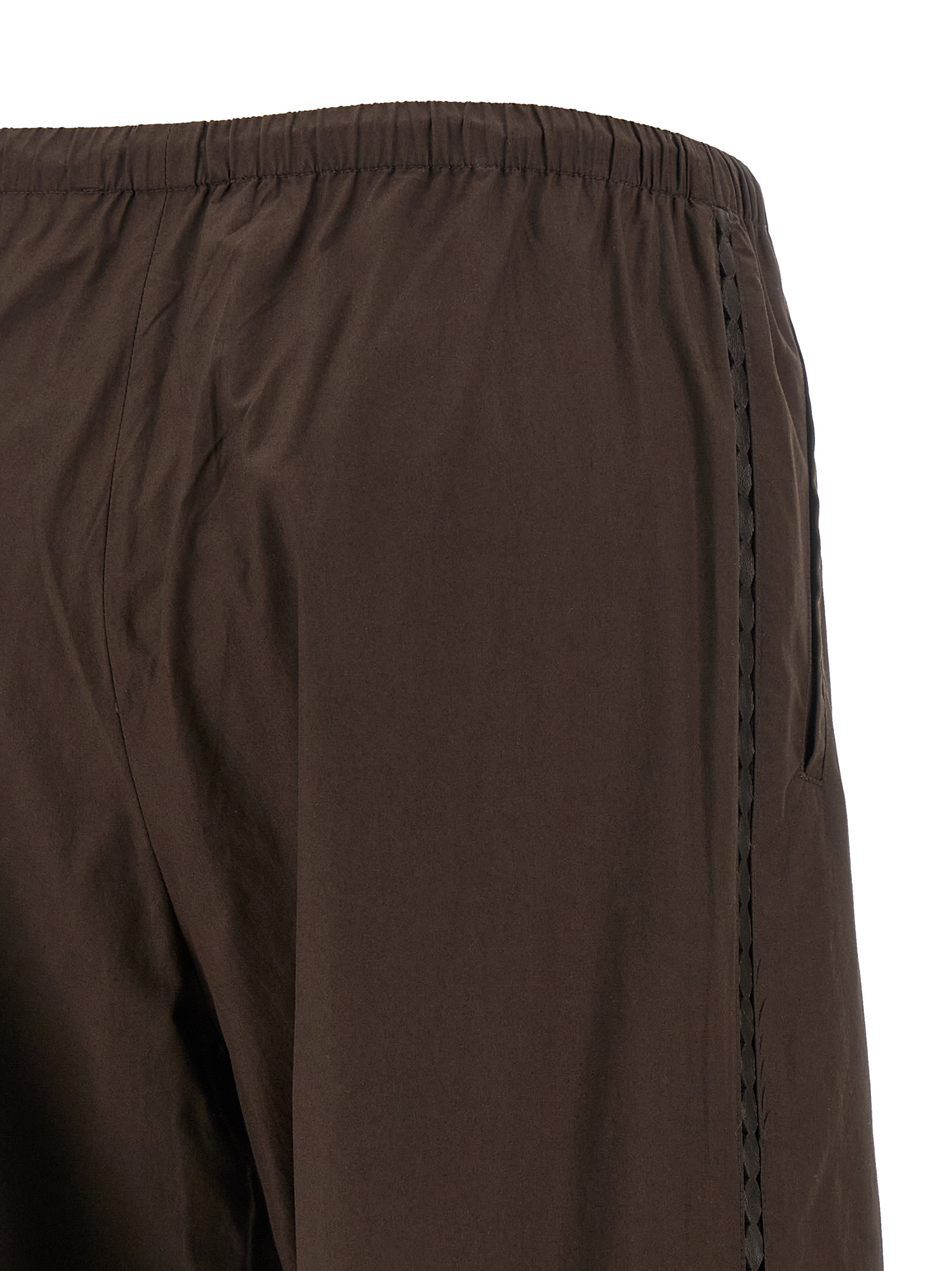 Cotton poplin pants with tone-on-tone perforated leather insert on the side, wide and straight leg, stretched pleat, drawstring elastic waistband, pockets.