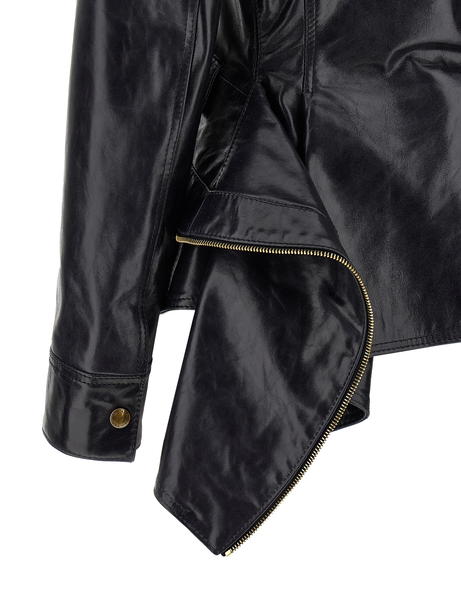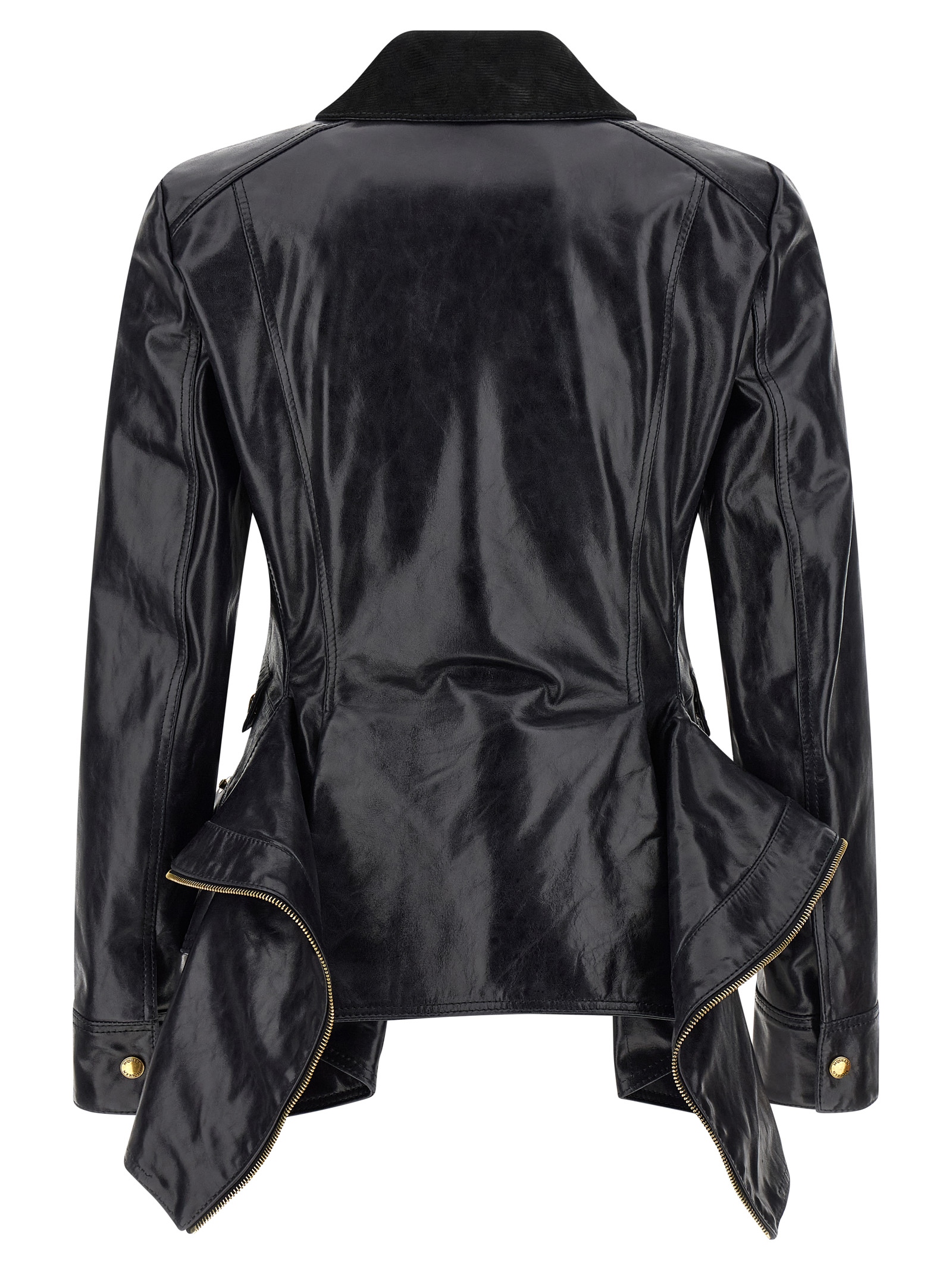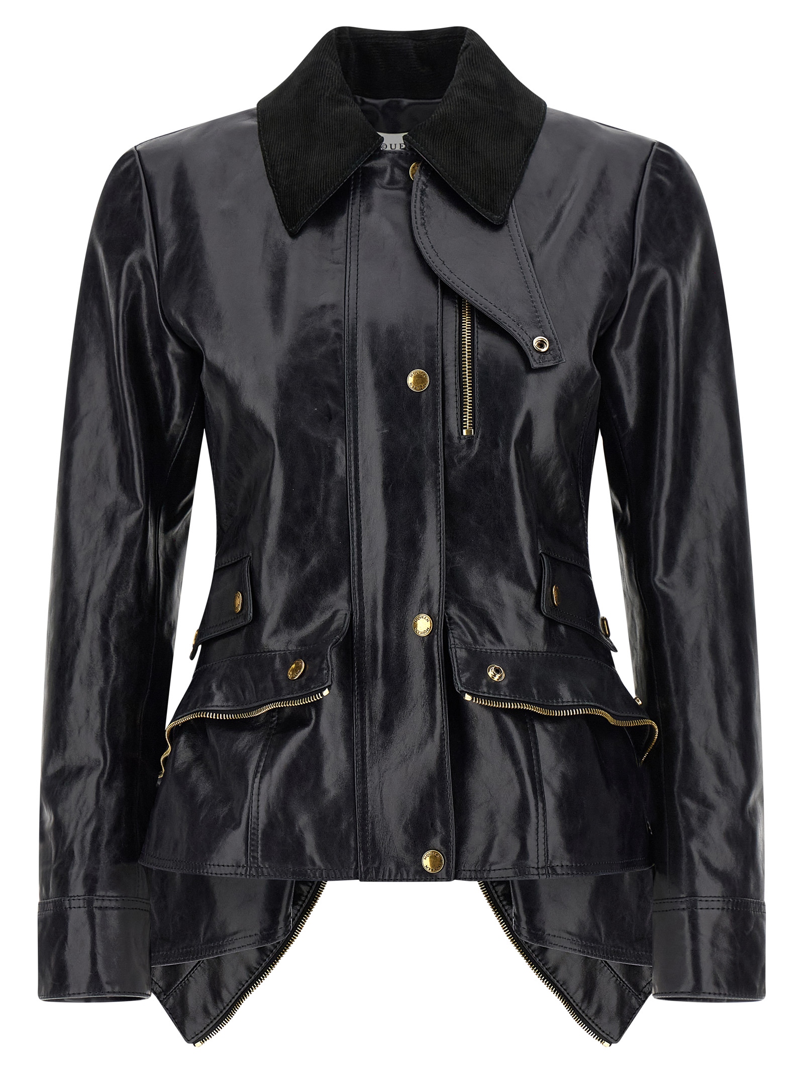 Full-grain leather jacket, flared fit with peplos, tone-on-tone corduroy collar, removable chinstrap, front zip and snap button closure, pockets, long cuffed sleeves, lining.