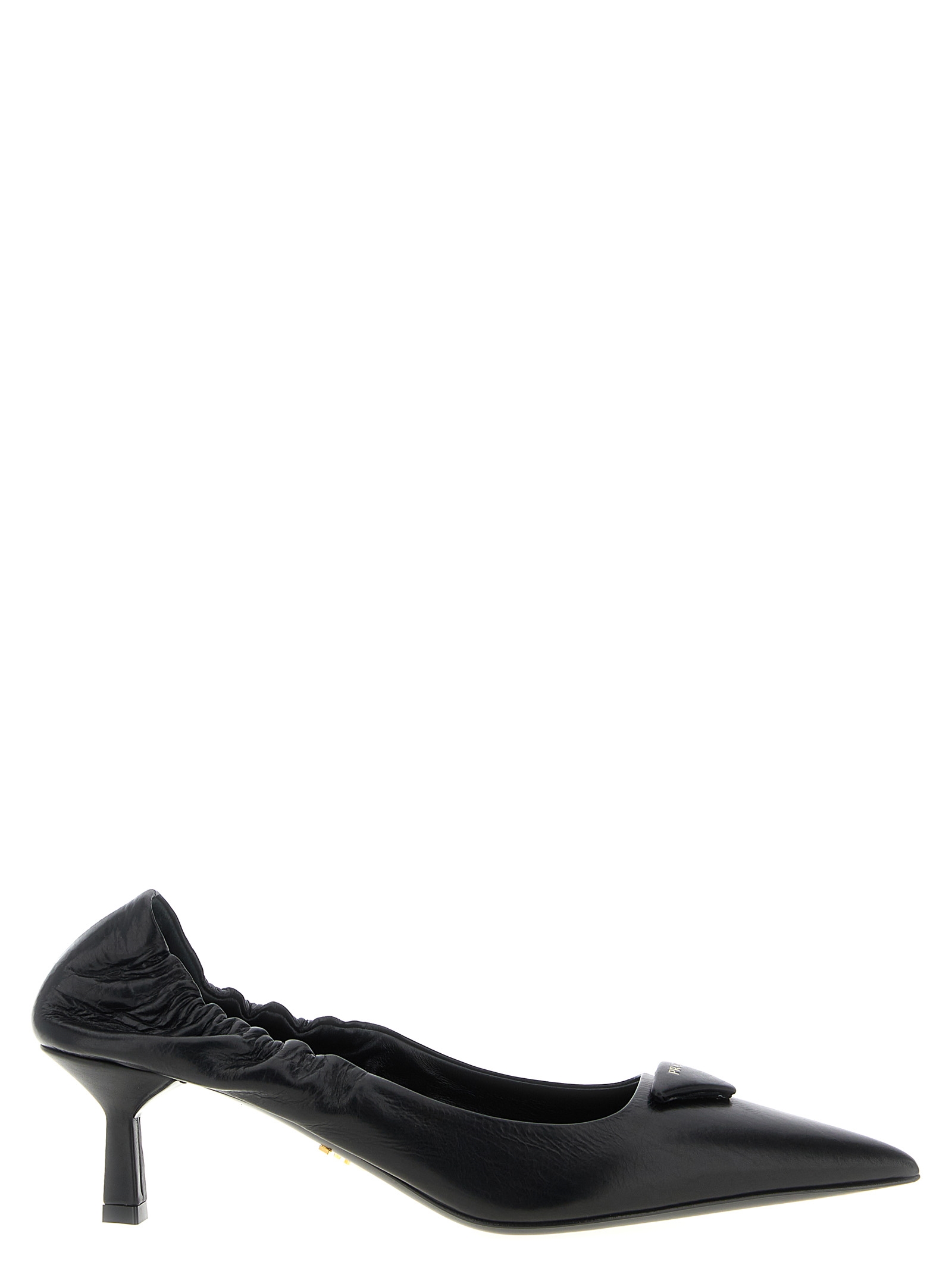 Leather pointed pumps with tone-on-tone triangle logo with embossed logo on the front, elastic back, architectural heel inspired by the geometry of the iconic triangle, leather sole.