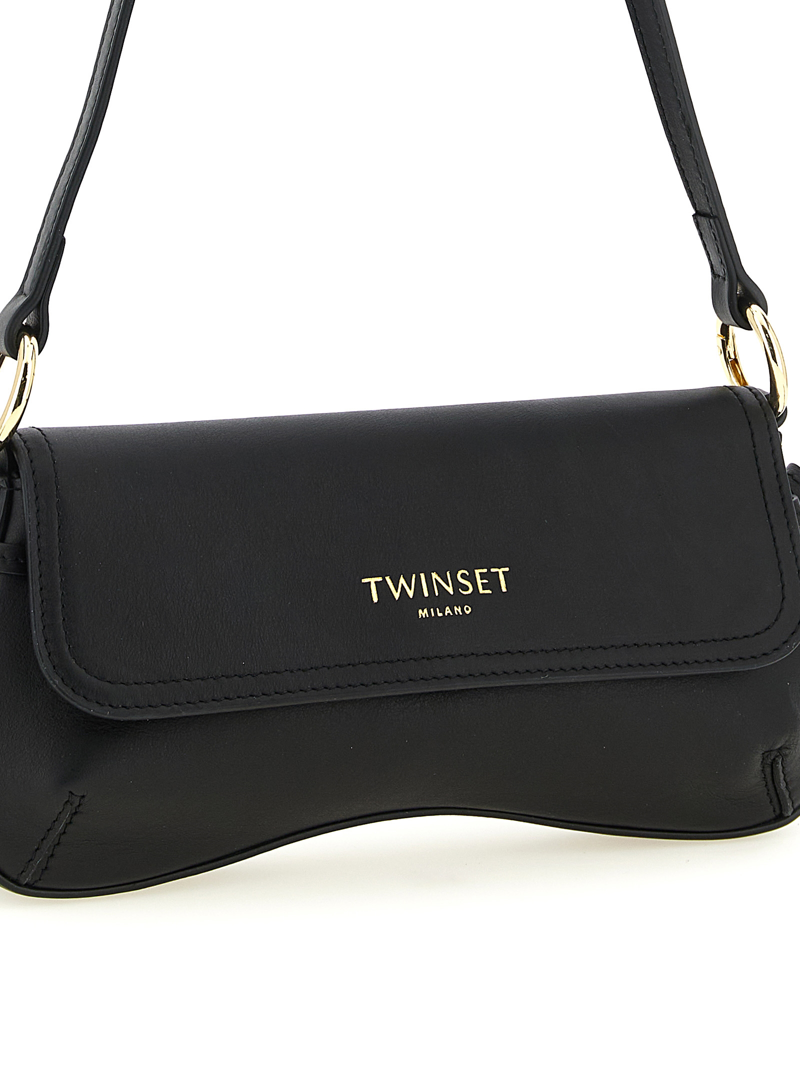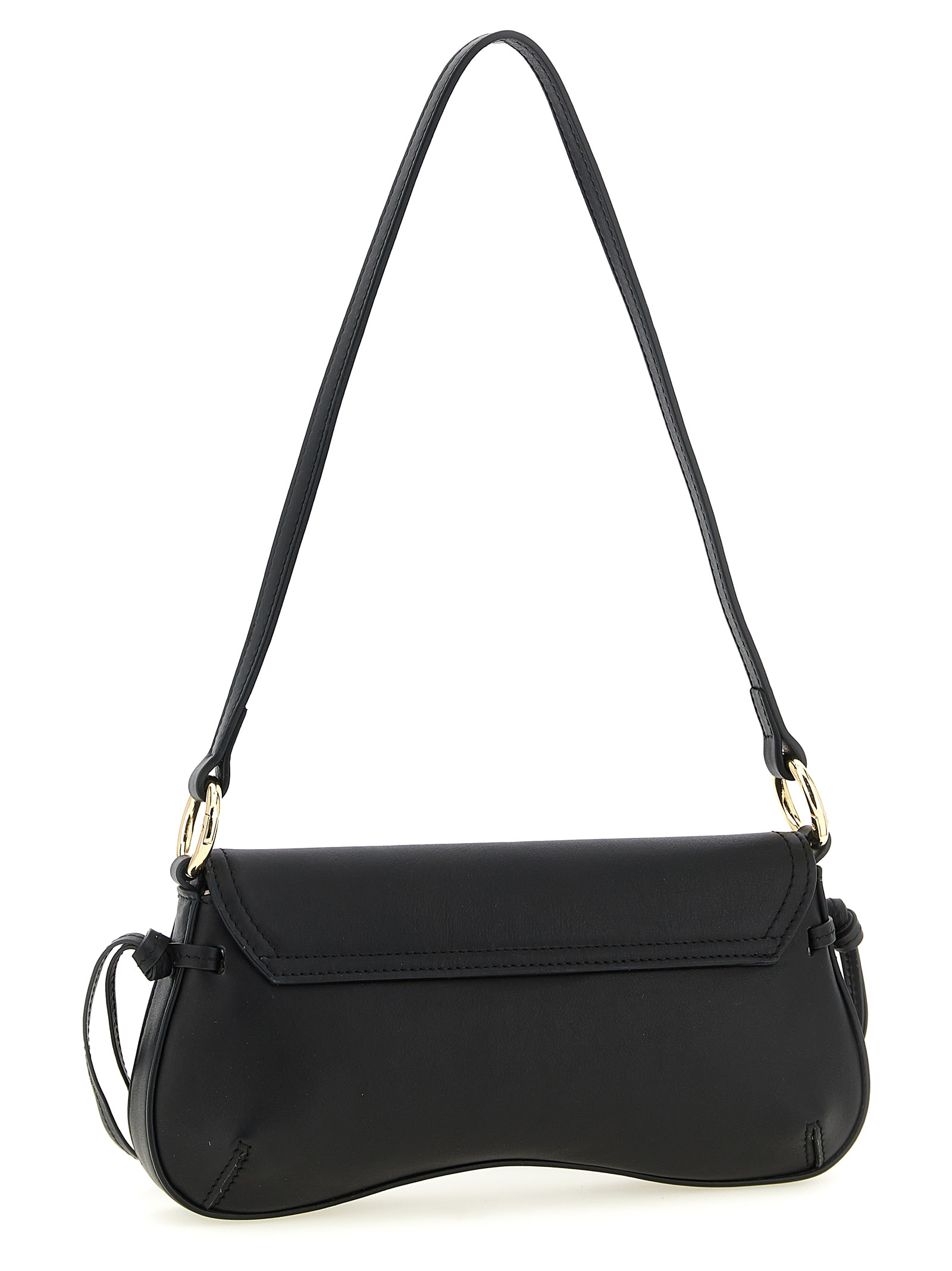 Full grain nappa calf leather shoulder bag, magnetic flap closure with front embossed logo, removable handle, shaped hem, side lacing detail.