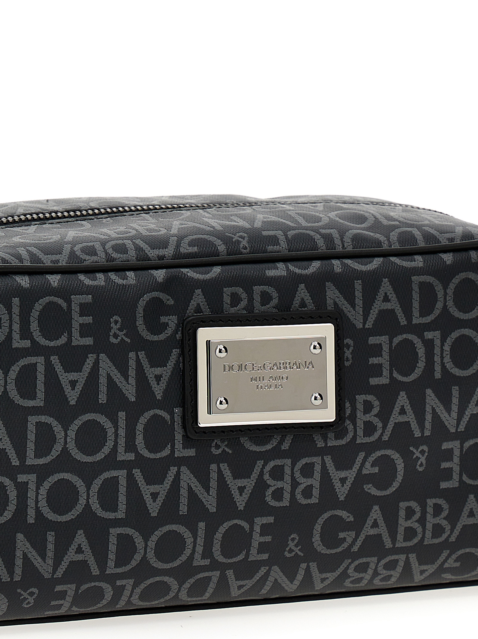 Leather toiletry bag with front logo plaque, zipper closure, and handle detail.