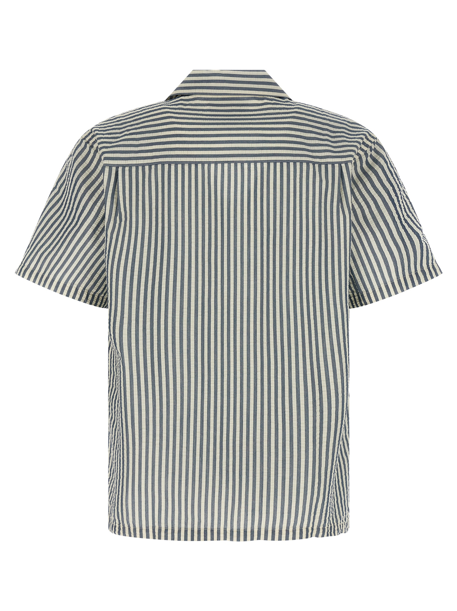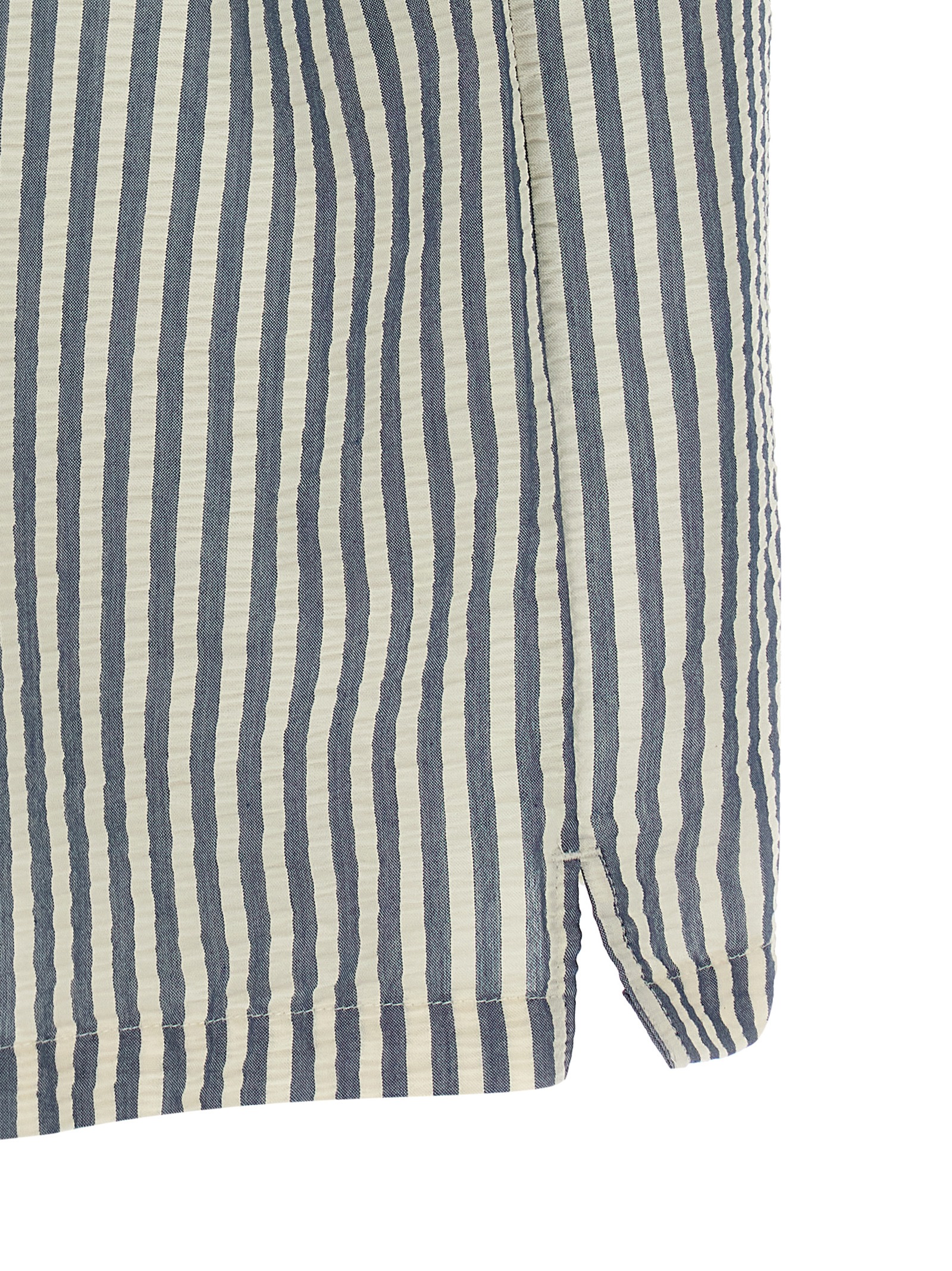 ‘Leavel’ shirt in lightweight polyester and cotton seersucker with vertical stripes, bowling style, logo patch and front mother-of-pearl button closure, pockets, short sleeves, side slits.