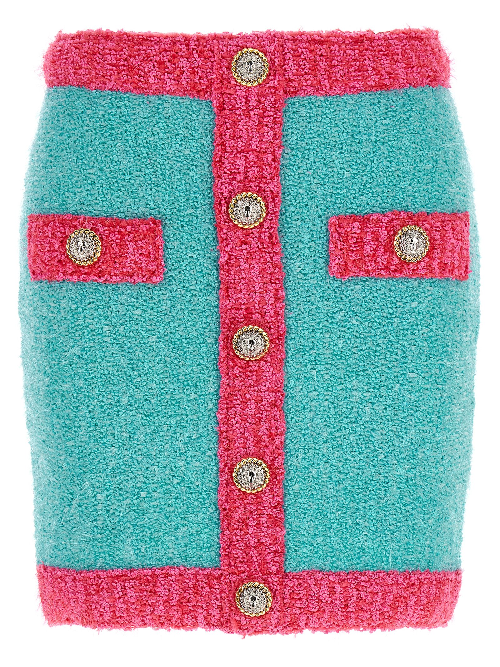 Two-tone cotton blend knit skirt, ‘Leone’ button appliqué, back zip closure.