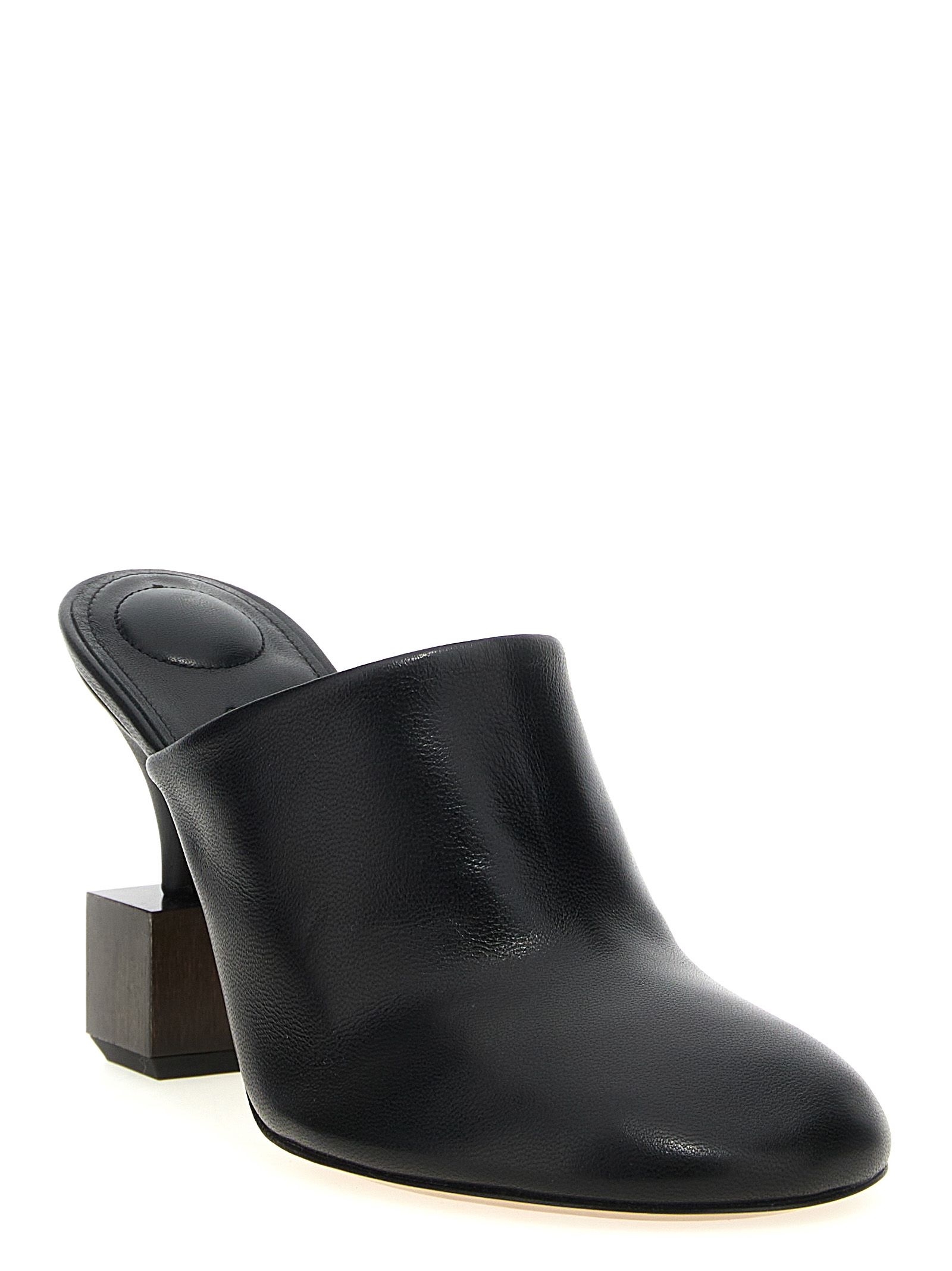 ‘Les Mules Bisou’ smooth leather mules with rounded toe, heel with geometric wooden sculptures, leather sole.