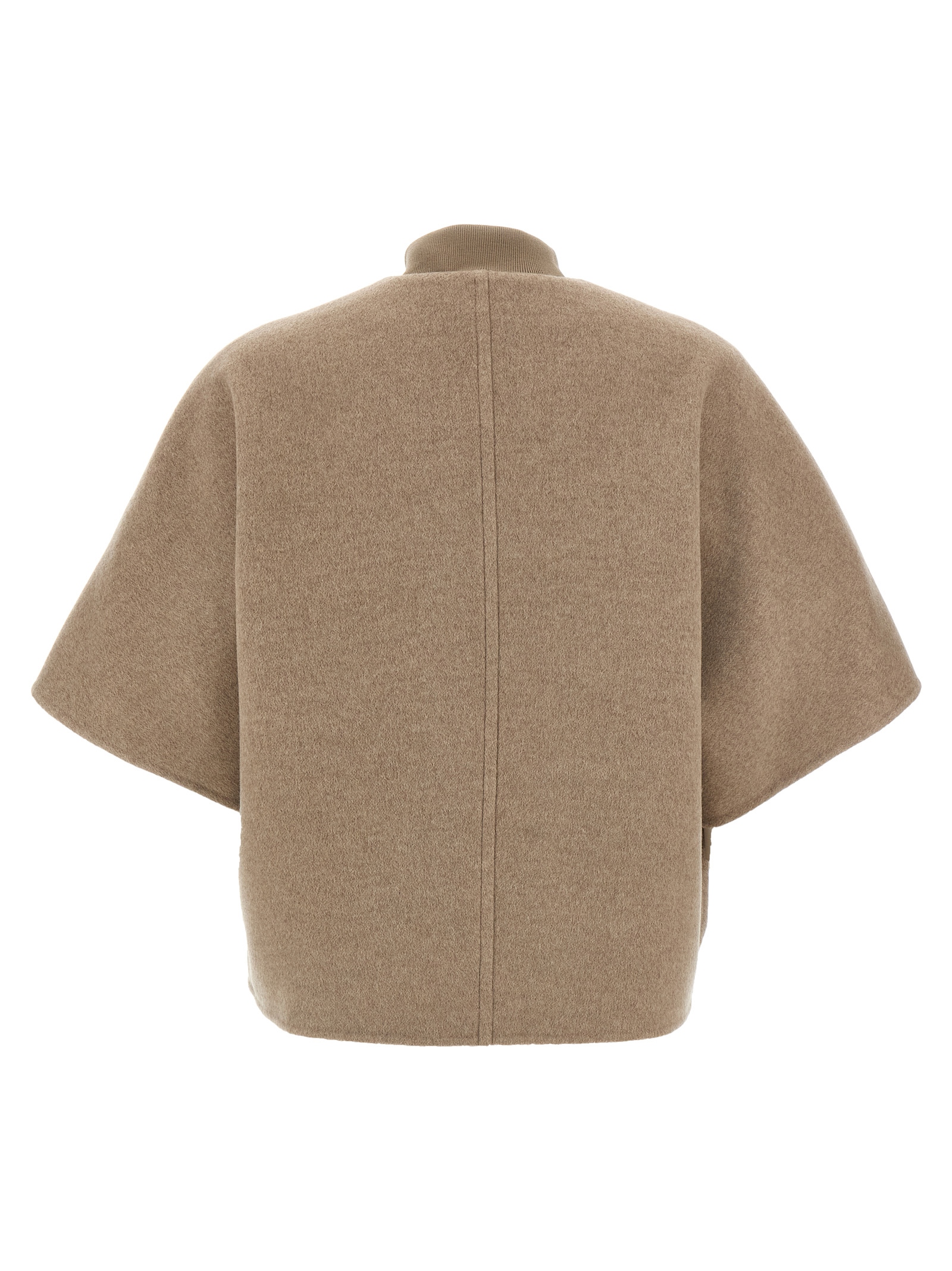 ‘Leticia’ pure cashmere double drap cape with ribbed wool knit details, front button closure, pockets, wide short kimono sleeves, asymmetric hem, wide side slits with button.