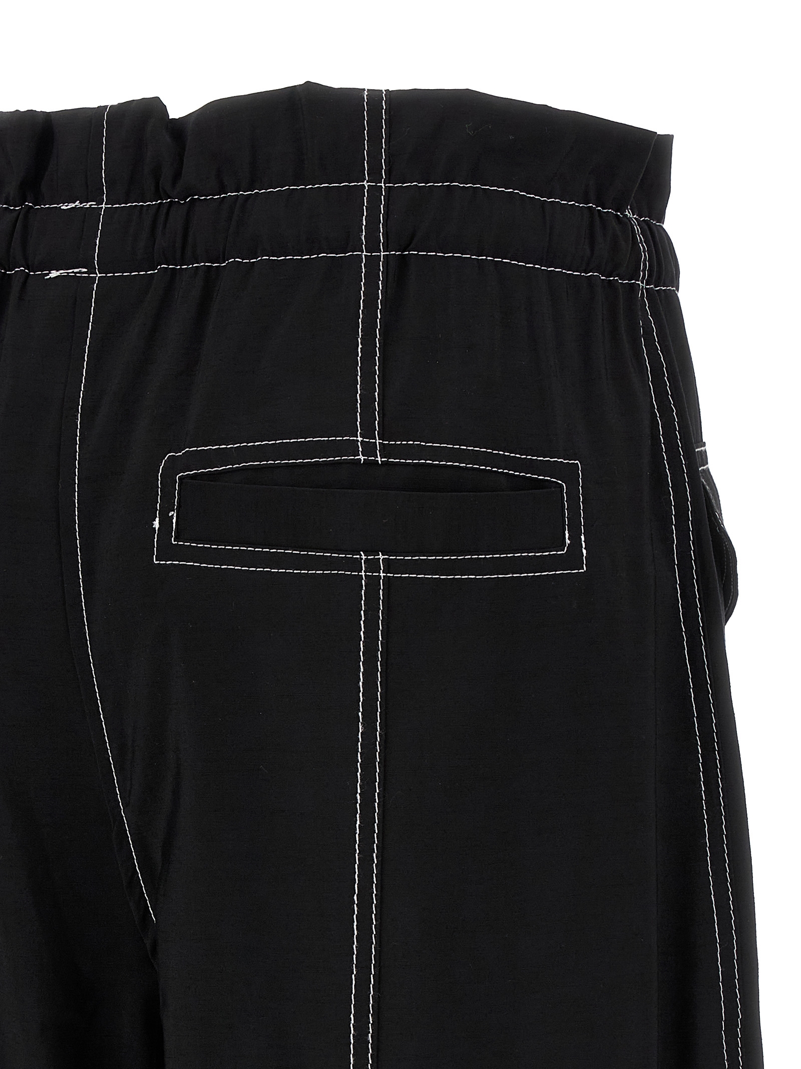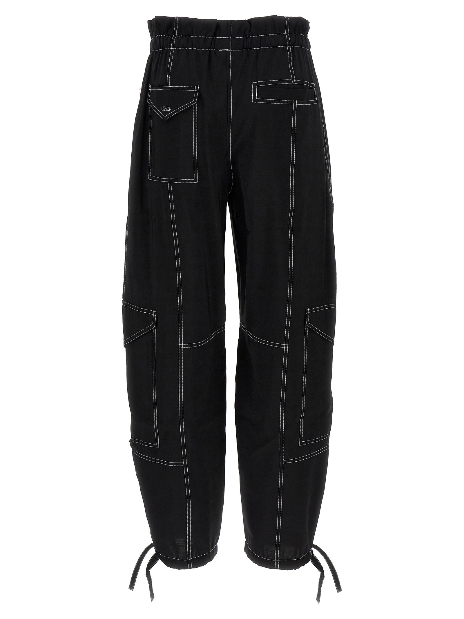 ‘Light Slub Pocket’ viscose blend pants with contrast stitching, high waist style, adjustable drawstring elastic waistband, pockets, straight leg, ankle drawstring.