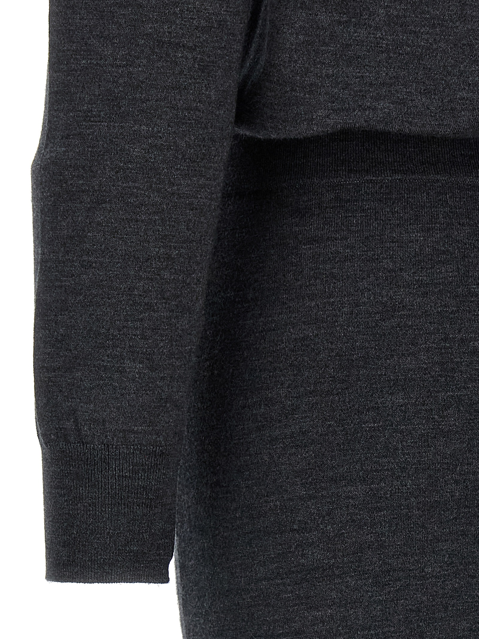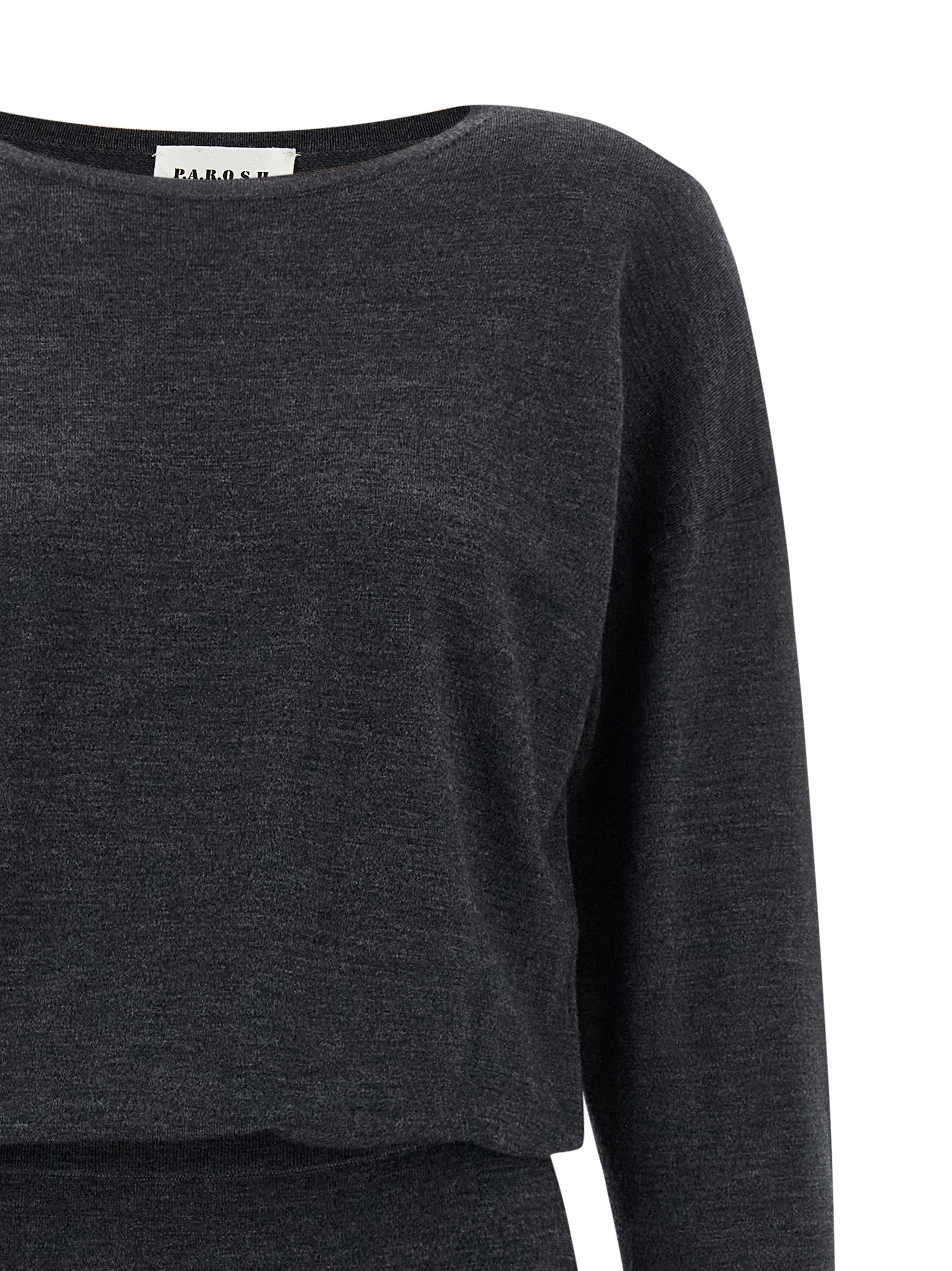 ‘Lime25’ wool and cashmere midi dress with round neckline, elastic waistband that allows you to smudge the upper part, removable padded shoulders, long bat sleeves with cuffs, side split.