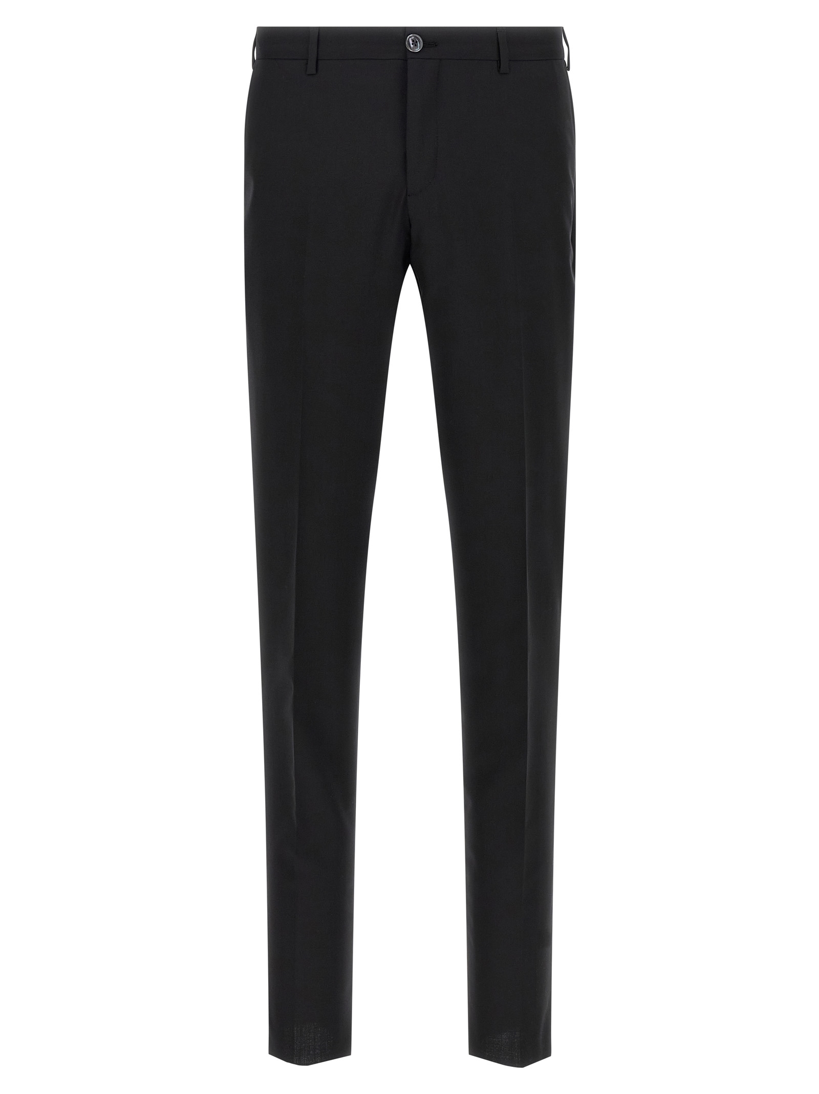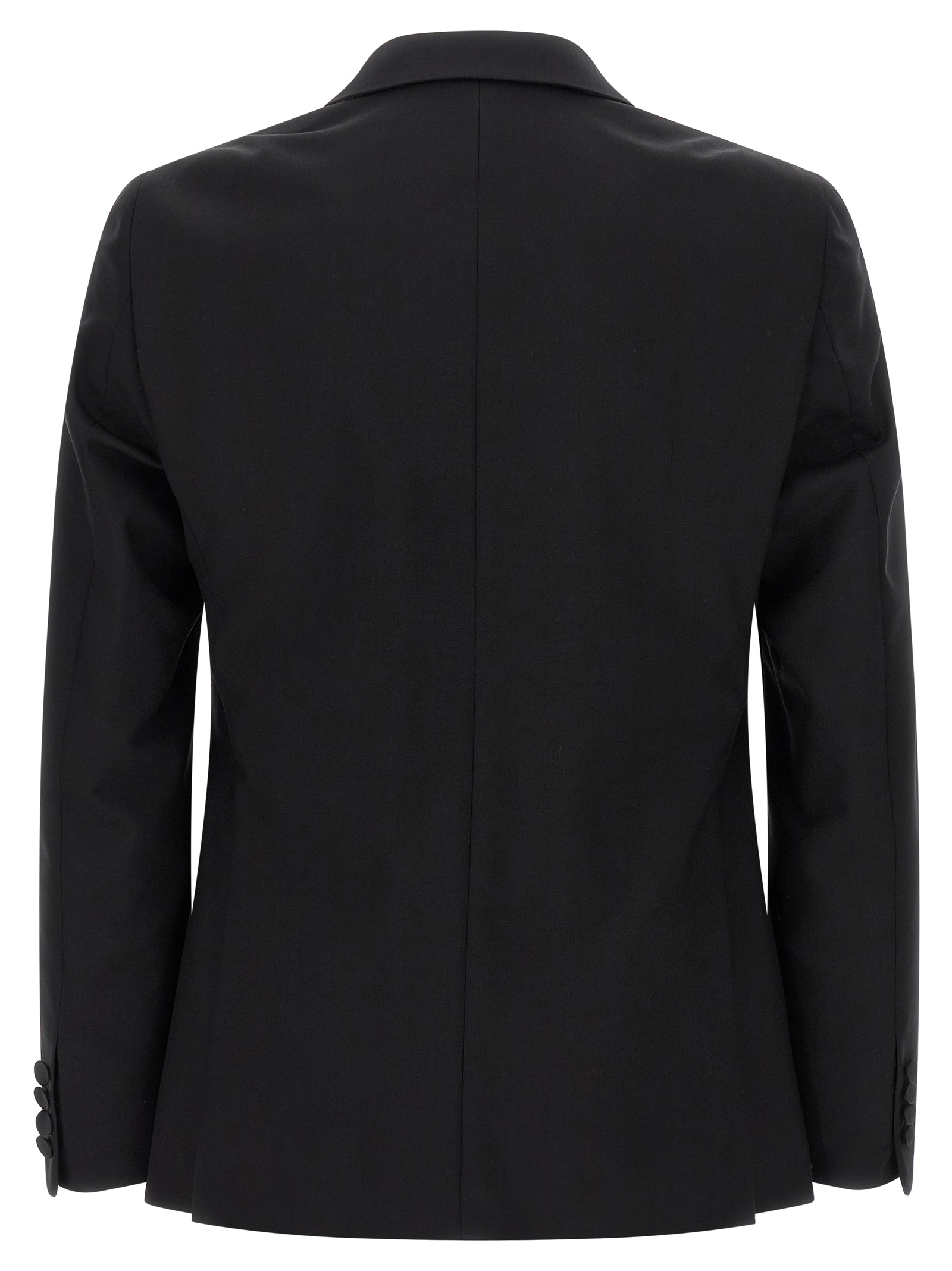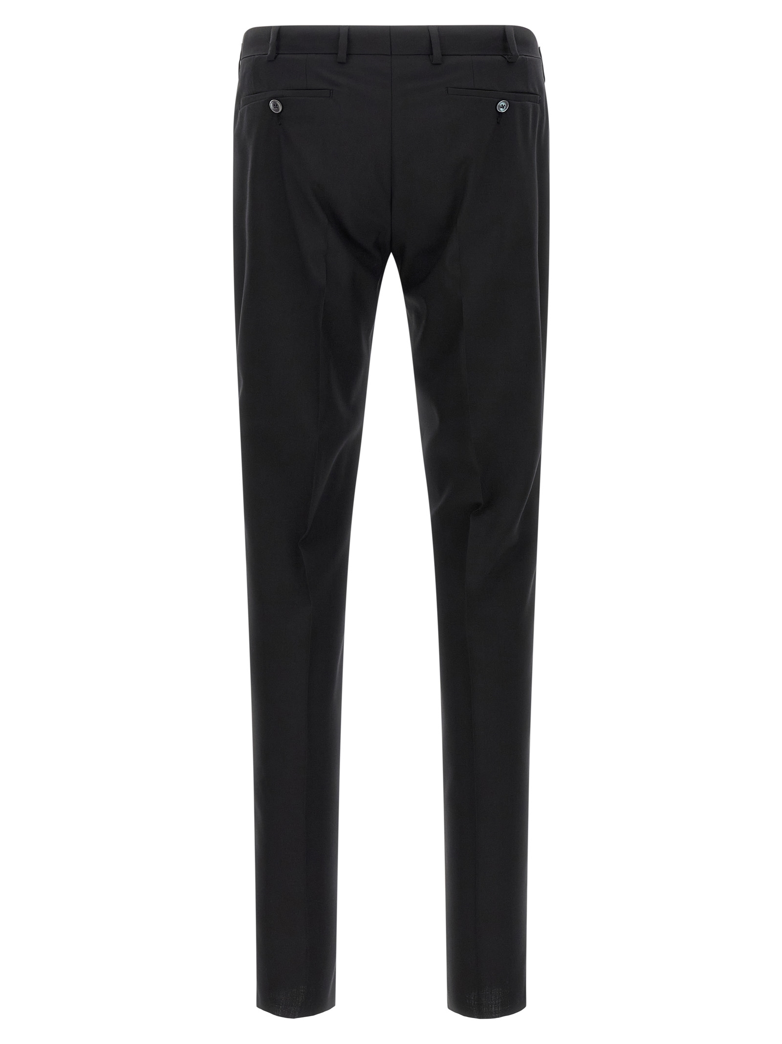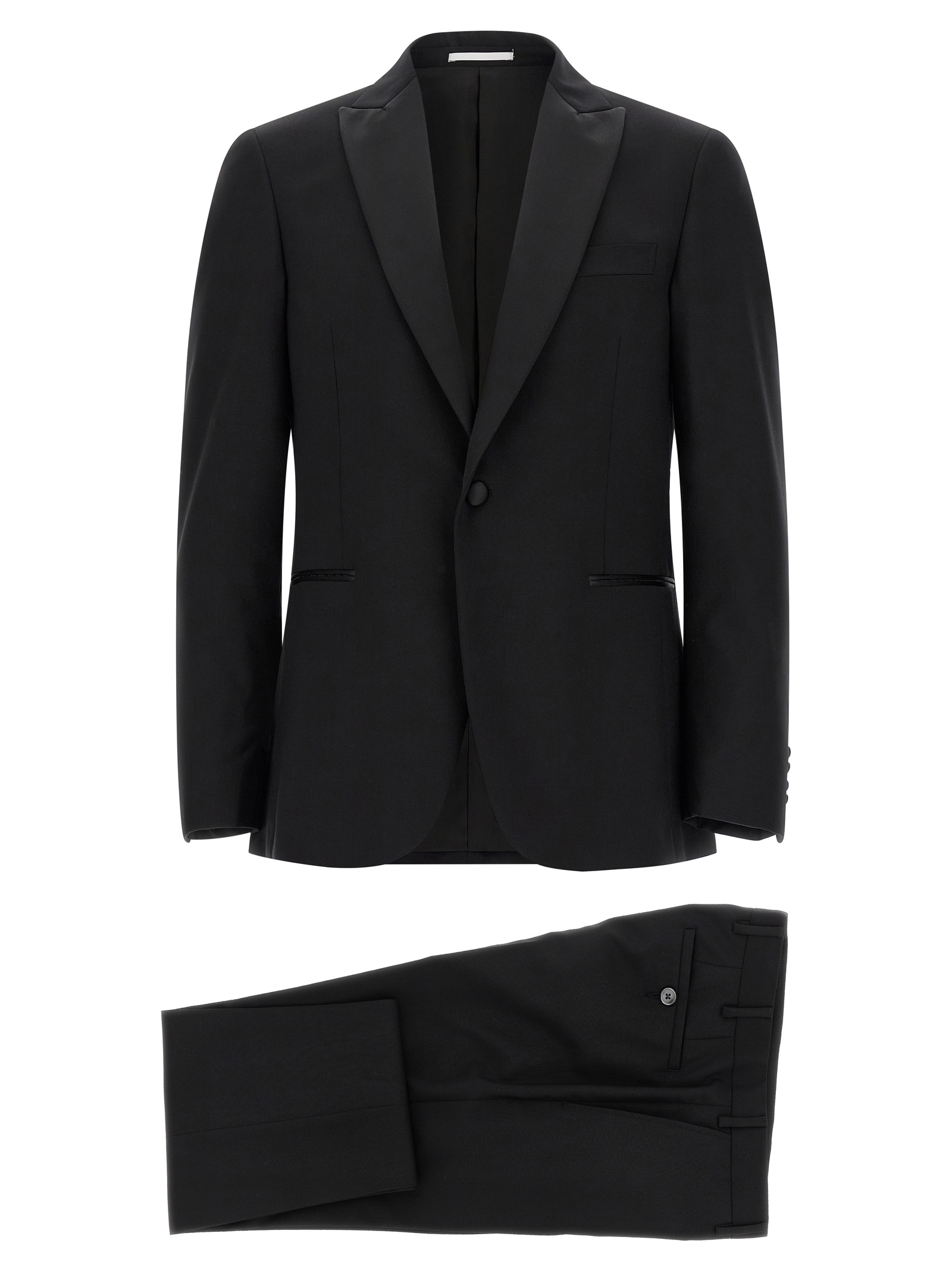 ‘linea Cerimonia’ wool dress consisting of single-breasted blazer with single button closure, tonal satin details, peak lapels, breast pocket, patch pockets, viscose lining, two inner pockets, buttonhole cuffs, back slits and trousers with stretched pleat, front pockets americane”, back welt pockets, front zip and button closure, viscose lining.