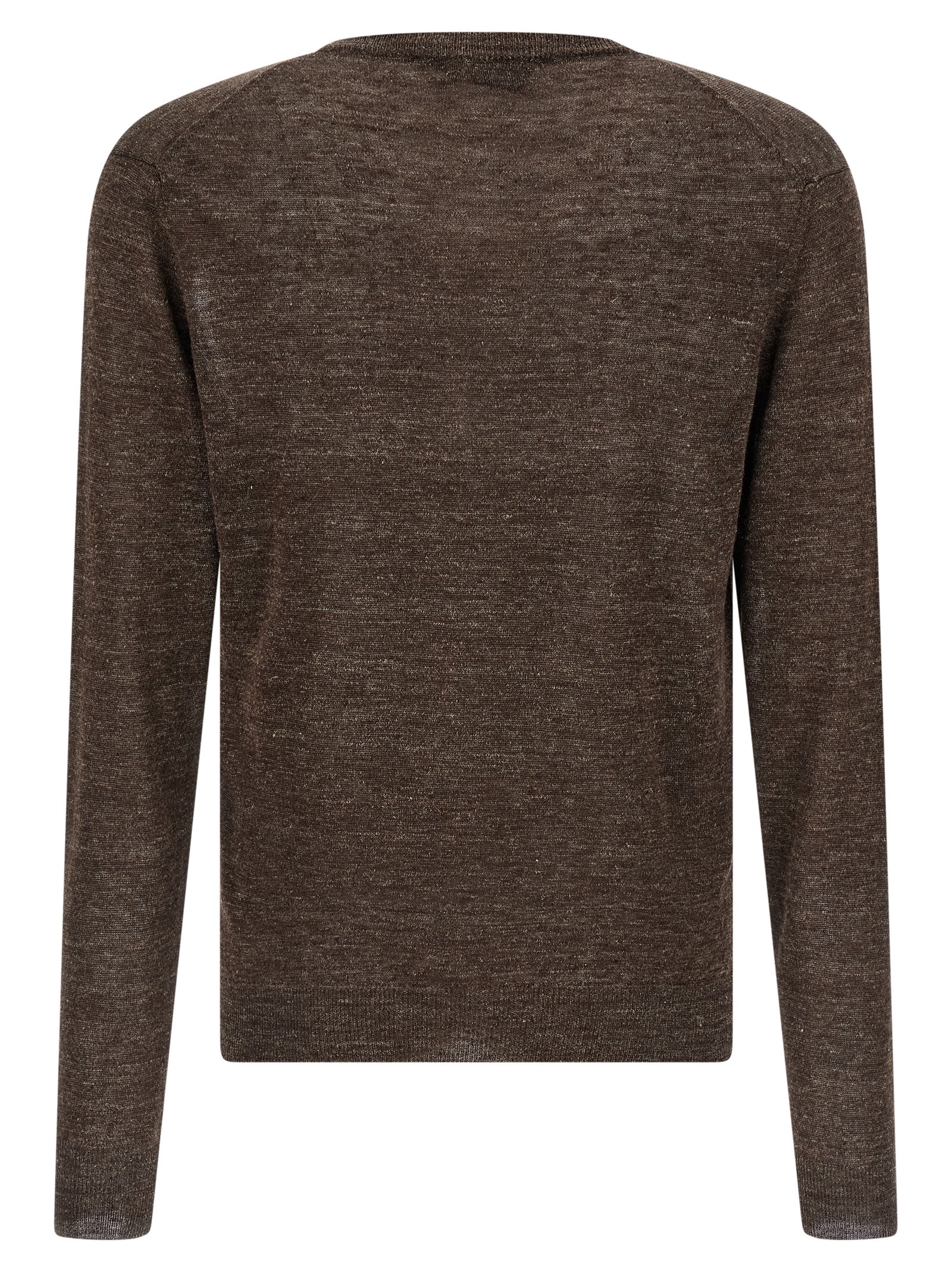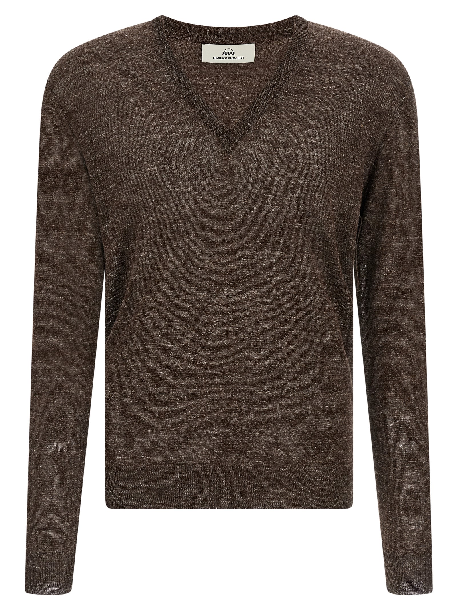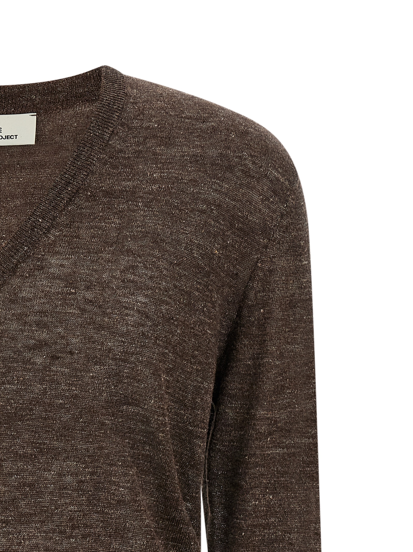 Melange sweater in linen and silk blend, V-neck, long cuffed sleeves, and band on the hem.