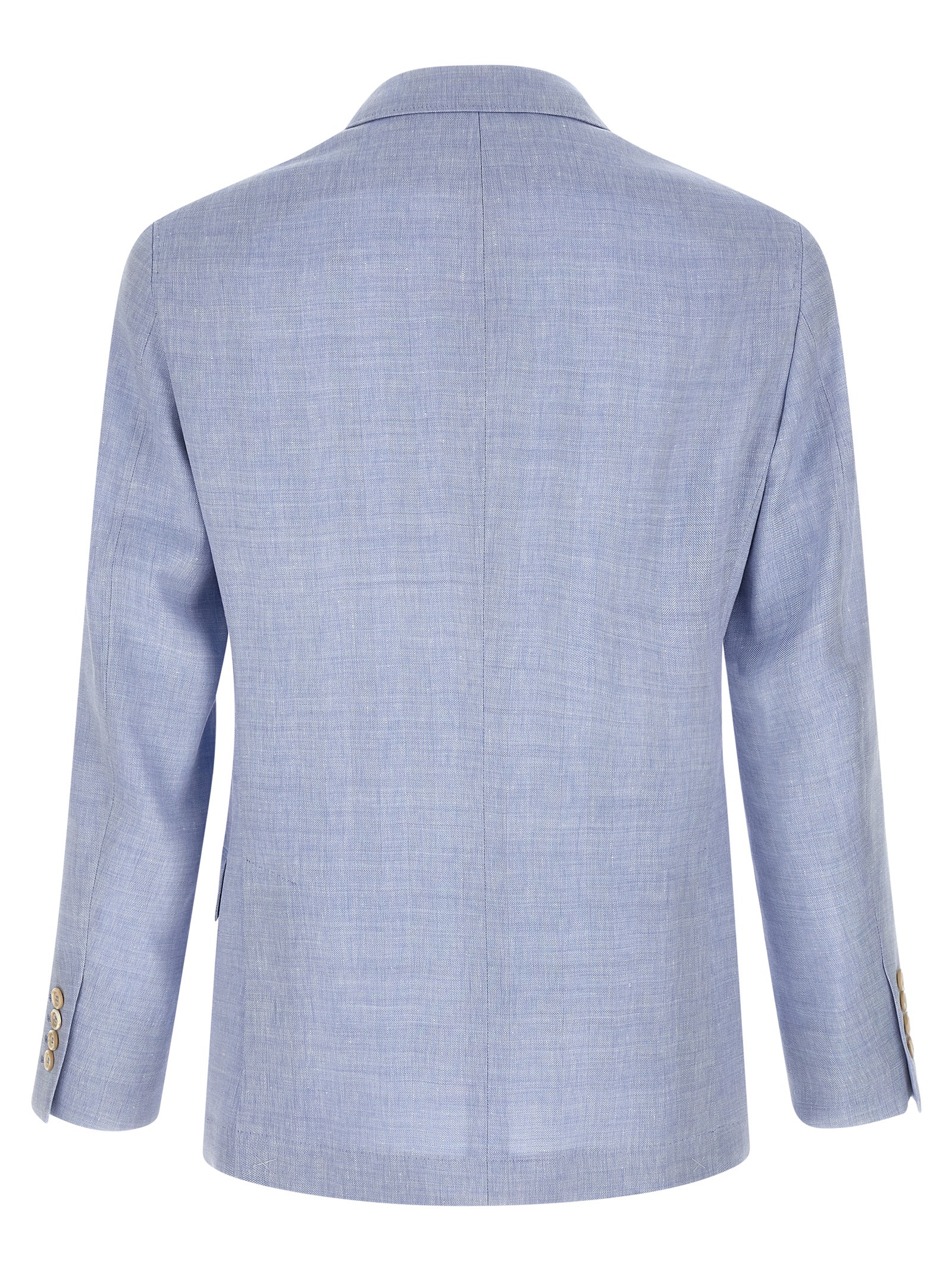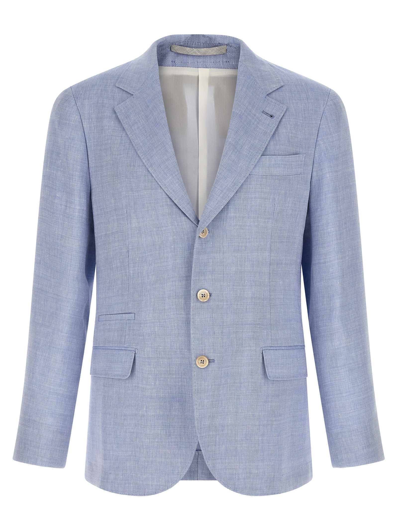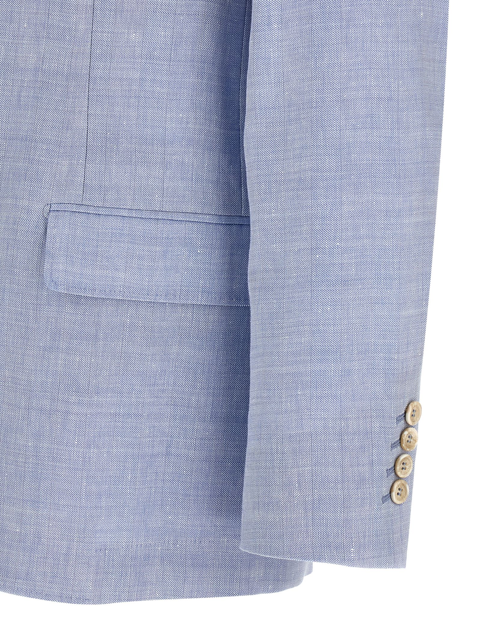Deconstructed linen and virgin wool blazer Chevron texture, single-breasted model with three buttons closure in two-ironed horn, mirror lapels, flap pockets, ticket pocket and chest pocket, two internal pockets with button closure and pen pocket, ‘Spalla Solomeo’, cuffs with opening buttonholes, half cupro lining, back vents.