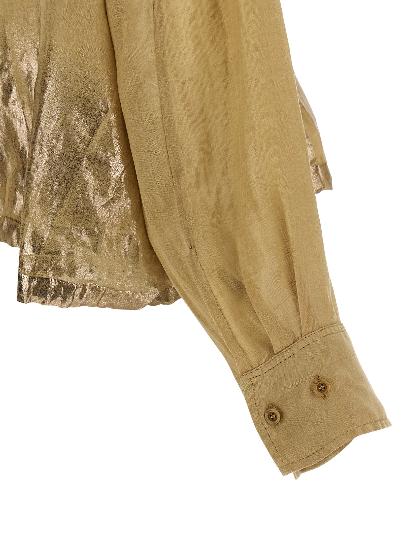 Linen blend shirt with lower part coated with laminated paint, slightly crop model, breast pocket, front button closure, long sleeves with cuffs and dropped shoulders, drawstring on the hem.