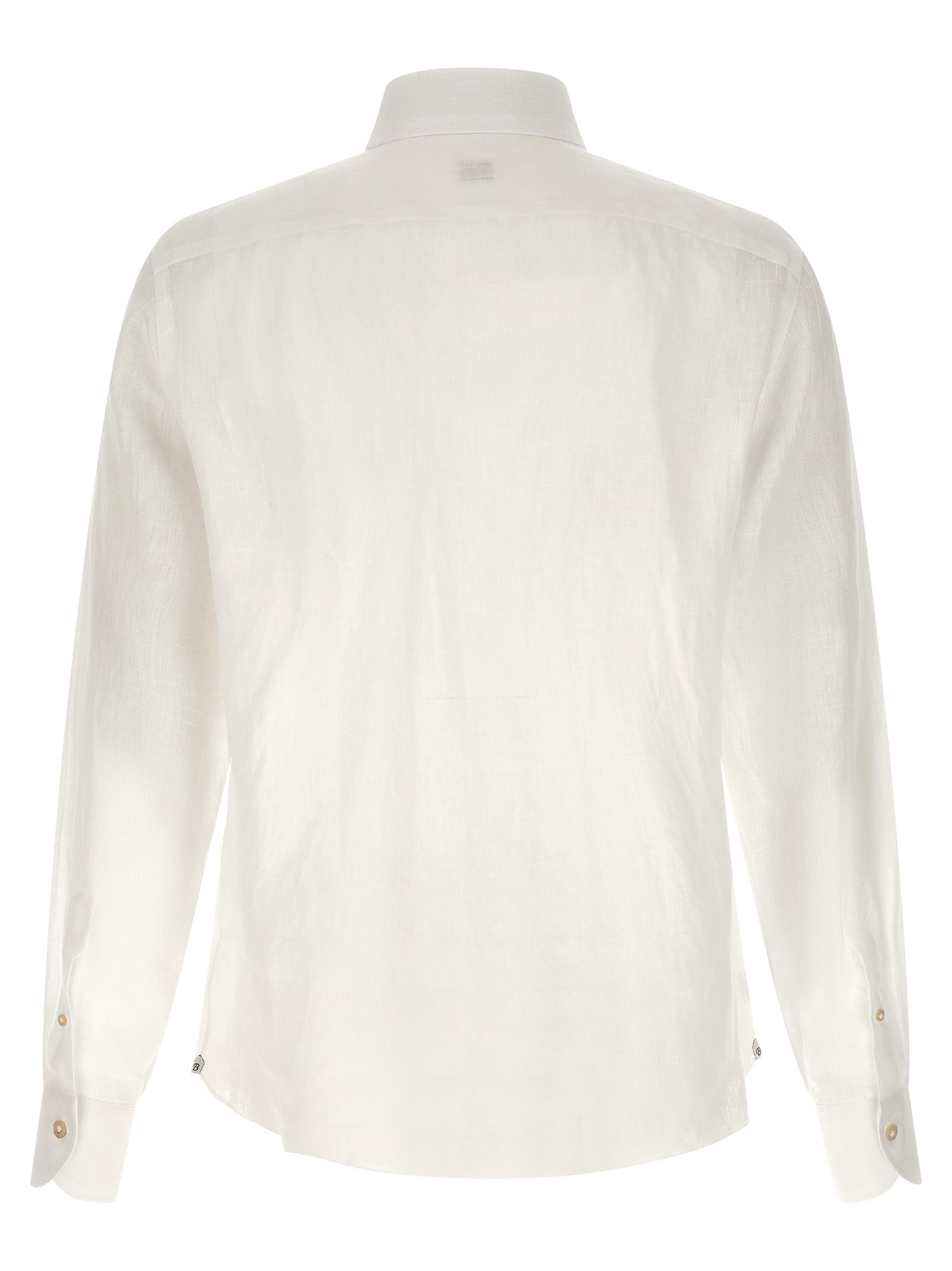 Hand-stitched light linen blouse with ‘Nigel’ collar, front mother-of-pearl button closure, long cuffed sleeves, rounded hem.