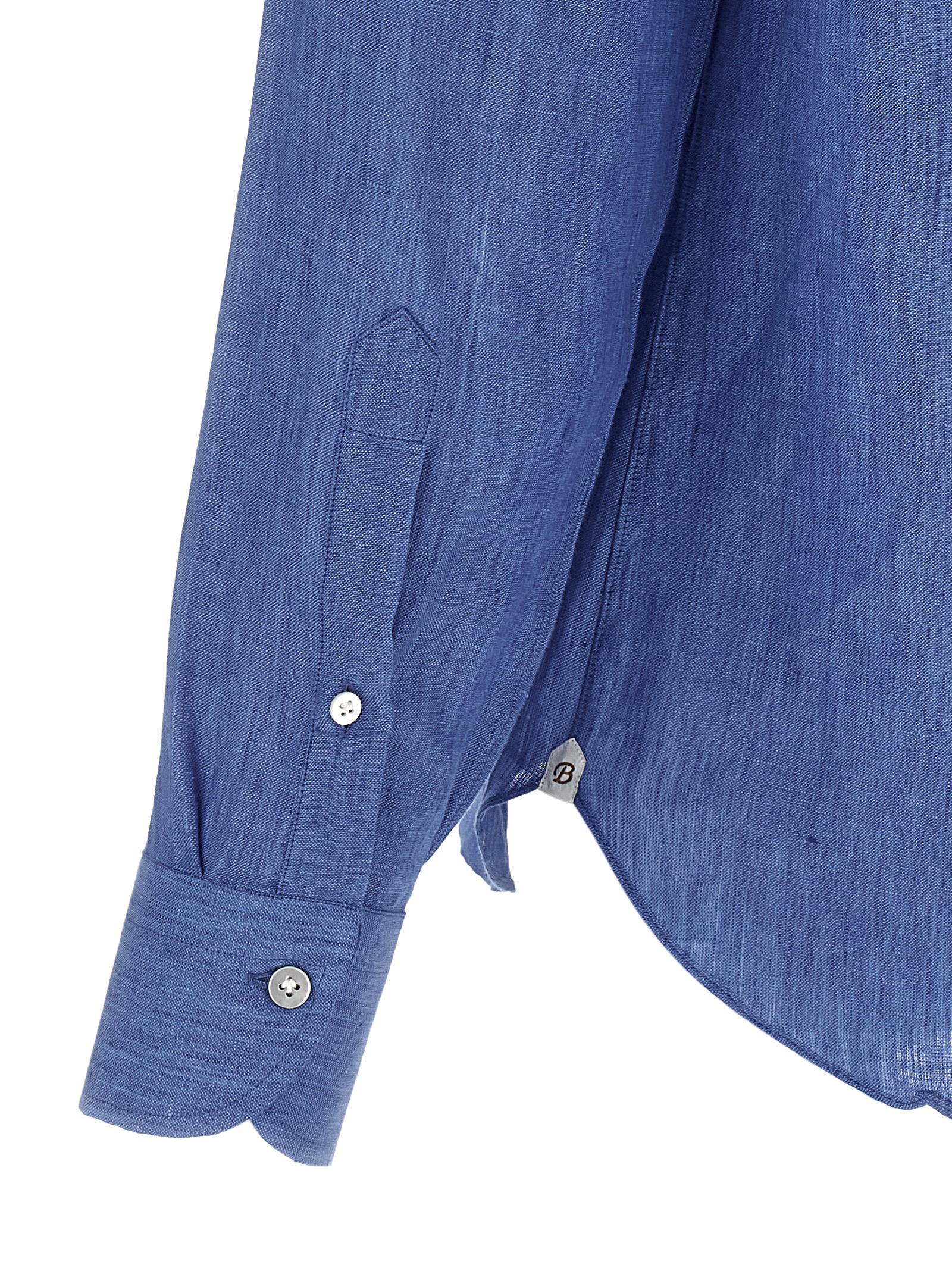 Hand-stitched light linen shirt, Nigel collar, front mother-of-pearl button closure, long cuffed sleeves, rounded hem.