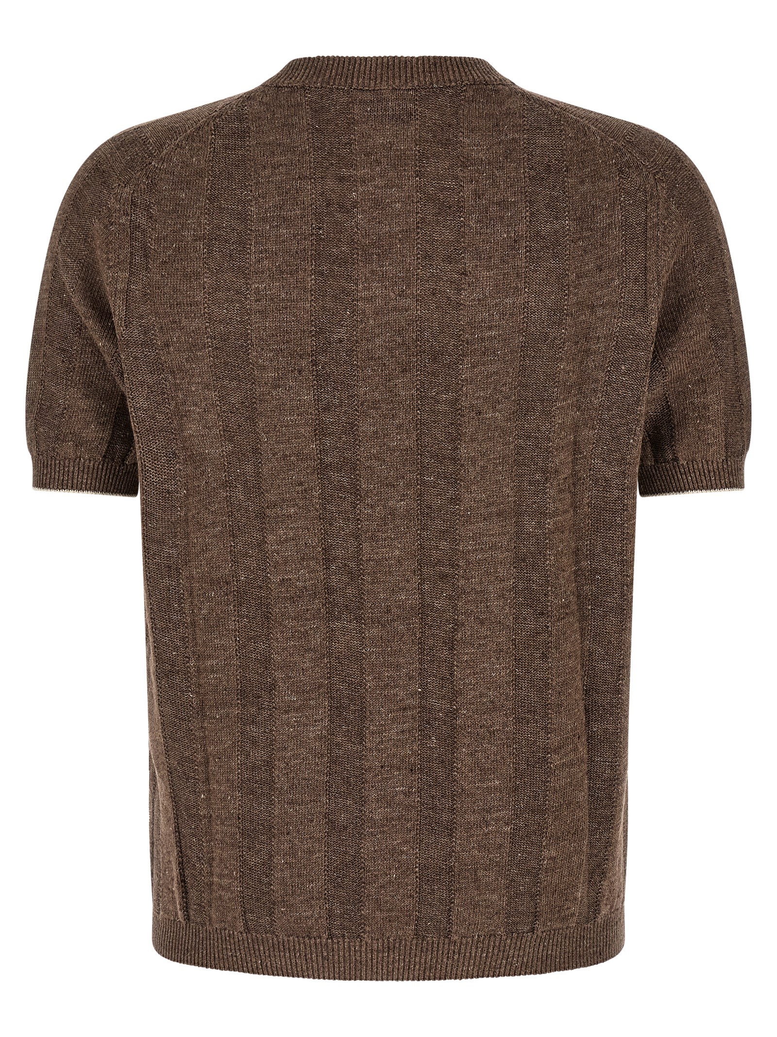 Linen and cotton blend sweater, vertical ribbed pattern, natural effect melange thread, crew neck, short sleeves with contrasting trim detail, ribbed hem and collar.