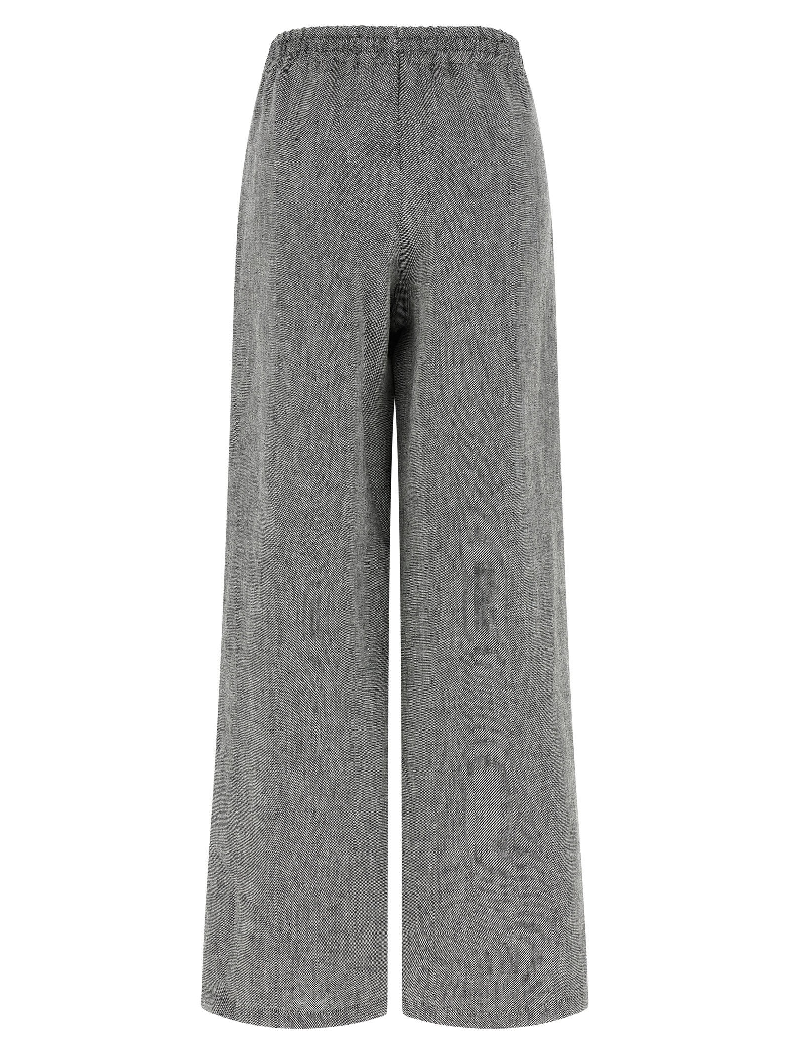 Linen trousers, straight leg style with elastic waistband and adjustable drawstring, vertical side pockets.