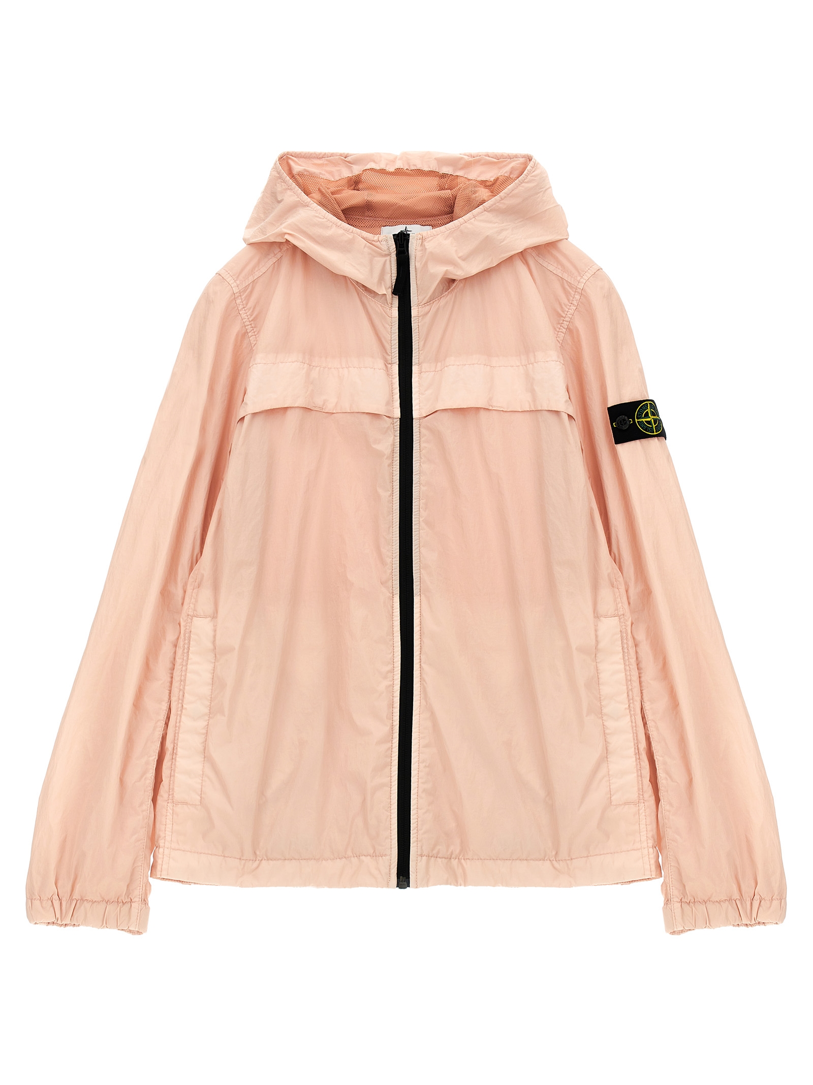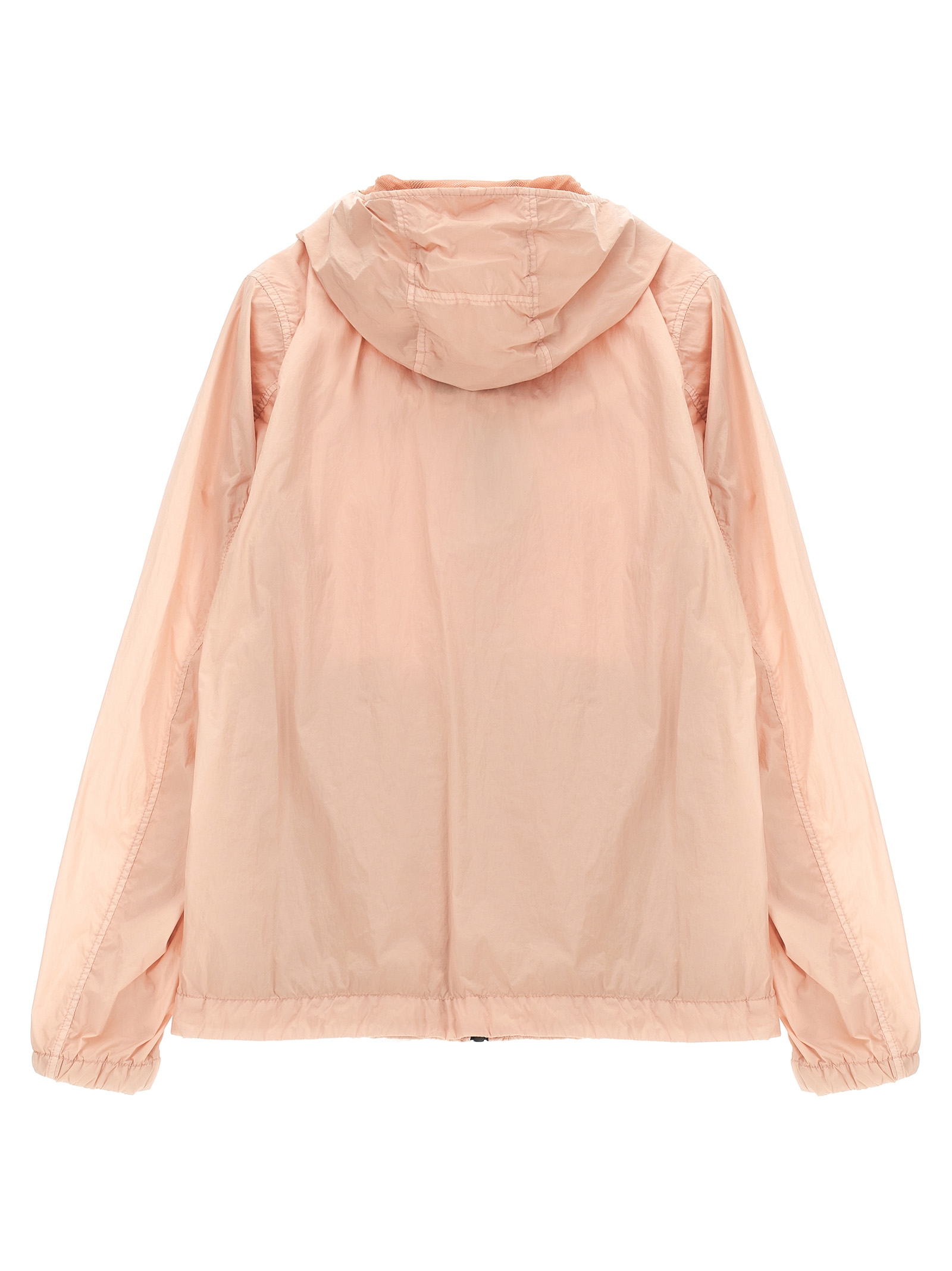 Nylon hooded jacket with openwork lining, zip closure, pockets, long cuffed sleeves and a logo badge.