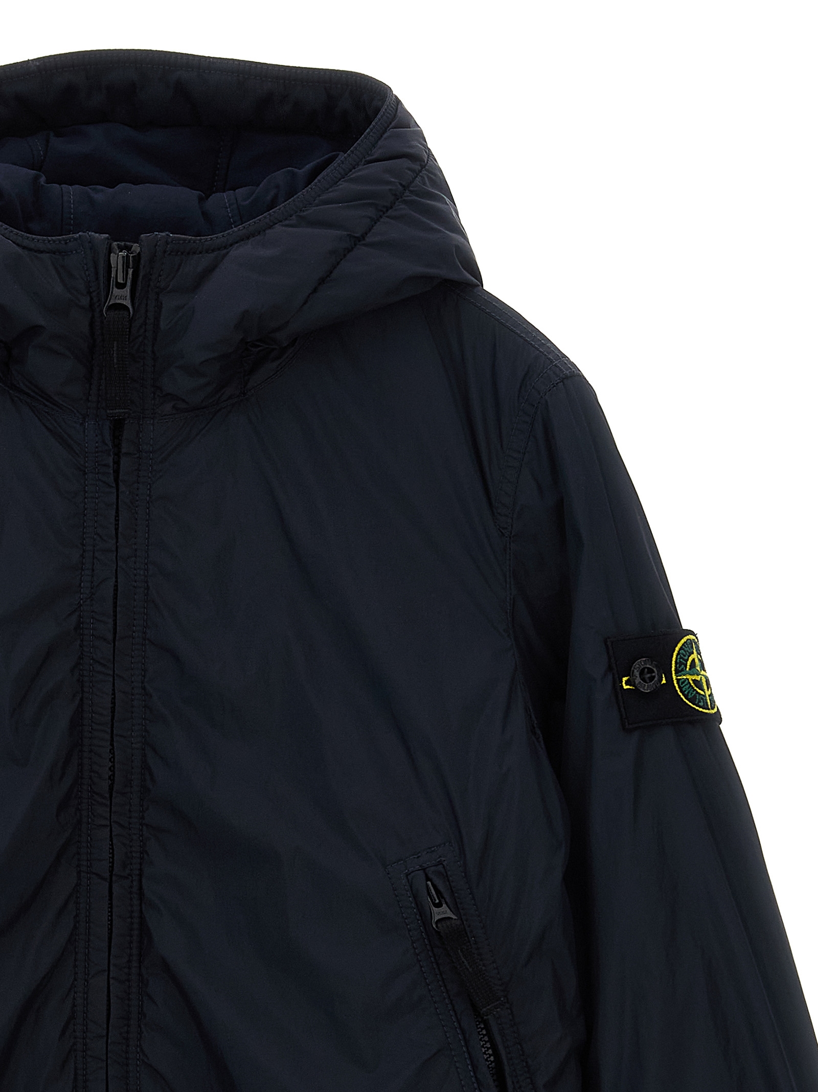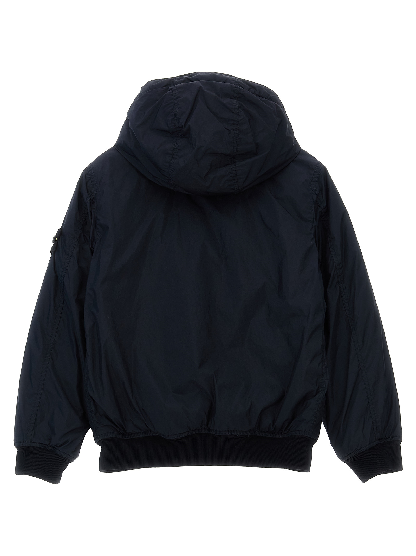 Lightly padded synthetic fabric jacket with stretch knit details, hood, front zip closure, pockets, long sleeves with elastic cuffs and logo badge.