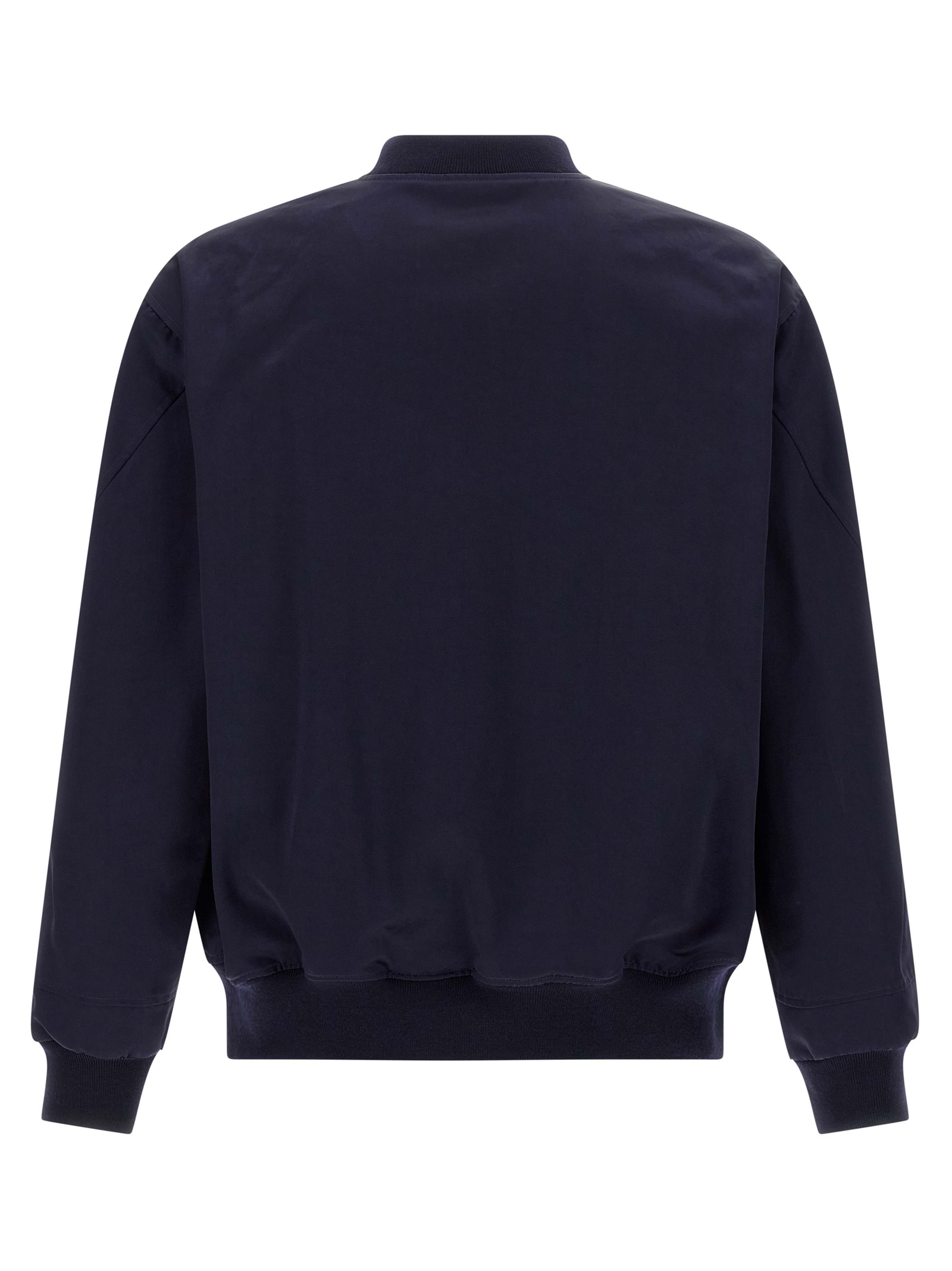 Satin bomber jacket, contrasting front logo patch, front zip closure, ribbed knit collar and hem, long cuffed sleeves.
