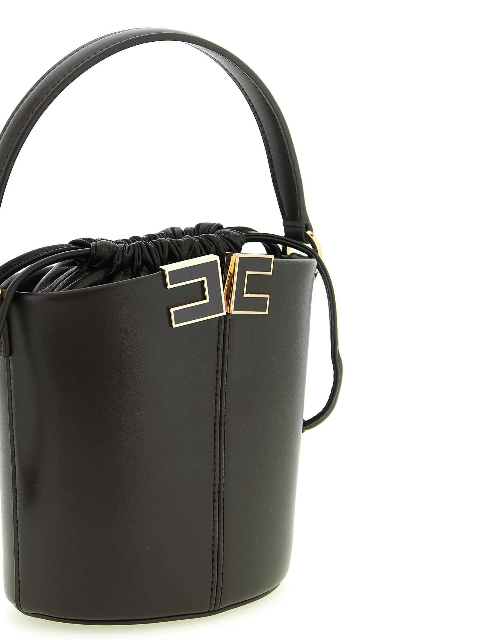 Leather bucket bag, rigid structure, tone-on-tone nappa leather insert with drawstring closure, fixed handle, front enameled metal logo, back embossed logo, removable chain shoulder strap.